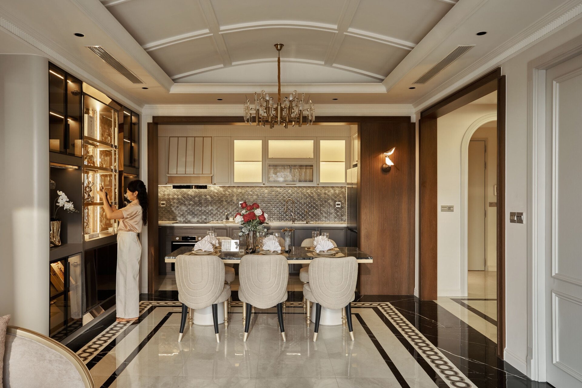 Phòng bếp là sự hòa quyện giữa thẩm mỹ và công năng. Tủ bếp trắng sáng bóng, mặt đá marble và vách mosaic vảy cá bạc lấp lánh gợi nhớ đến biển cả – một niềm yêu thích sâu đậm của gia chủ. Ánh sáng LED dịu nhẹ cùng tay nắm mạ vàng tạo nên không gian vừa ấm áp vừa tiện nghi, lý tưởng cho những bữa ăn được chuẩn bị với tất cả tâm huyết.