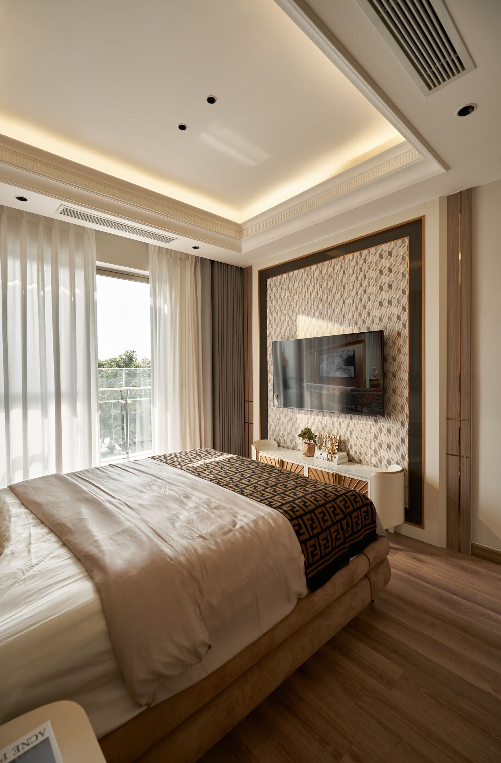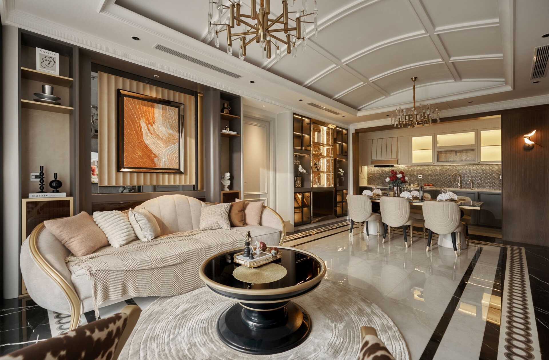 Phòng khách của Éclat là nơi cổ điển và hiện đại đan xen một cách tự nhiên. Bộ sofa nhung be mềm mại ôm trọn không gian, điểm xuyết bởi gối lụa pastel nhẹ nhàng. Trên tường, bức tranh kết cấu nổi với tông cam đất ánh kim hòa quyện cùng viền đồng của bàn trà, tạo sự liên kết màu sắc đầy tinh tế. Ánh sáng từ cửa kính lớn tràn vào, phủ qua rèm voan trắng mỏng, mang đến cảm giác thoáng đãng như hòa mình vào thiên nhiên.