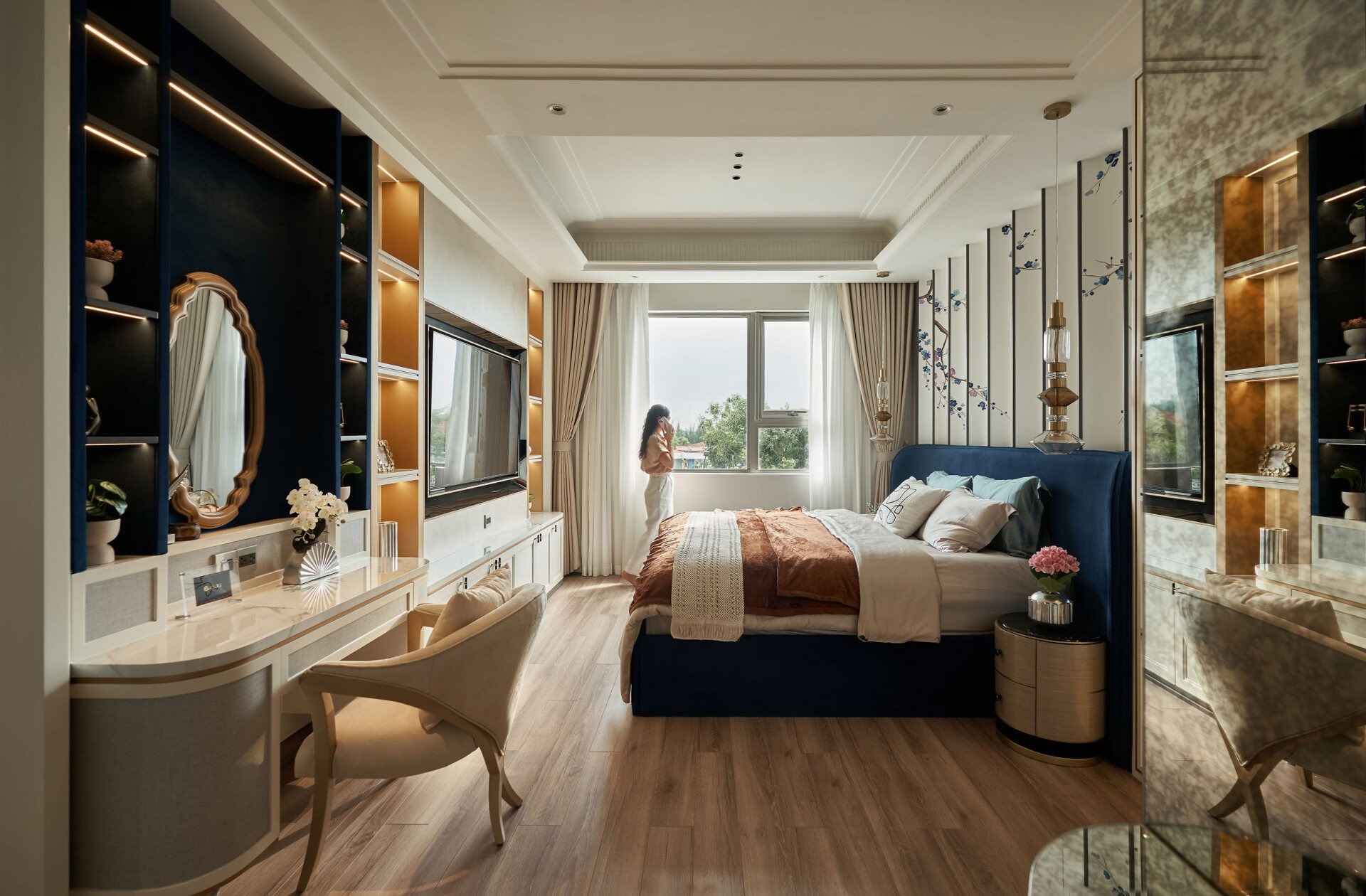 Phòng ngủ chính mang sắc xanh dương sâu lắng hòa cùng tông cam ấm áp, gợi hình ảnh biển cả dưới ánh hoàng hôn. Những cành hoa tươi trên vách trắng mang hơi thở thiên nhiên vào không gian, trong khi đầu giường bo tròn mềm mại và họa tiết sóng biển uốn lượn khơi gợi cảm hứng sáng tạo. Đây là chốn nghỉ ngơi thư giãn, đồng thời tiếp thêm năng lượng cho gia chủ.