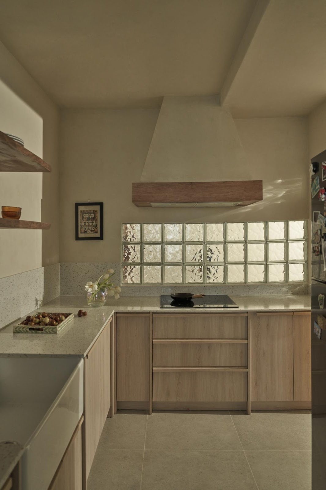 Điểm nhấn của không gian sống chính là căn bếp – nơi được ví như “lò sưởi tinh thần” của gia đình. Với mong muốn giữ lại hơi ấm sum vầy trong từng bữa ăn, thiết kế đã khéo léo tạo nên một bức tường phân khu độc đáo, nhấn bằng chụp hút khói thô mộc cùng những mảng gạch thủy tinh xuyên sáng. Ánh sáng biến đổi theo từng khoảnh khắc trong ngày, tạo nên những hoa văn lấp lánh, mang đến nét sinh động bất ngờ. Một góc nhỏ dành riêng cho niềm đam mê cà phê của gia chủ cũng được bố trí tinh tế, biến căn bếp trở thành không gian đầy cảm hứng cho những buổi sáng nhẹ nhàng hay những ngày làm việc tại nhà tràn ngập sáng tạo.