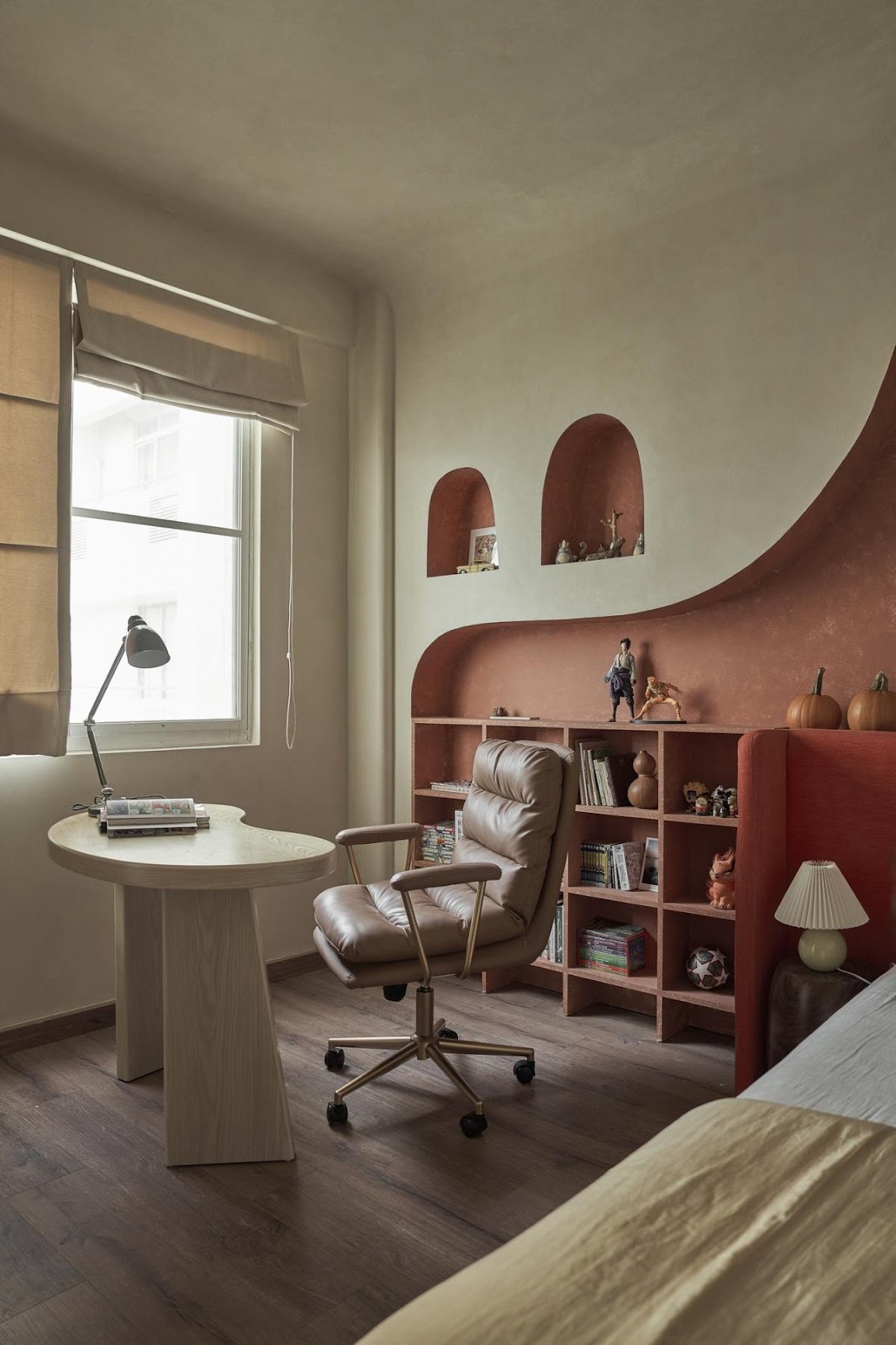 Phòng ngủ con là một dấu ấn thú vị khác trong tổng thể không gian. Những hốc tường được thiết kế tinh tế, kết hợp cùng sắc đất nung Terracotta ấm áp, tạo nên một cảm giác dễ chịu và thư thái. Ánh sáng tự nhiên từ cửa sổ lớn kết hợp với nội thất xinh xắn giúp căn phòng mang trọn vẹn tinh thần Địa Trung Hải – sống động nhưng không phô trương, tinh tế mà vẫn đầy ấm áp.