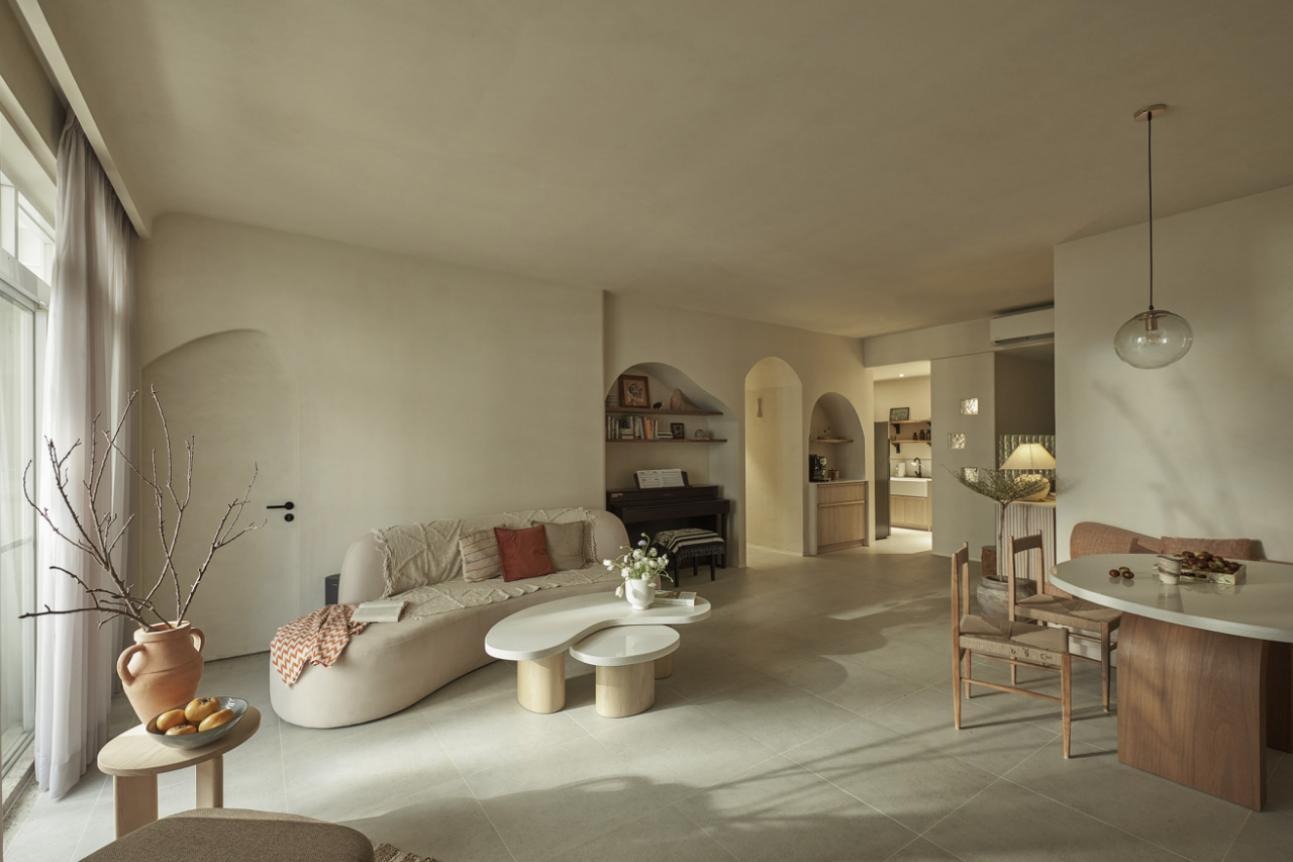 Ngay từ khi nhận căn hộ, gia chủ – những người đã bước vào độ tuổi trung niên nhưng vẫn tràn đầy đam mê khám phá – đã đặt ra một bài toán thú vị cho nhà thiết kế. Họ mong muốn tổ ấm của mình không chỉ là nơi dừng chân sau những chuyến đi mà còn là không gian lưu giữ tinh thần của những nền văn hóa họ từng trải nghiệm. Đơn giản, mộc mạc nhưng vẫn phóng khoáng và tinh tế – đó là những giá trị cốt lõi được gửi gắm vào từng đường nét thiết kế. Từ niềm yêu thích khám phá nghệ thuật, ẩm thực và văn hóa của nhiều vùng đất trải dài từ Á sang Âu, đến Trung Đông và cả châu Mỹ, phong cách Địa Trung Hải đã được lựa chọn. Đây không chỉ là một phong cách kiến trúc, mà còn là biểu trưng của sự thư thái, tự do – nơi ánh nắng chan hòa, làn gió biển mơn man gợi nhắc về những miền đất xa xôi, giúp gia chủ sau mỗi chuyến hành trình có thể tìm về góc sống của riêng mình trong sự tĩnh tại và an nhiên.