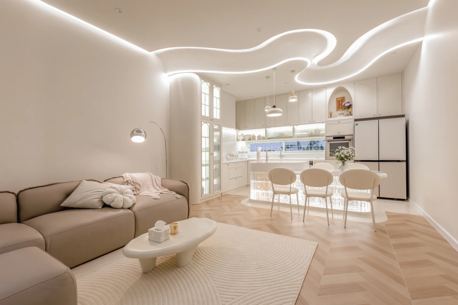 Phòng khách rộng rãi kết hợp với khu vực bếp mở tạo thành một không gian giao lưu lý tưởng cho các thành viên trong gia đình. Khu vườn nhỏ hoặc ban công xanh mát cũng được xem như nơi nghỉ ngơi lý tưởng, giúp mang thiên nhiên vào trong từng hoạt động hàng ngày.