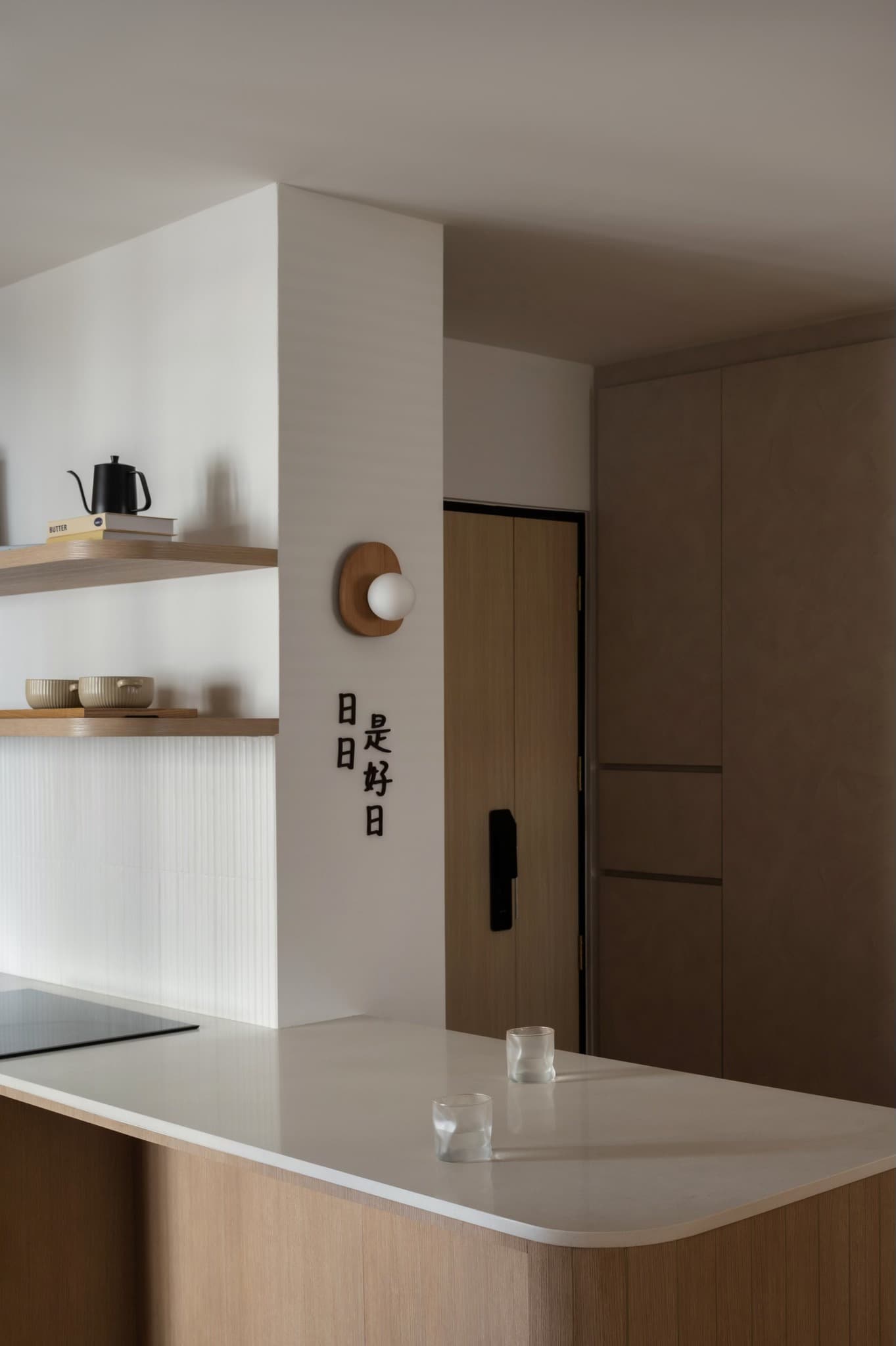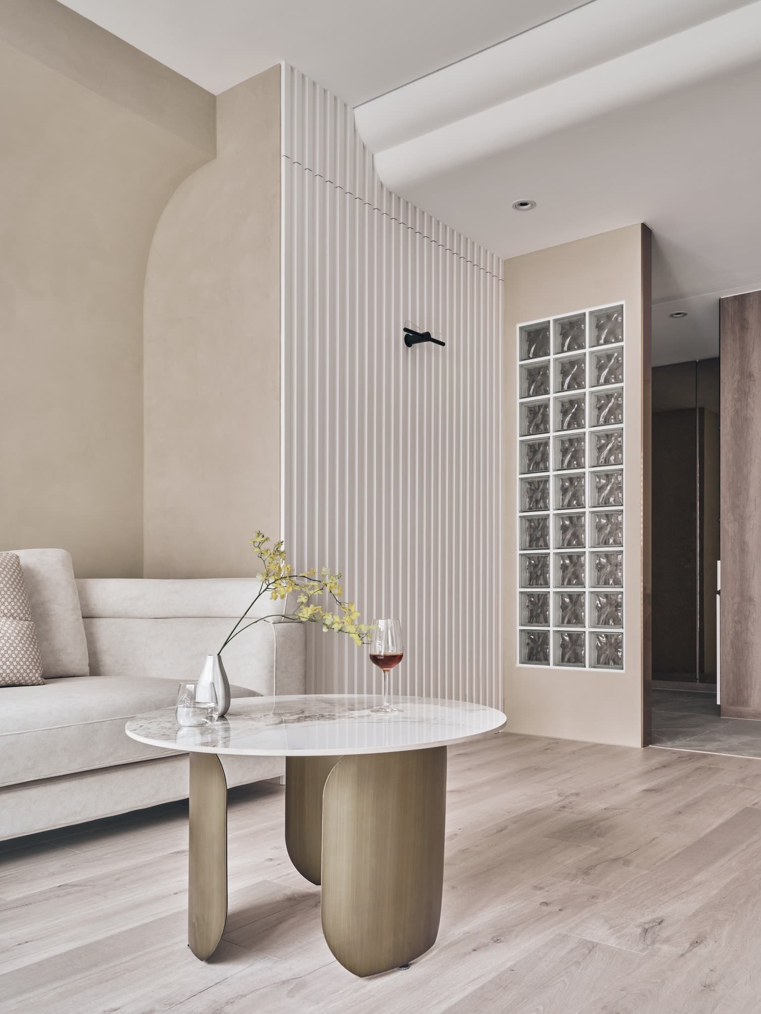 Điểm nhấn tự nhiên: Một vài mảng gỗ sồi sáng màu hoặc chi tiết kim loại mảnh mai giúp không gian có thêm sức sống nhưng vẫn giữ được tinh thần thanh khiết.