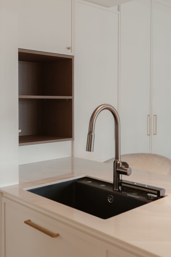 Hãy quan sát cách chúng được phân bổ theo dòng chảy sinh hoạt: một chiếc được đặt tinh tế ngay sát khu vực bàn ăn, đóng vai trò như trạm vệ sinh thuận tiện cho gia chủ và khách khứa rửa tay trước mỗi bữa tiệc mà không cần chen chúc vào khu nấu nướng. Chiếc thứ hai giữ vai trò “nhạc trưởng” tại trung tâm bếp, chuyên trách các tác vụ sơ chế thực phẩm và dọn rửa hằng ngày. Và bất ngờ nhất là chiếc thứ ba, được bố trí khéo léo tại khu vực giặt là (laundry) liền kề, chuyên dùng để xử lý những món đồ vải vóc mỏng manh hay thậm chí là vệ sinh giày dép riêng biệt. Đây chính là minh chứng thuyết phục nhất cho thấy thiết kế thông minh không chỉ dừng lại ở sự mãn nhãn về thị giác, mà cốt lõi nằm ở việc kiến tạo nên một không gian sống thực sự thấu hiểu và phục vụ tối đa cho những nhu cầu thiết thực nhất của con người.