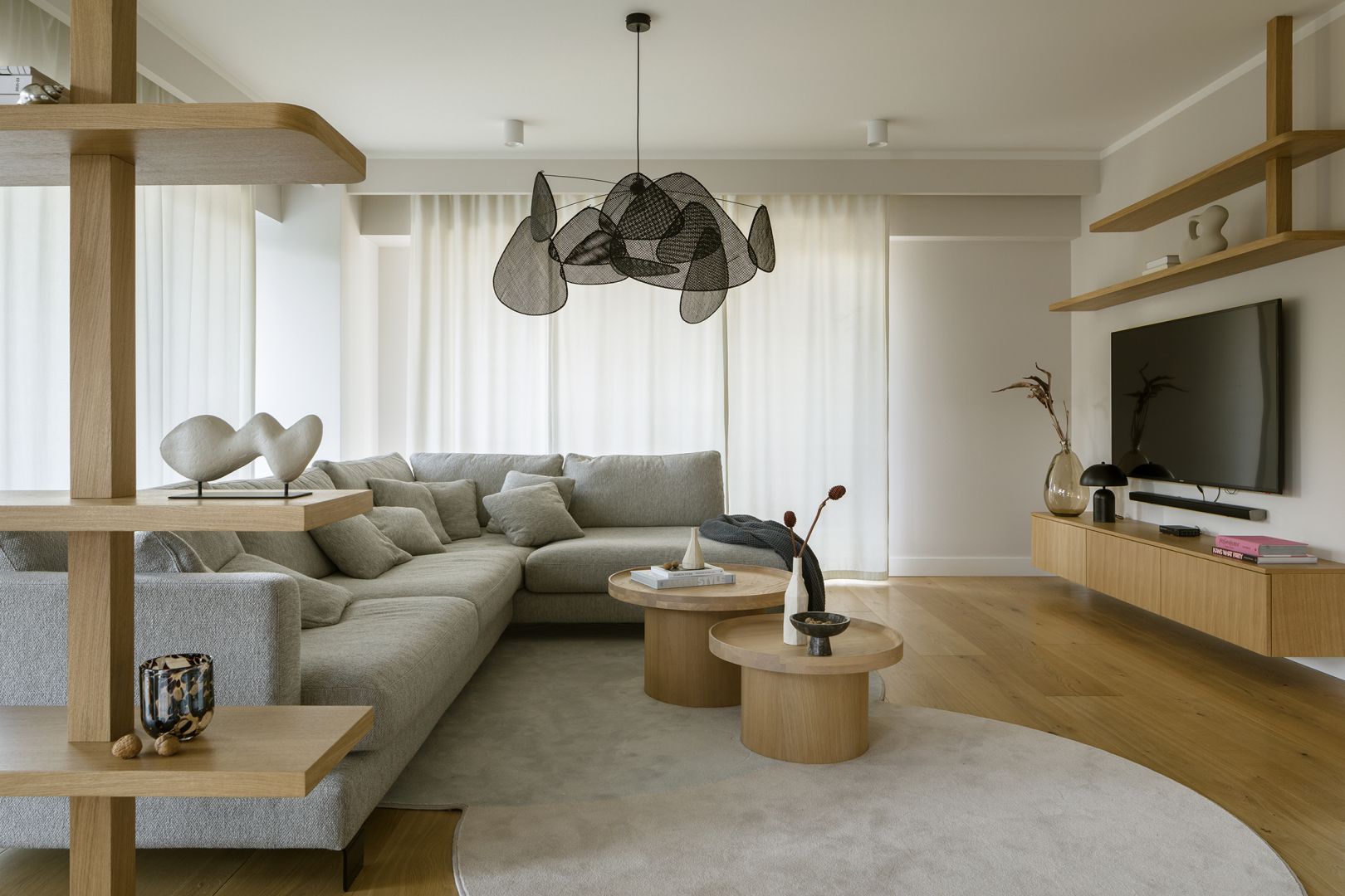 Thay vì những góc cạnh dứt khoát, căn hộ ưu tiên các phom dáng mềm mại trong thiết kế nội thất rời. Từ ghế sofa đến các chi tiết bo cong của tủ kệ, tất cả đều hướng tới sự thoải mái và an toàn về mặt thị giác. Sự kết hợp giữa đường nét hiện đại và chất liệu thô mộc tạo nên một tổng thể hài hòa, phản ánh gu thẩm mỹ sắc sảo của người sở hữu.