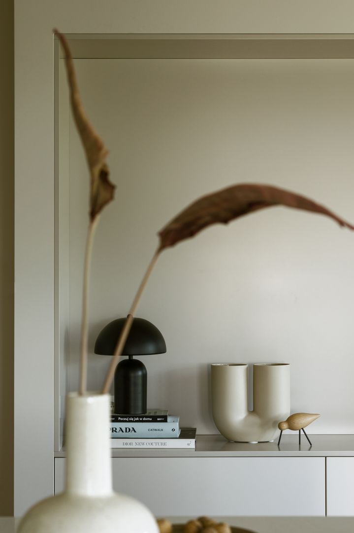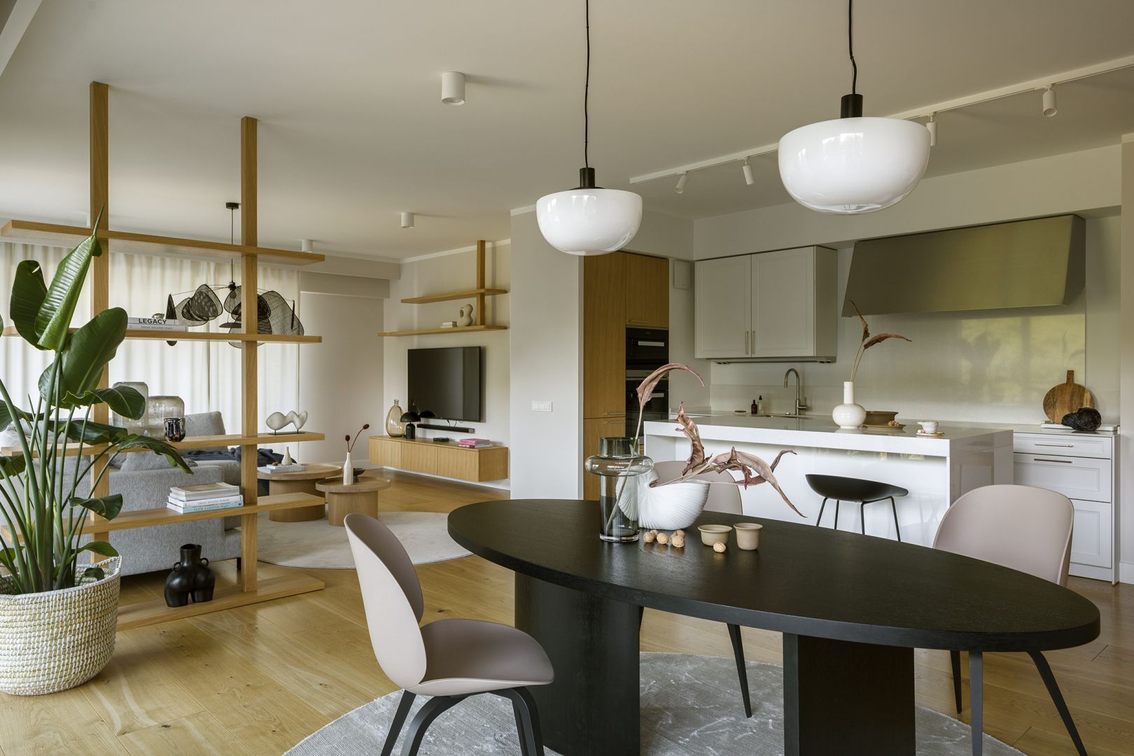Sự sang trọng của căn hộ được định hình từ bảng màu trung tính đầy tinh tế. Những sắc thái êm dịu của trắng kem (śmietankowa biel) và màu taupe (xám nâu) chiếm ưu thế chủ đạo, tạo nên một phông nền tĩnh lặng và thư thái.