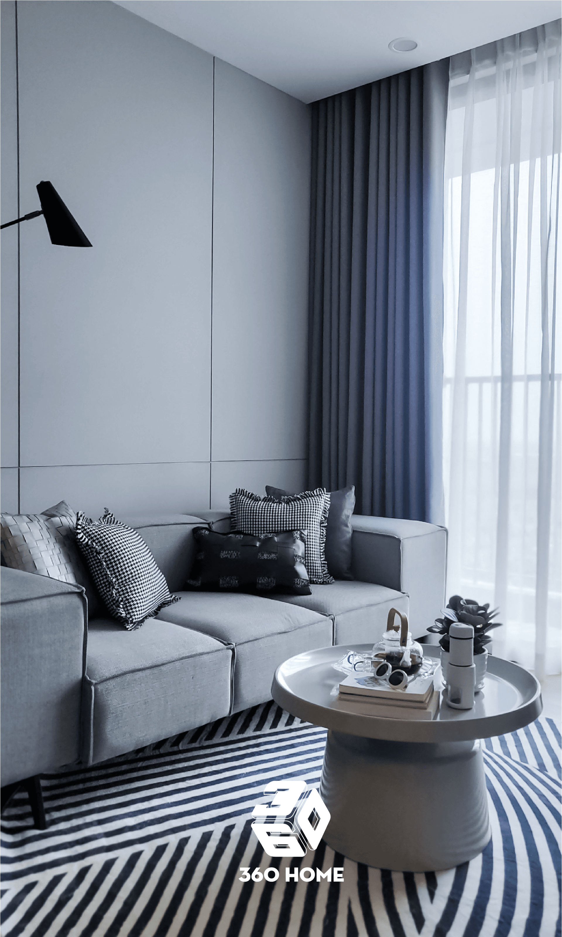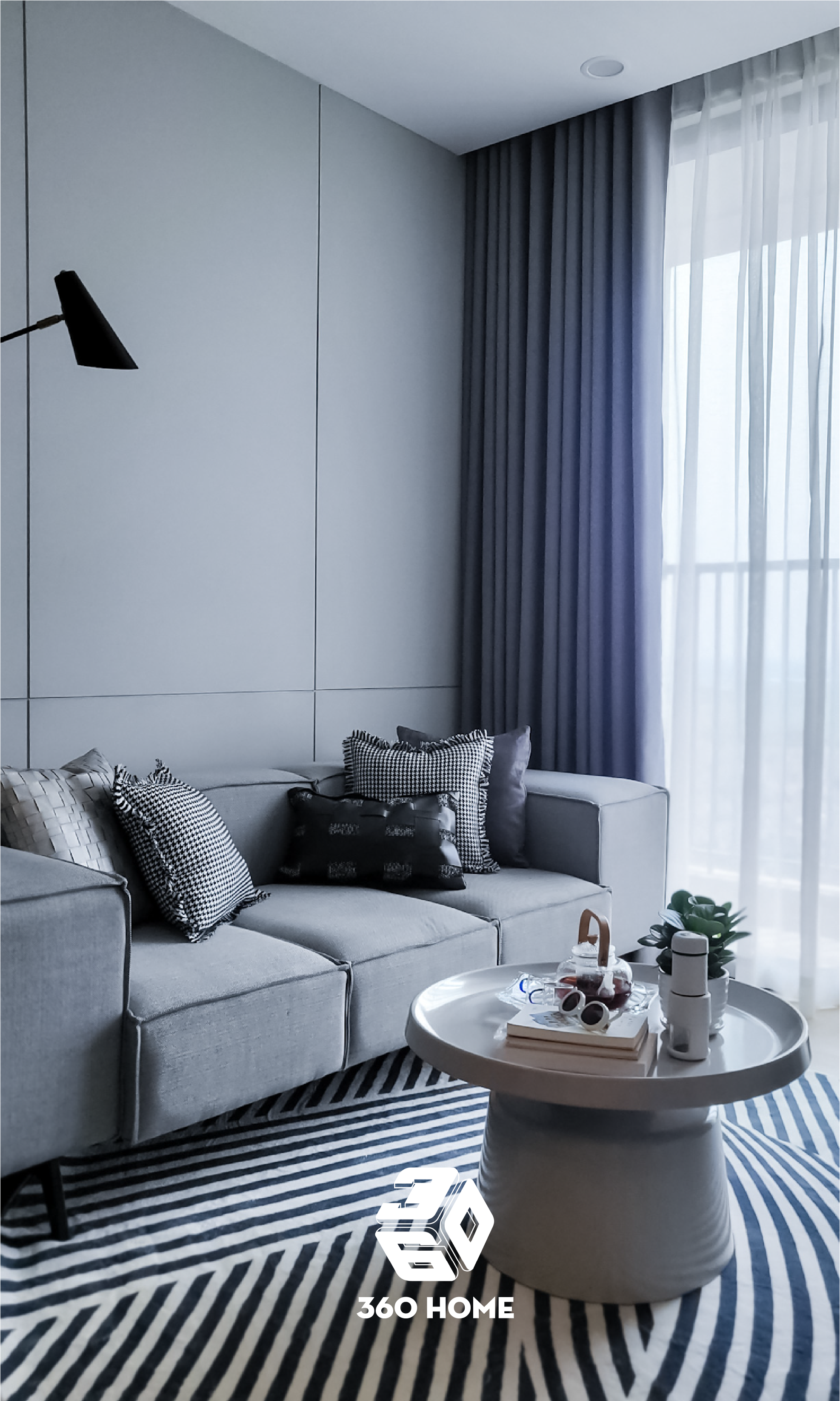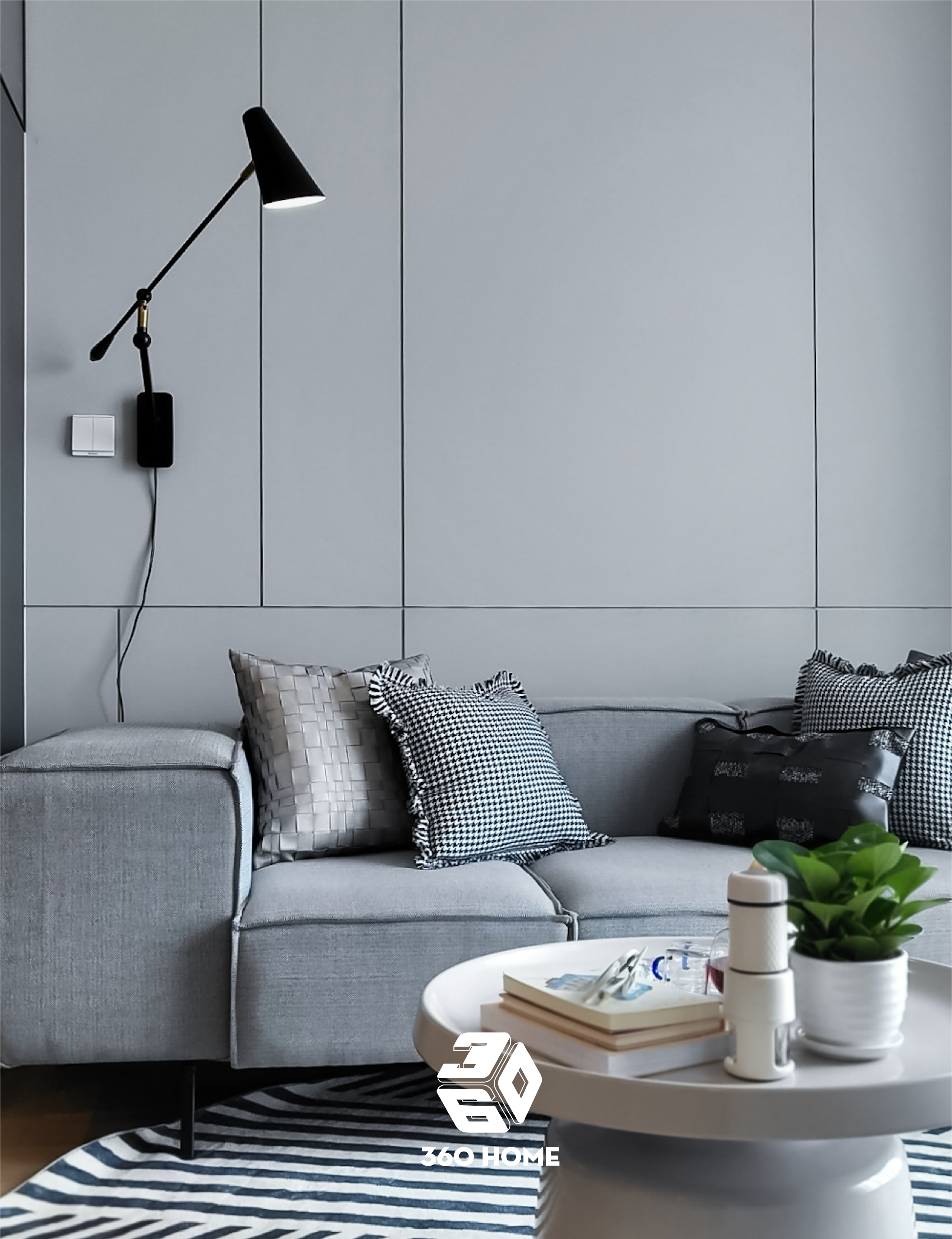 Trung tâm thu hút: Bộ sofa nệm màu xám ghi êm ái được trang trí nổi bật bởi gối tựa họa tiết răng sói (houndstooth) và kẻ ô đen trắng sành điệu.