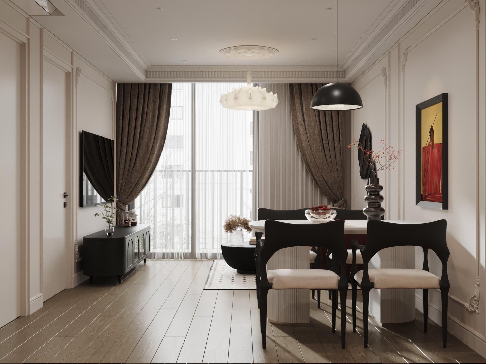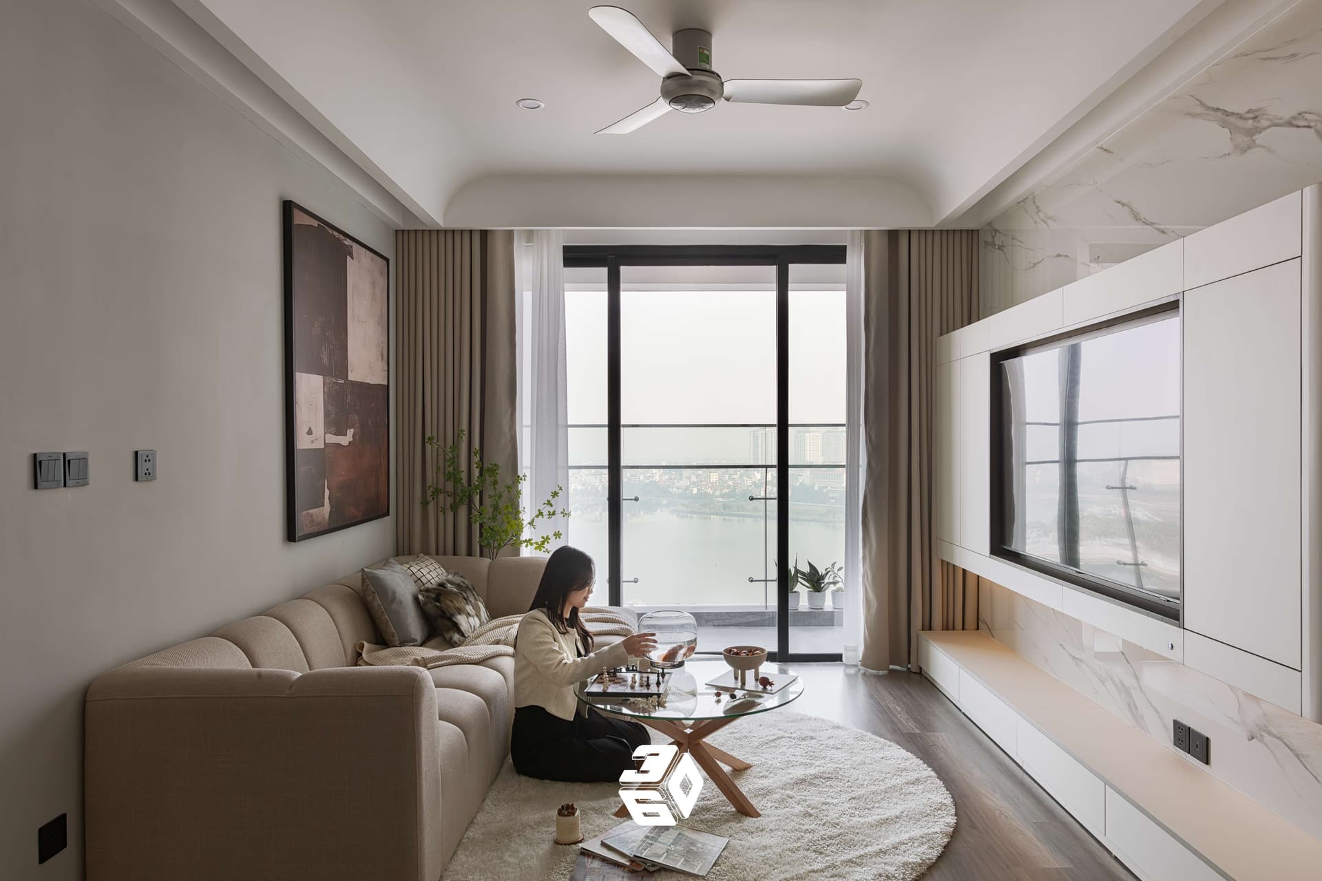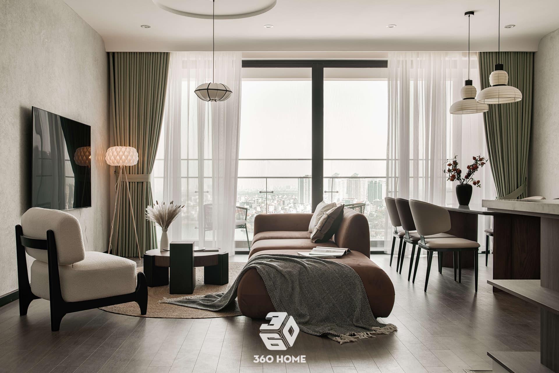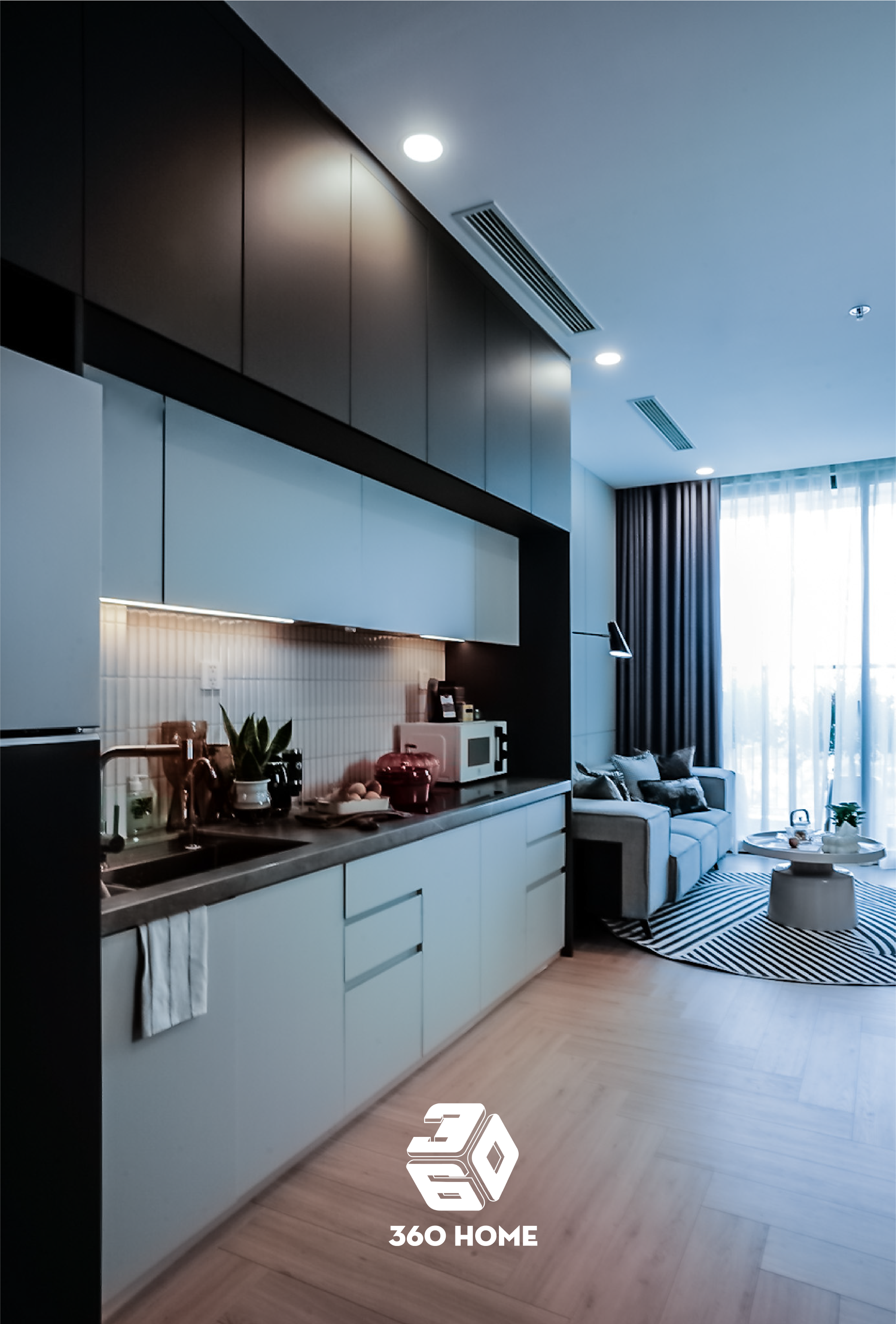 Khám phá không gian sống lý tưởng mang đậm dấu ấn của phong cách Hiện đại (Modern) pha trộn nét thanh lịch đặc trưng của Scandinavian. Căn hộ là bản hòa ca của bảng màu trung tính (xám ghi, trắng, đen) cùng sự ấm áp từ sàn gỗ lát xương cá, tạo nên sự cân bằng hoàn hảo giữa tính thẩm mỹ thời thượng và công năng tiện nghi.
