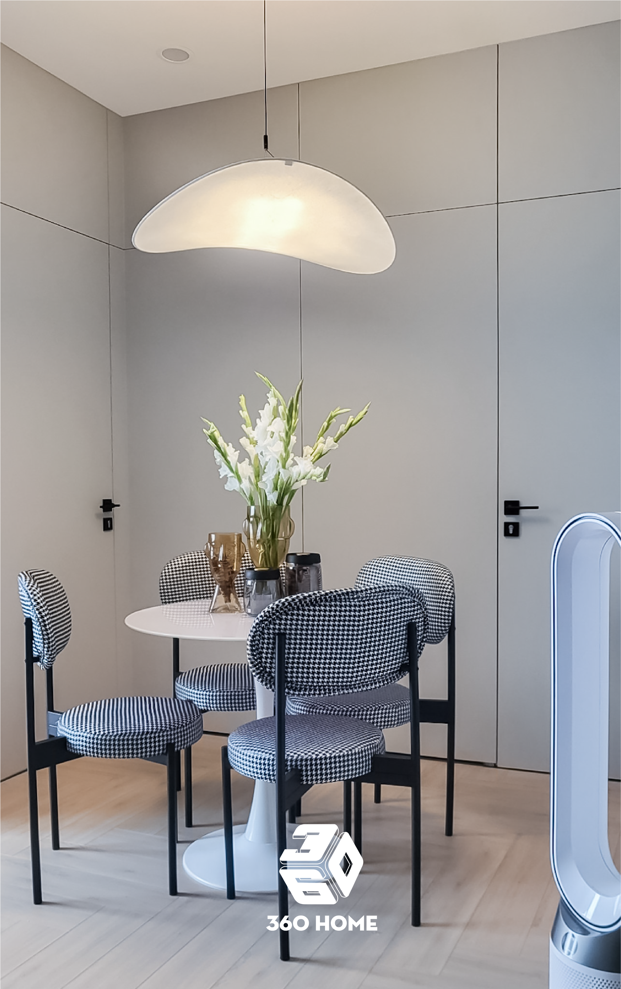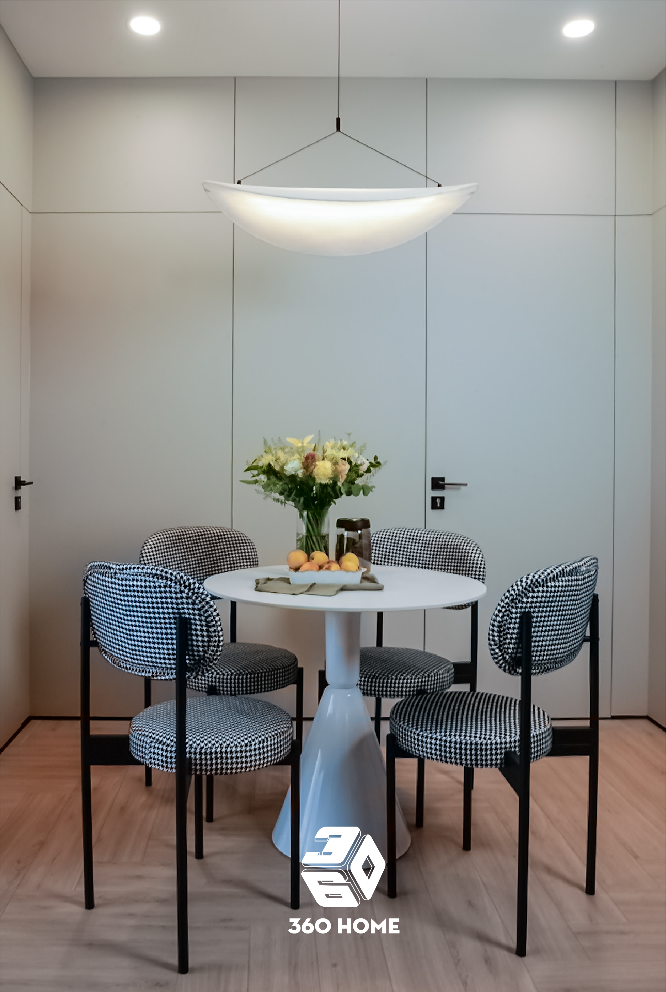 Nội thất đẳng cấp: Bộ ghế ăn bọc nỉ họa tiết houndstooth thời thượng bao quanh chiếc bàn tròn chân trụ trắng tinh khôi.