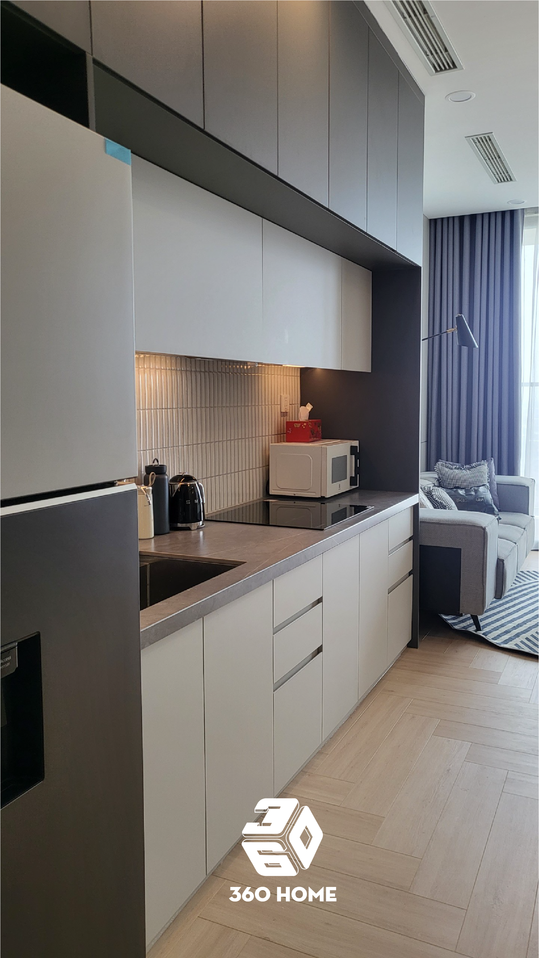 Hệ tủ bếp kịch trần: Bề mặt phẳng lì (matte) với tông màu xám đậm và trắng giúp không gian lưu trữ rộng rãi nhưng vẫn tinh tế.