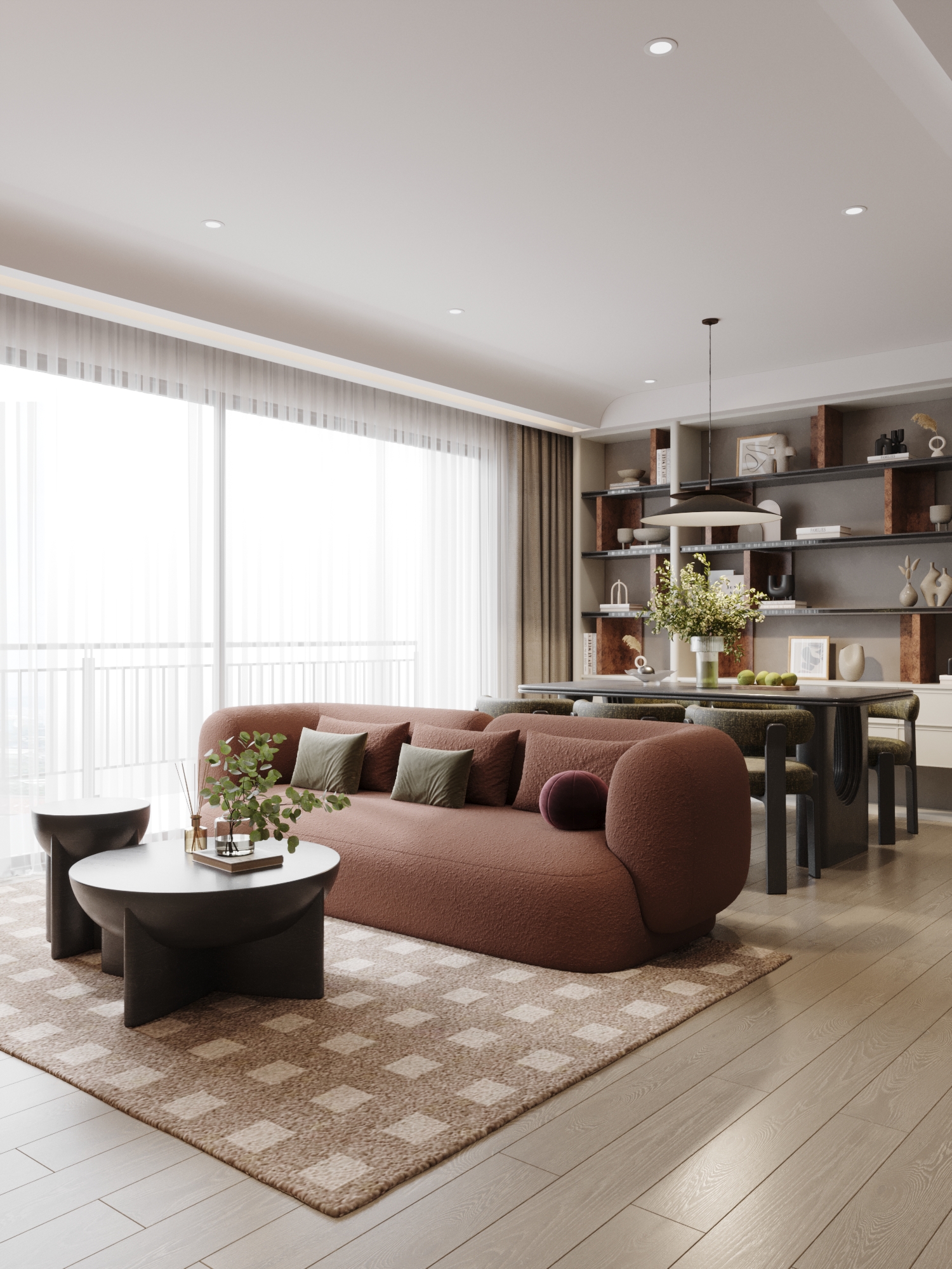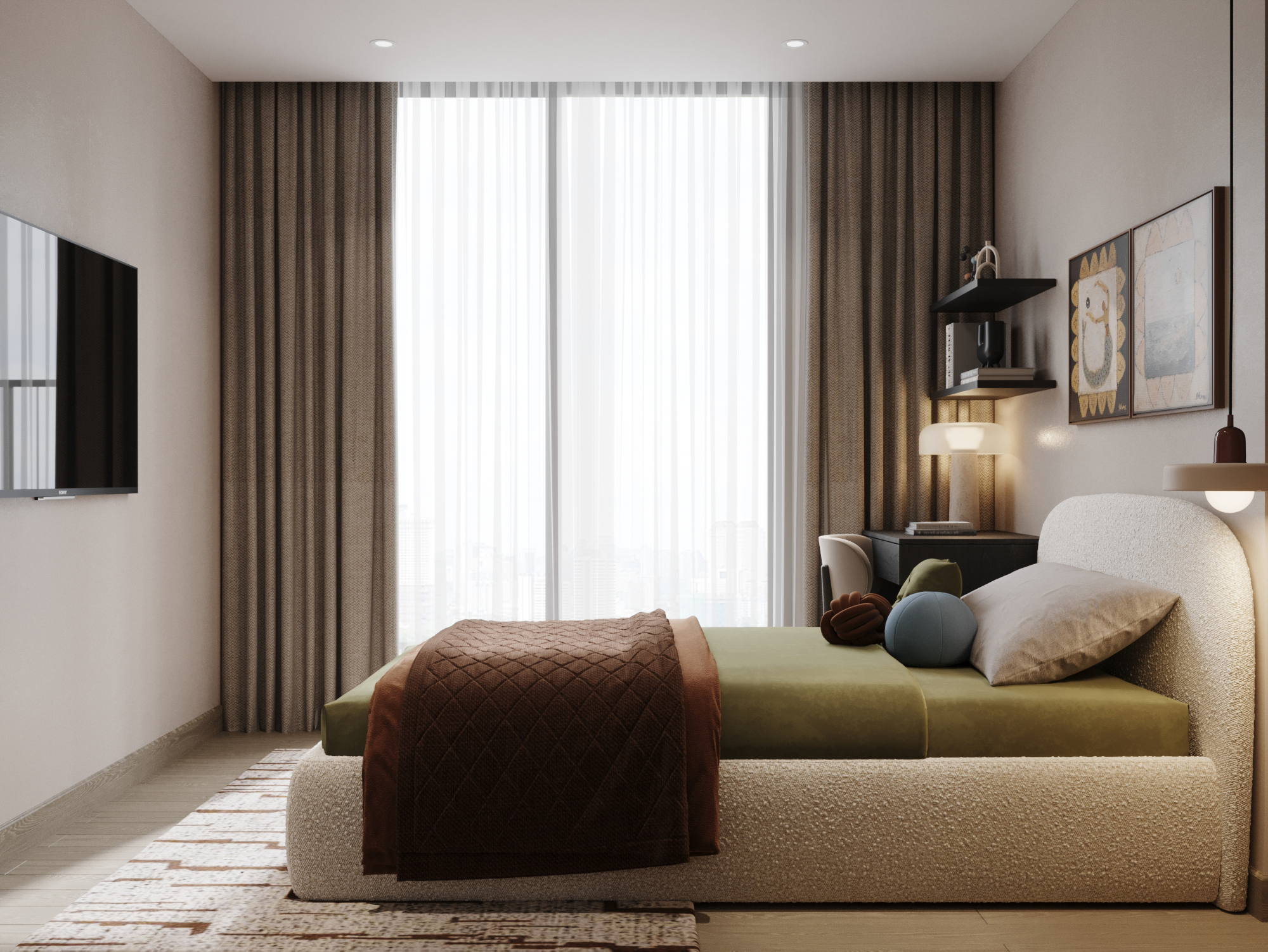Từ khóa: Thiết kế nội thất Contemporary, căn hộ tông màu trung tính ấm áp, sofa vải bouclé, thiết kế không gian tĩnh lặng, nội thất đương đại xanh rêu.
