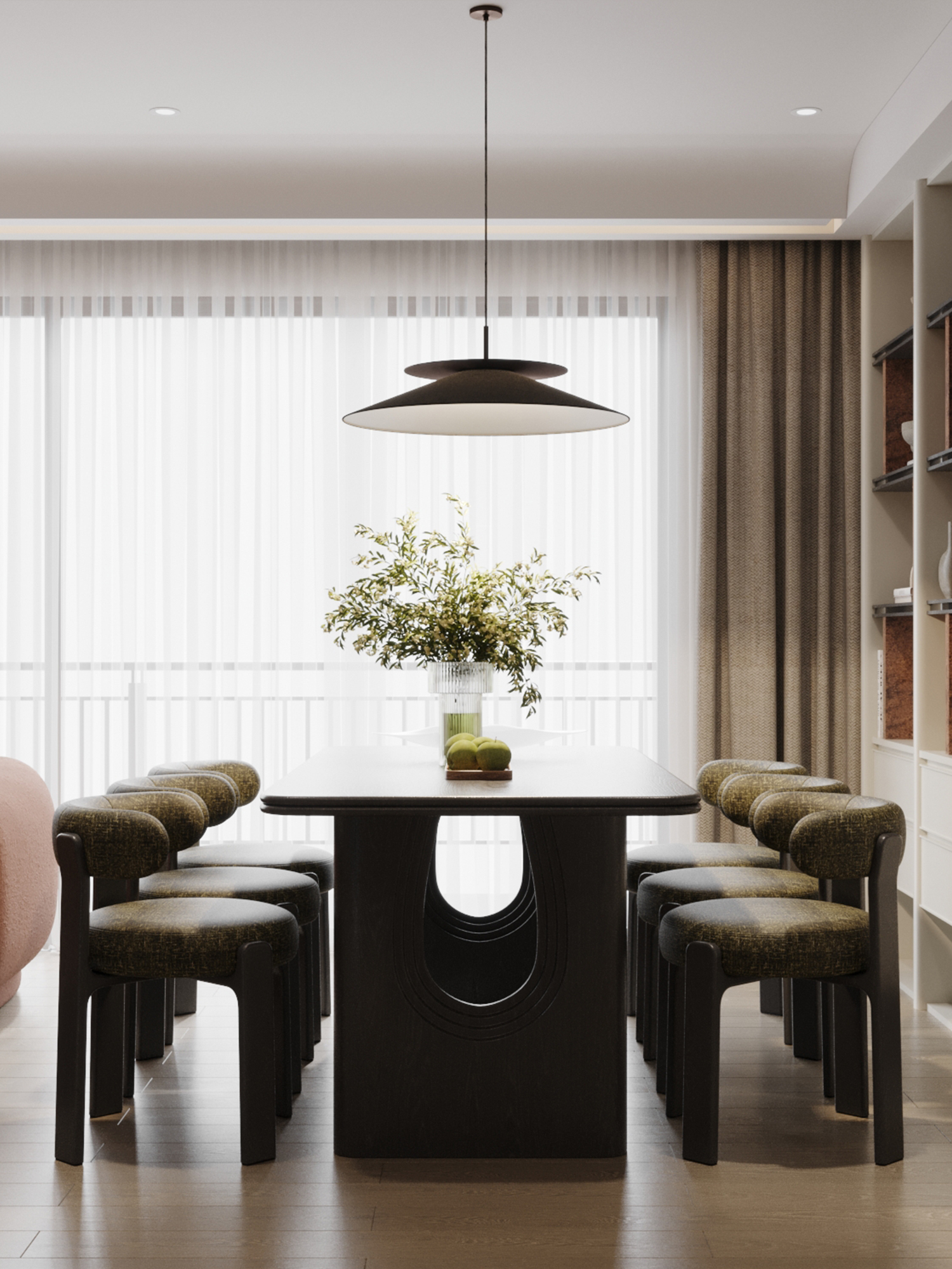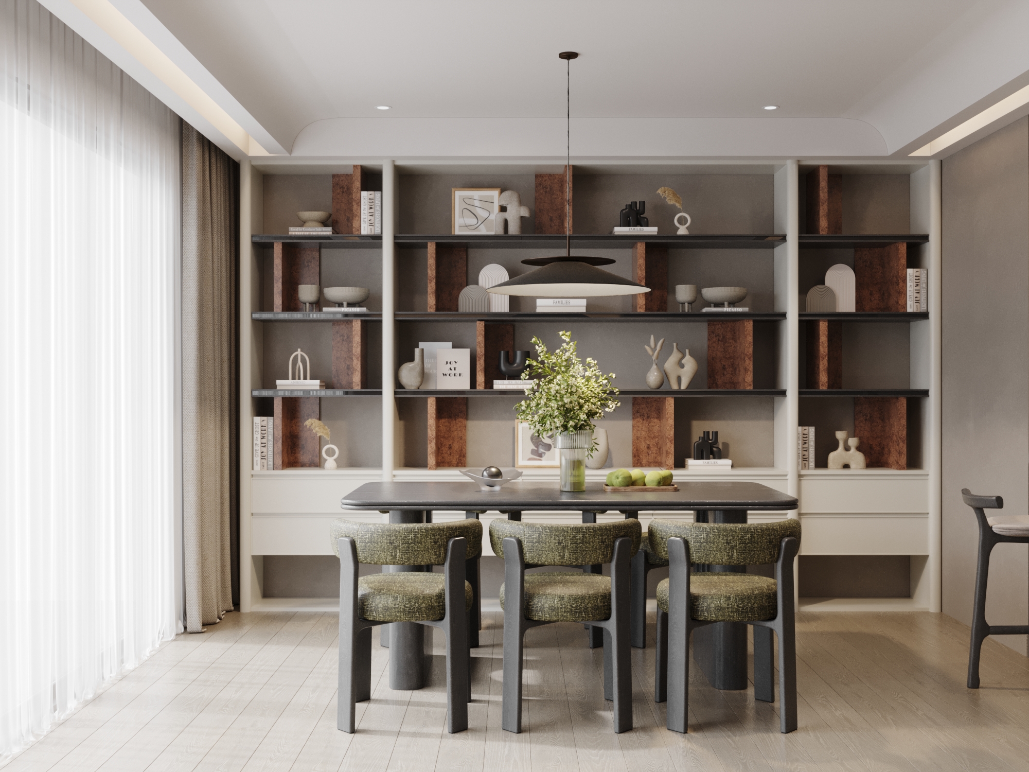 Sự chuyển tiếp từ khu vực nghỉ ngơi sang phòng ăn được xử lý qua sơ đồ mặt bằng mở, giúp ánh sáng và dòng khí luân chuyển tự do. Bộ bàn ăn gỗ đen tuyền kết hợp cùng ghế bọc vải xanh rêu tạo nên một sự đối lập mạnh mẽ nhưng sang trọng trên nền màu trung tính.