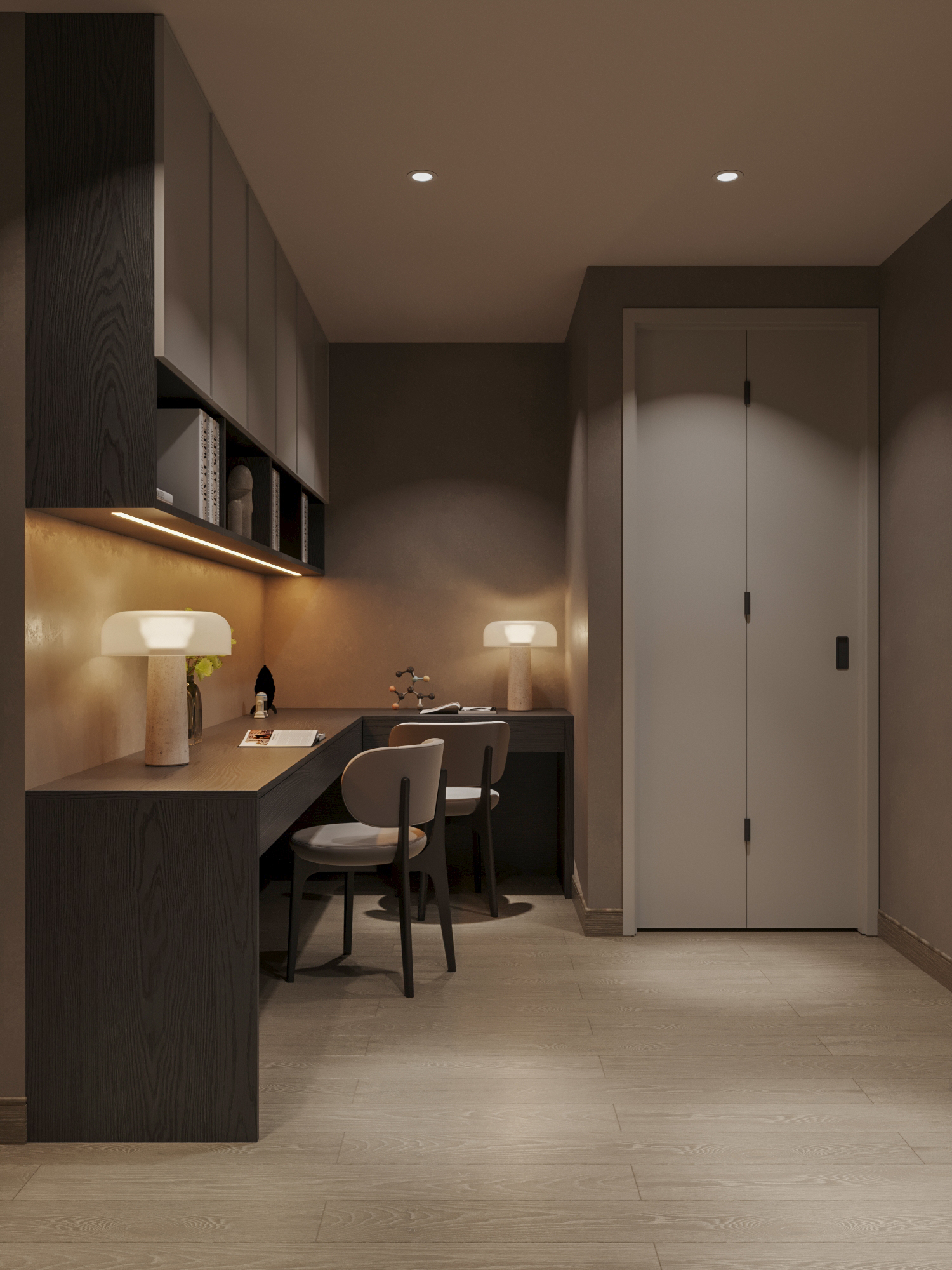 Góc làm việc: Bàn làm việc chữ L màu tối tận dụng tối đa góc chết của kiến trúc, kết hợp với hệ tủ treo sát trần tạo ra một môi trường làm việc chuyên nghiệp. Chiếc đèn để bàn hình nấm phát ra ánh sáng vàng ấm là chi tiết “mềm hóa” sự khô khan thường thấy của góc làm việc.