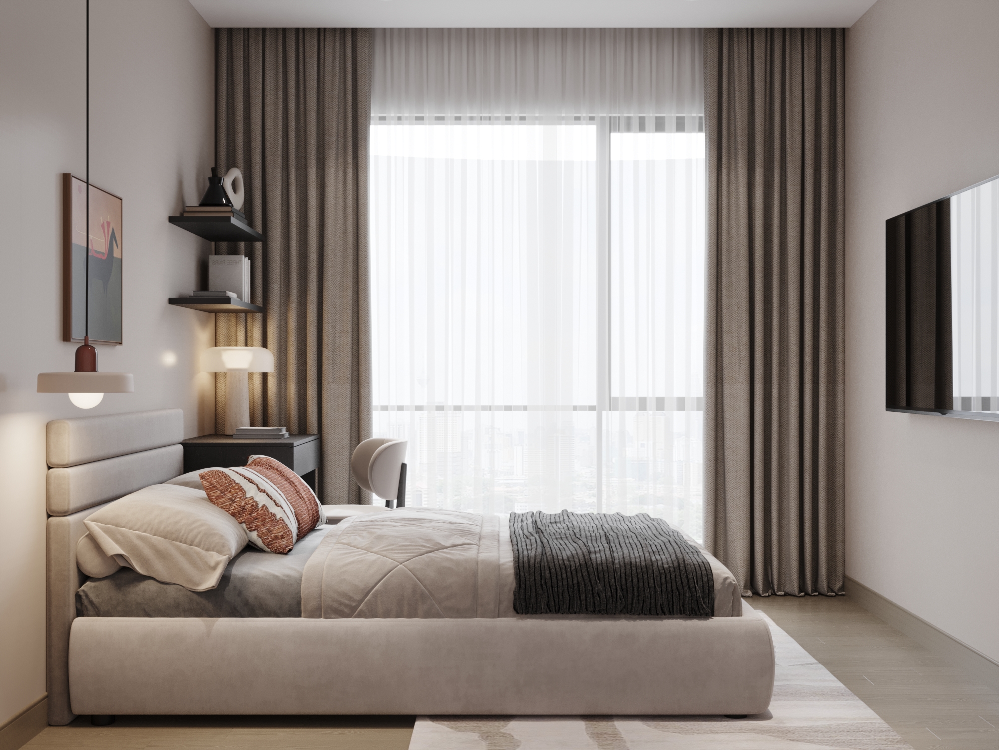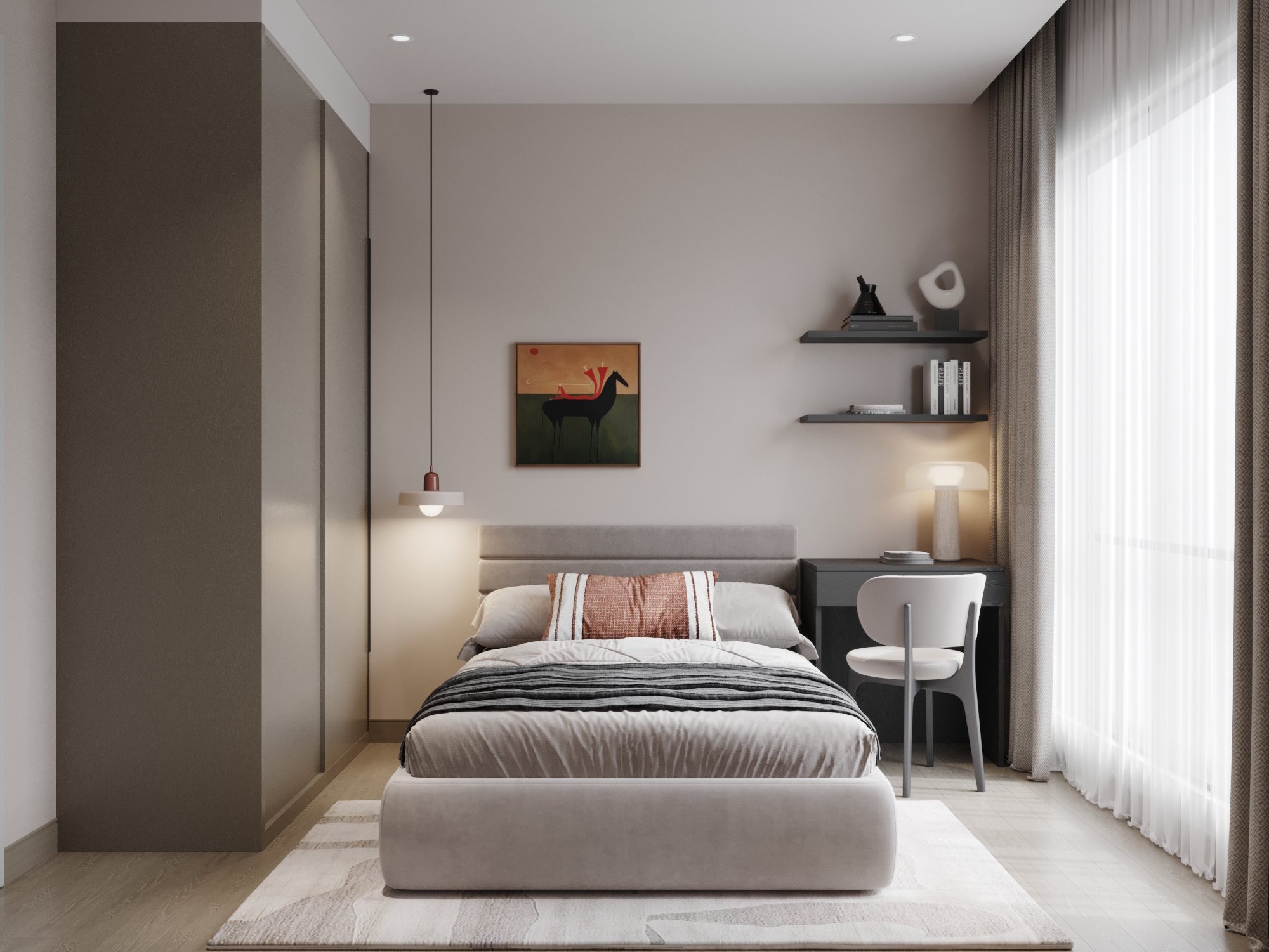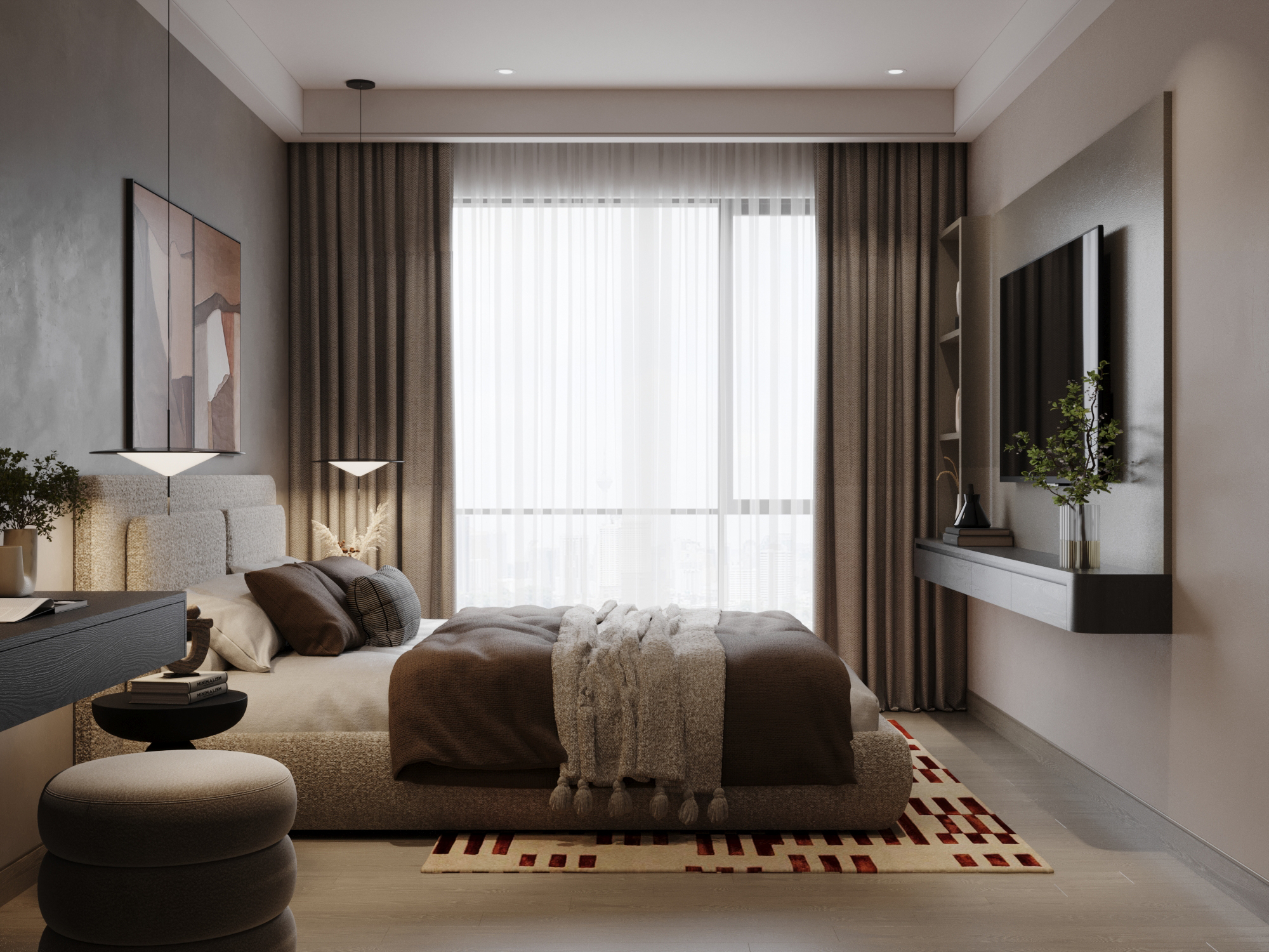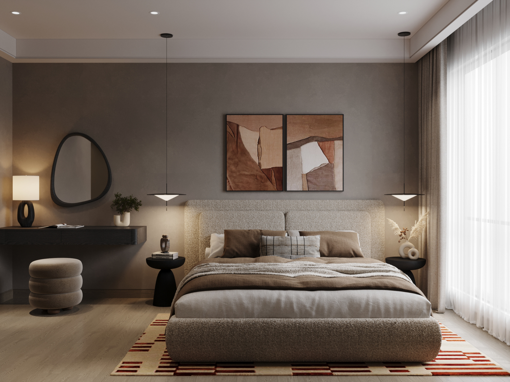 Phòng ngủ chính (Master): Sự sang trọng được định nghĩa qua cảm giác về xúc giác với giường bọc nệm lớn và bộ chăn ga tông màu nâu xám. Các chi tiết như tranh trừu tượng đối xứng và gương soi hình dáng tự do tại bàn trang điểm giúp phá vỡ sự đơn điệu, mang lại nét đương đại thời thượng.