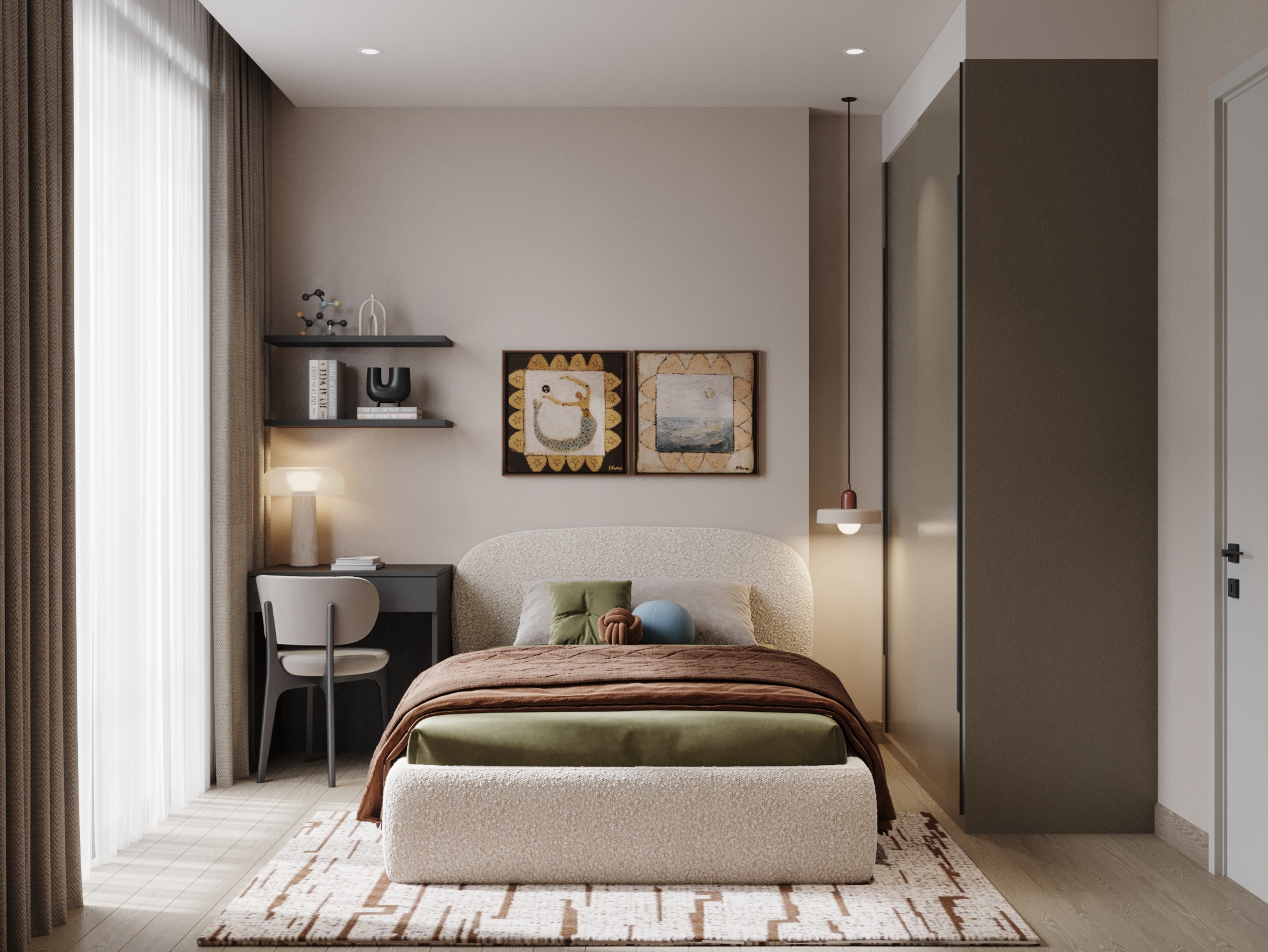 Phòng ngủ phụ: Dù sở hữu quy mô nhỏ gọn hơn, không gian này vẫn đảm bảo tính thực dụng với tủ quần áo phẳng mịn và bàn học đón sáng tự nhiên, tạo nên một môi trường sinh hoạt thư thái và độc lập.