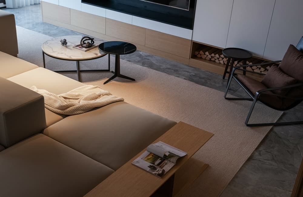 Cấu trúc diện tường: Mảng tường phía sau sofa là sự kết hợp kỳ công giữa gỗ ốp tông trầm và đá tự nhiên vân mây. Cách phân chia mảng khối này không chỉ mang lại diện mạo mạnh mẽ mà còn khẳng định gu thẩm mỹ tinh tế trong việc sắp đặt vật liệu.