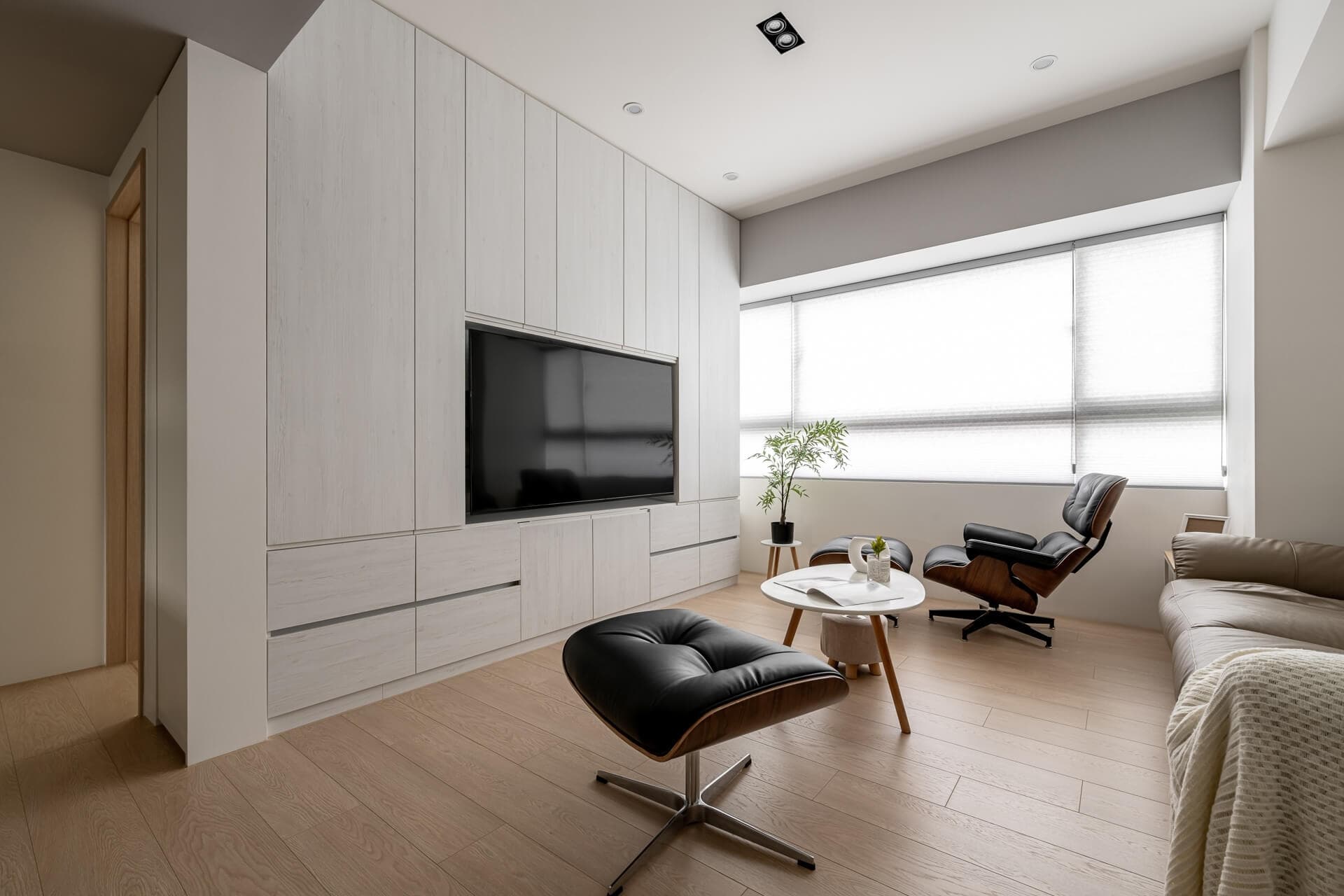 Khu vực phòng khách và bếp ăn được thiết kế liên hoàn, tạo ra một dòng chảy không gian thông suốt. Điểm nhấn thị giác mạnh mẽ nhất nằm ở hệ tủ tivi tích hợp kệ trang trí âm tường. Việc sử dụng hai sắc thái trắng – đen đối lập không chỉ giúp phân định công năng mà còn tạo chiều sâu kiến trúc đáng kể cho diện tường chính.
