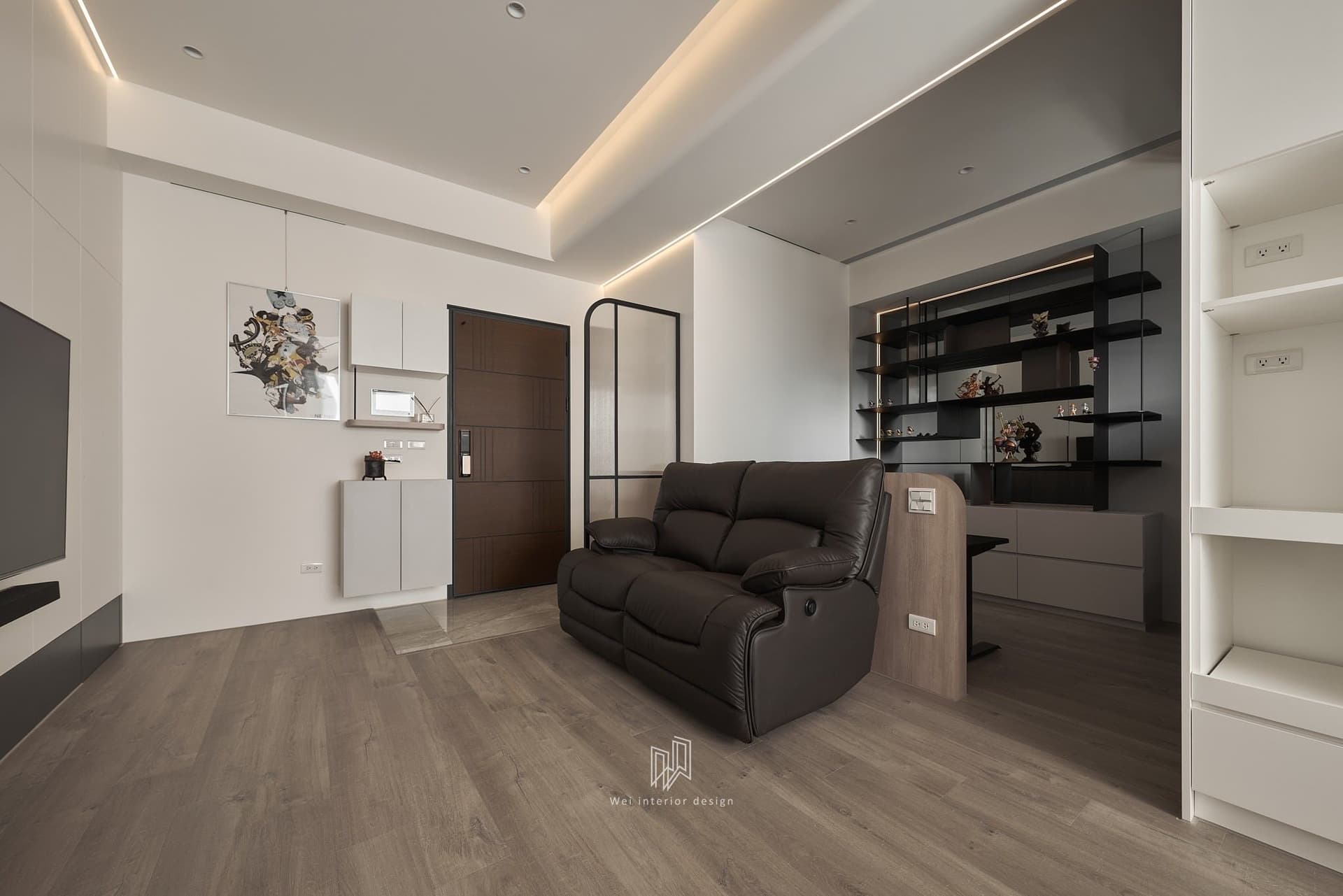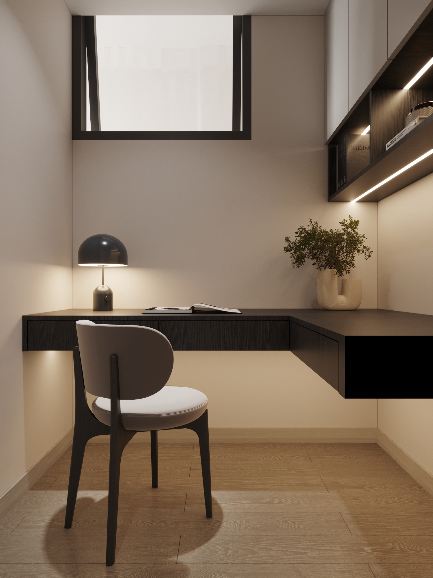 Để giải quyết bài toán về cảm giác không gian trong các căn hộ hiện đại, hệ tủ trang trí đã được tích hợp gương lớn kịch trần. Giải pháp này không chỉ gia tăng hiệu suất lưu trữ mà còn nhân đôi diện tích thị giác, giúp sảnh đón trở nên thoáng đạt hơn. Bên cạnh đó, một góc làm việc nhỏ gọn với bàn treo tường màu đen và hệ đèn LED chạy dọc kệ sách đã minh chứng cho tư duy thiết kế “vừa đủ” – nơi mọi góc khuất đều được thổi hồn công năng.
