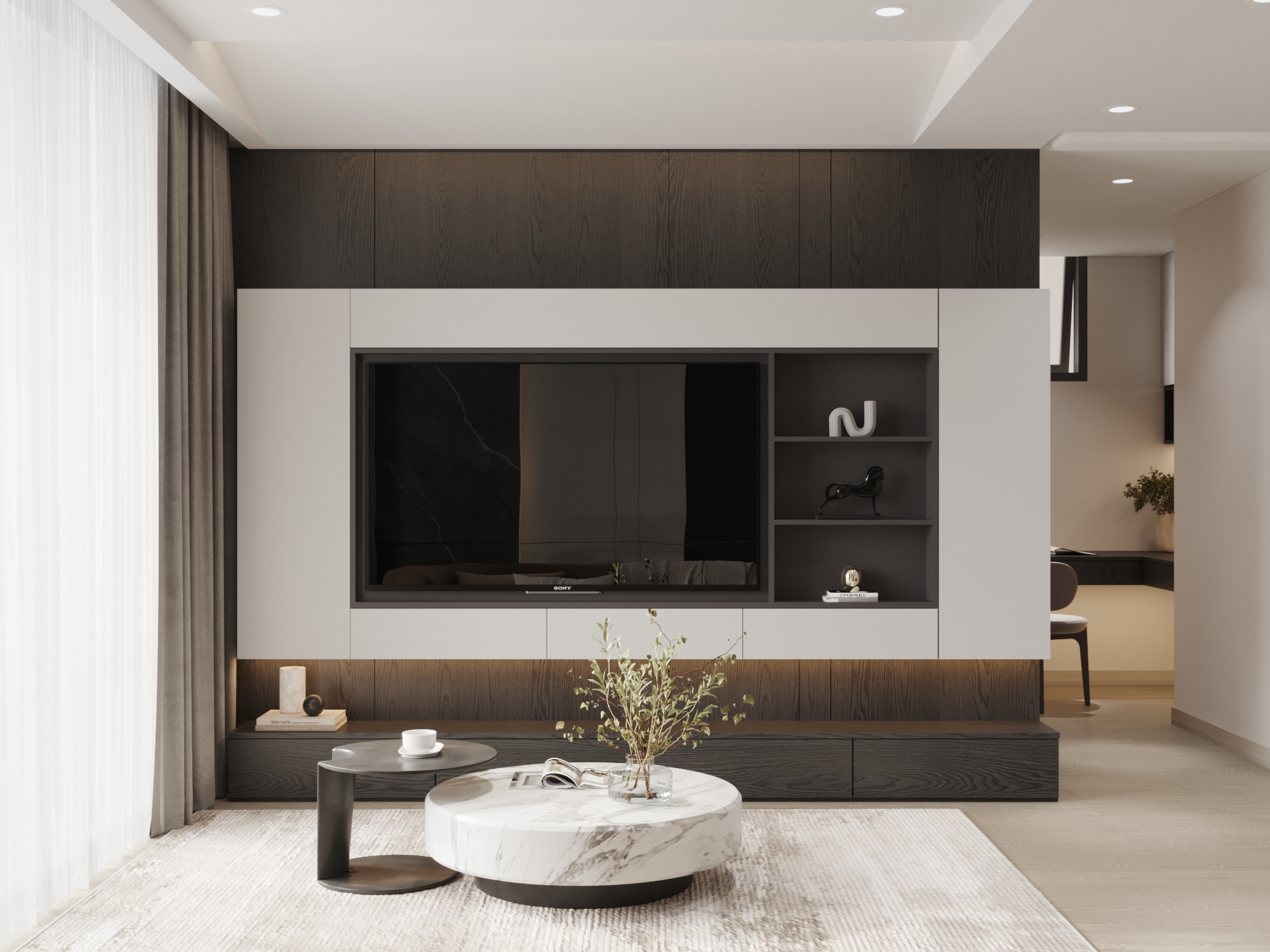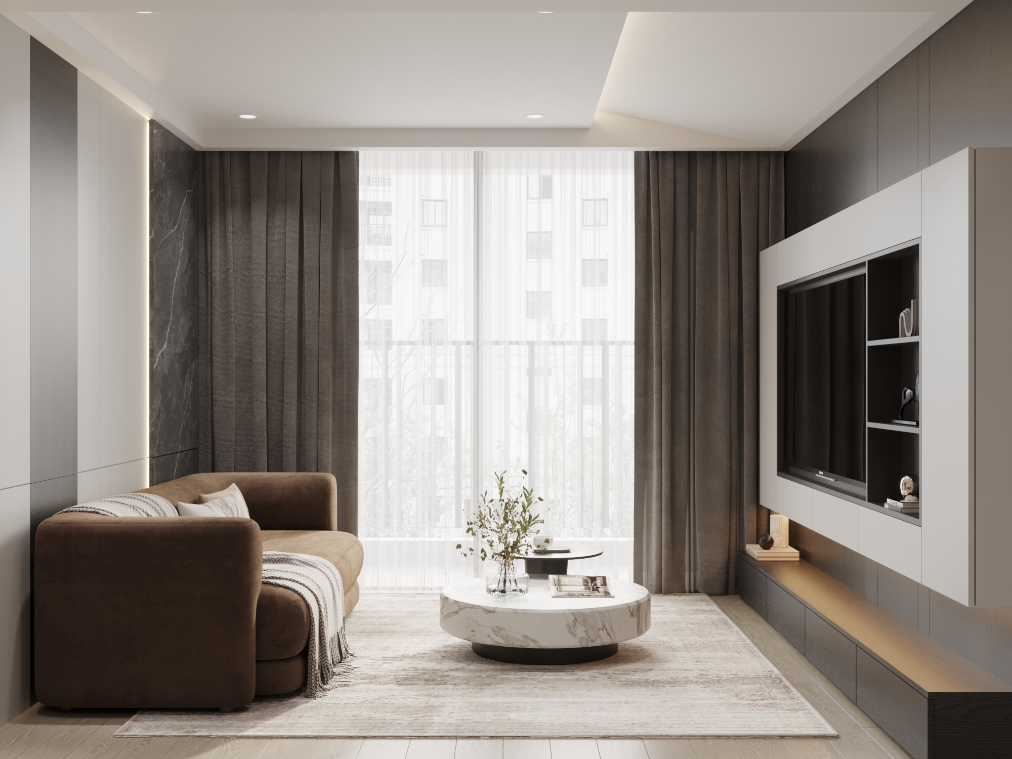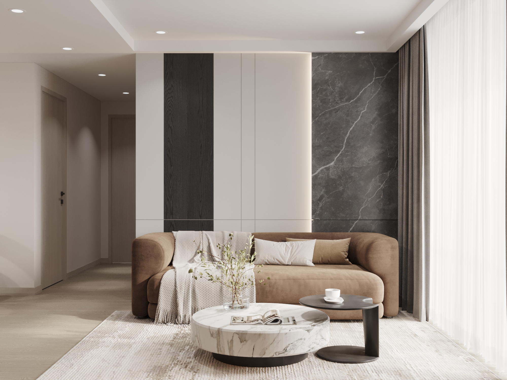 Từ khóa: Thiết kế nội thất tối giản, căn hộ hiện đại tông màu đất, hệ tủ tivi âm tường, đá tự nhiên vân mây trong nội thất, giải pháp không gian mở.