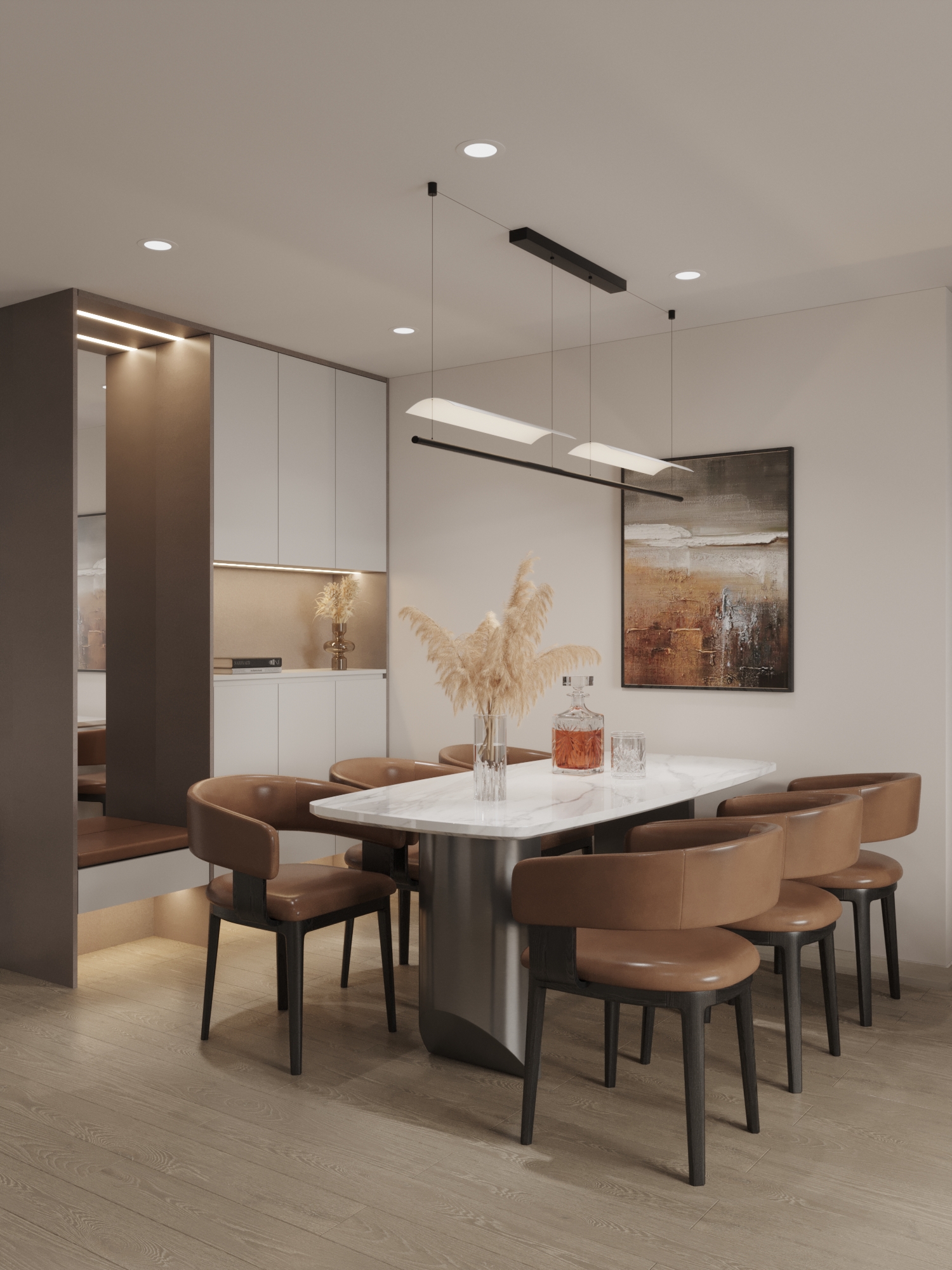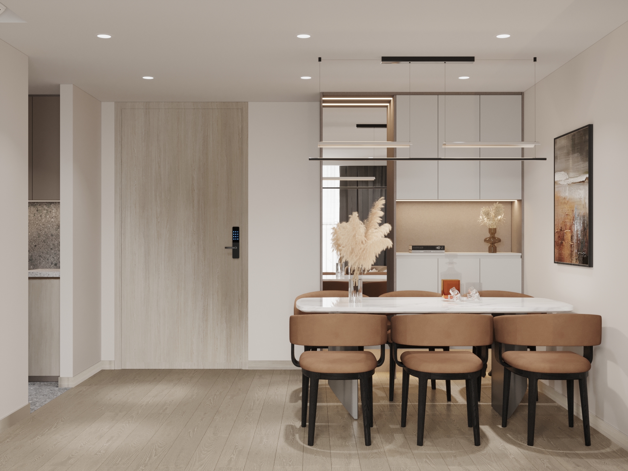 Ngay sát lối vào, khu vực ăn uống được bố trí khéo léo để tối ưu hóa diện tích mà vẫn giữ được sự trang trọng. Bộ bàn ghế bọc da màu nâu bò thiết lập một sự đồng điệu về màu sắc với phòng khách, tạo nên tính nhất quán cho toàn bộ căn hộ.