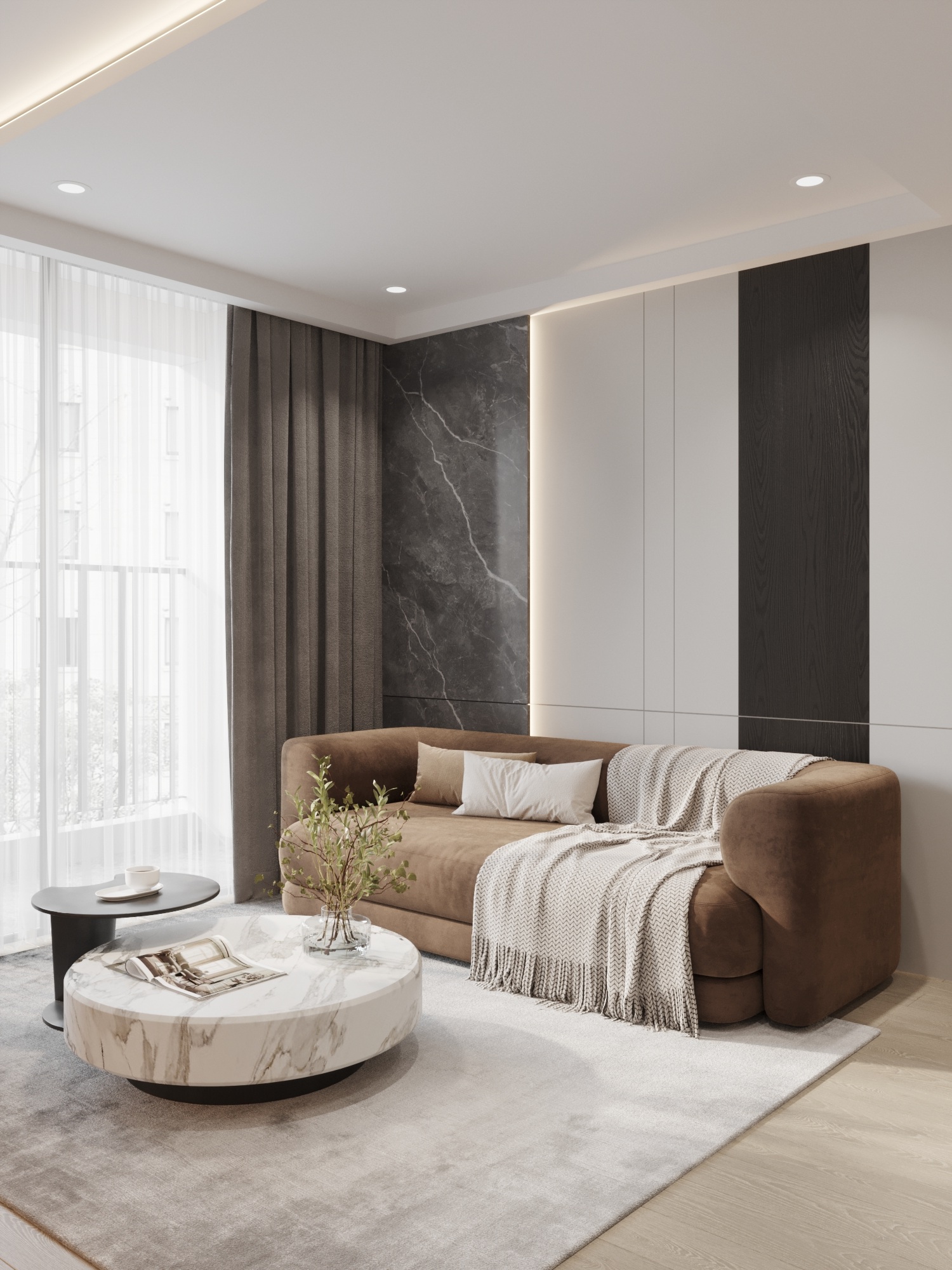Chất liệu ấm áp: Bộ sofa nệm dày màu nâu ấm áp và bàn trà mặt đá marble trắng tạo nên sự cân bằng giữa nét mềm mại và sự vững chãi.