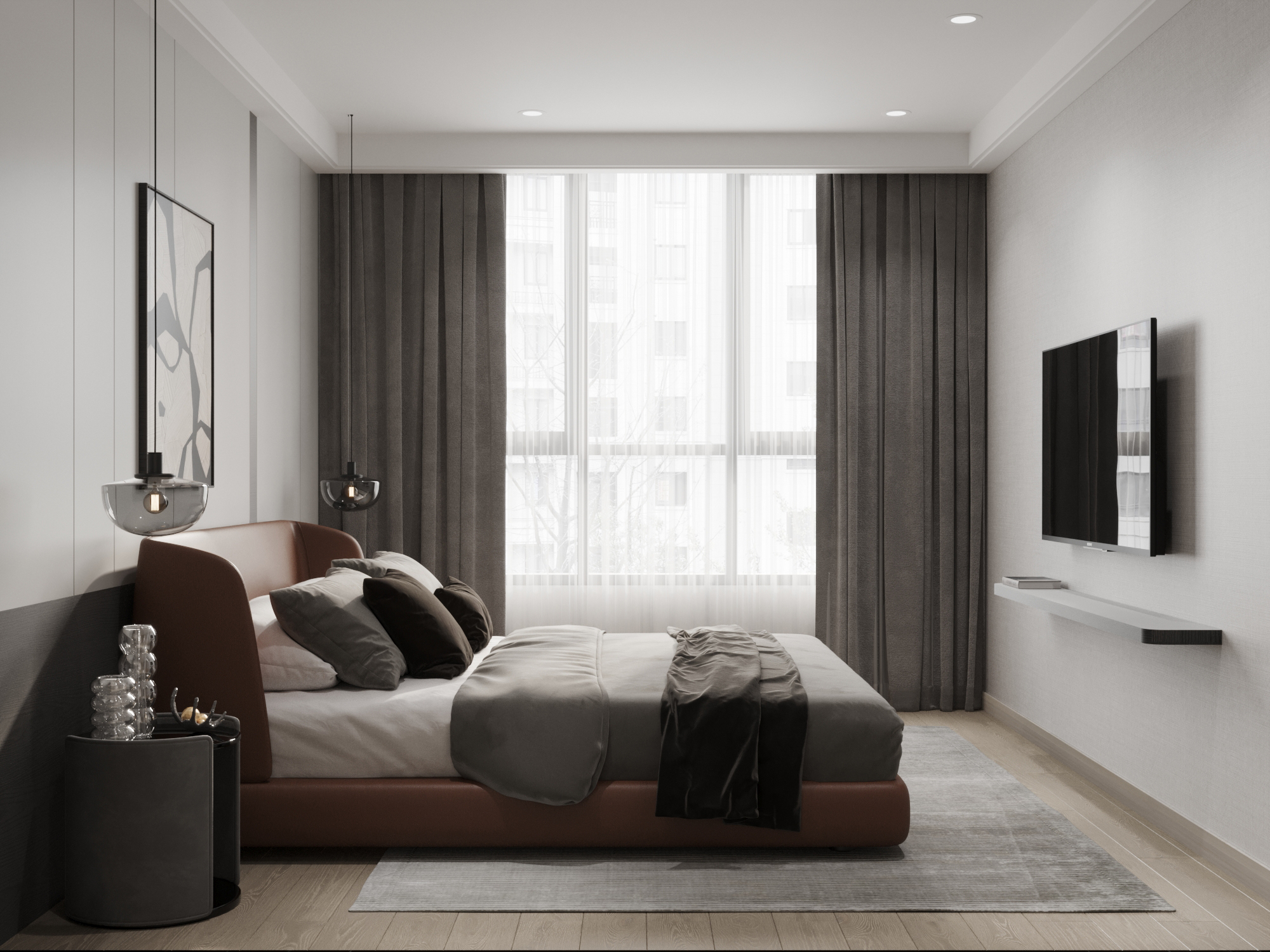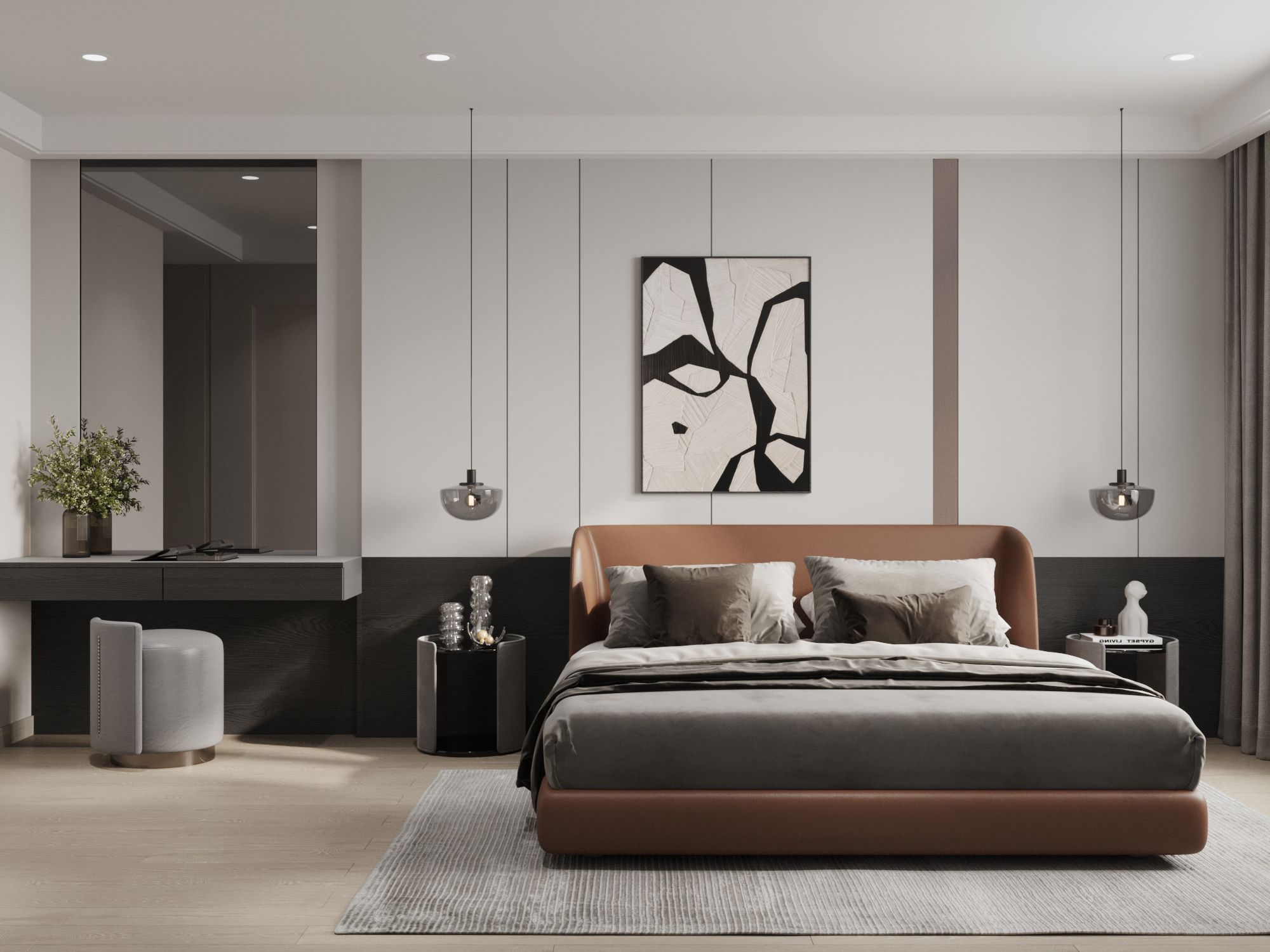 Phòng ngủ chính (Master): Sở hữu hệ cửa sổ lớn sát đất, bắt trọn nguồn ánh sáng tự nhiên và mở rộng tầm nhìn. Giường ngủ bọc da màu cam đất kết hợp cùng đèn thả trần bằng kính khói tạo nên kịch bản ánh sáng đa tầng, mang lại cảm giác ấm cúng vào ban đêm.