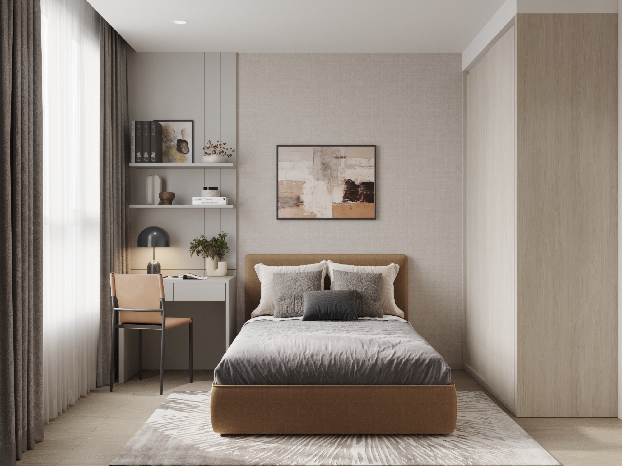 Phòng ngủ phụ: Chú trọng vào tính thực dụng với hệ bàn học tích hợp kệ sách sát tường và tủ quần áo kịch trần màu gỗ sáng. Cách tiếp cận này giúp không gian luôn ngăn nắp, đồng thời giữ được vẻ đẹp thanh thoát xuyên suốt.