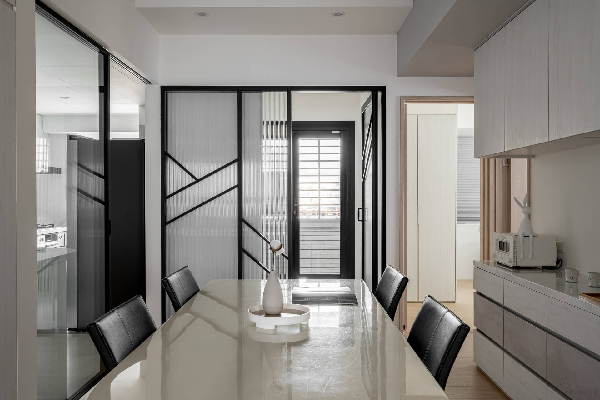 3. Bar truyền thức ăn – Ranh giới của sự tinh tế Giữa bếp và phòng ăn là hệ cửa lùa khung nhôm kính cùng một quầy bar nhỏ truyền thức ăn. Thiết kế này phục vụ hai mục đích: