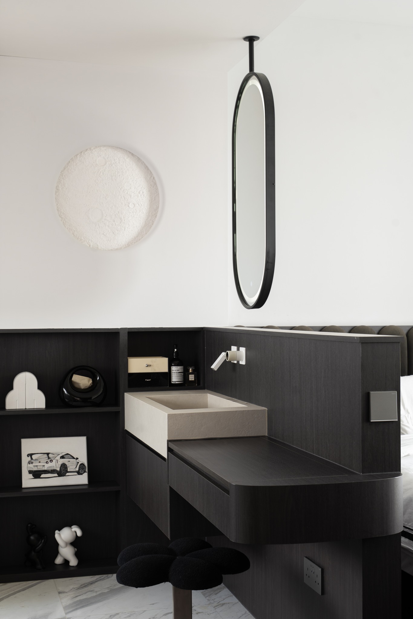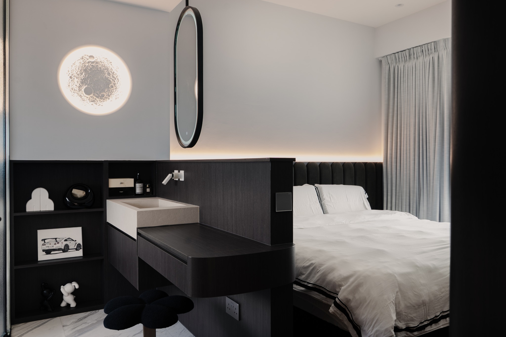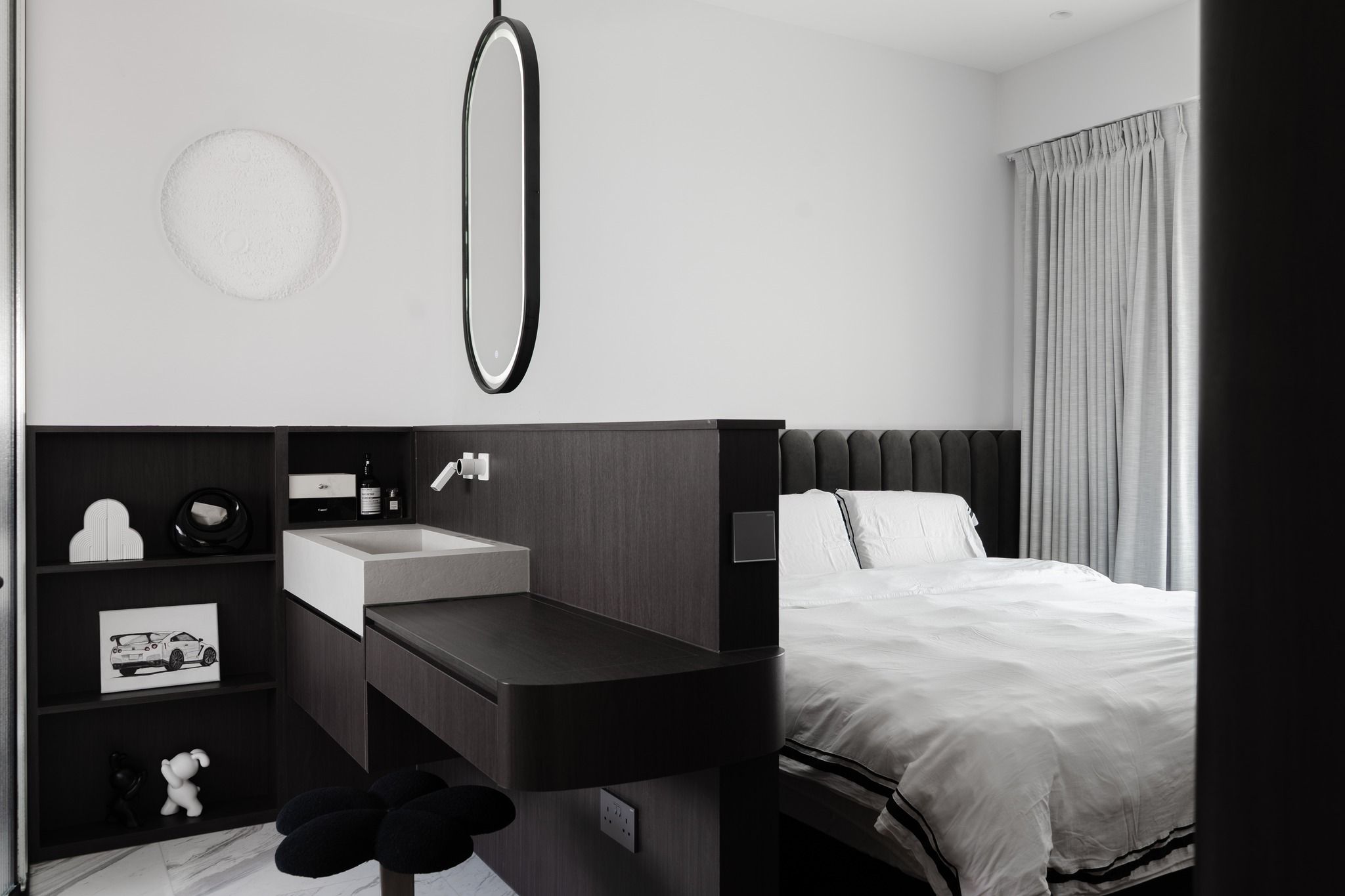 Từ khóa: Thiết kế căn hộ trắng đen tối giản, kệ sách hình vòm cung, trang trí phòng ngủ mặt trăng phát sáng, nội thất bếp phẳng không tay cầm, thiết kế không gian tích hợp thông minh.