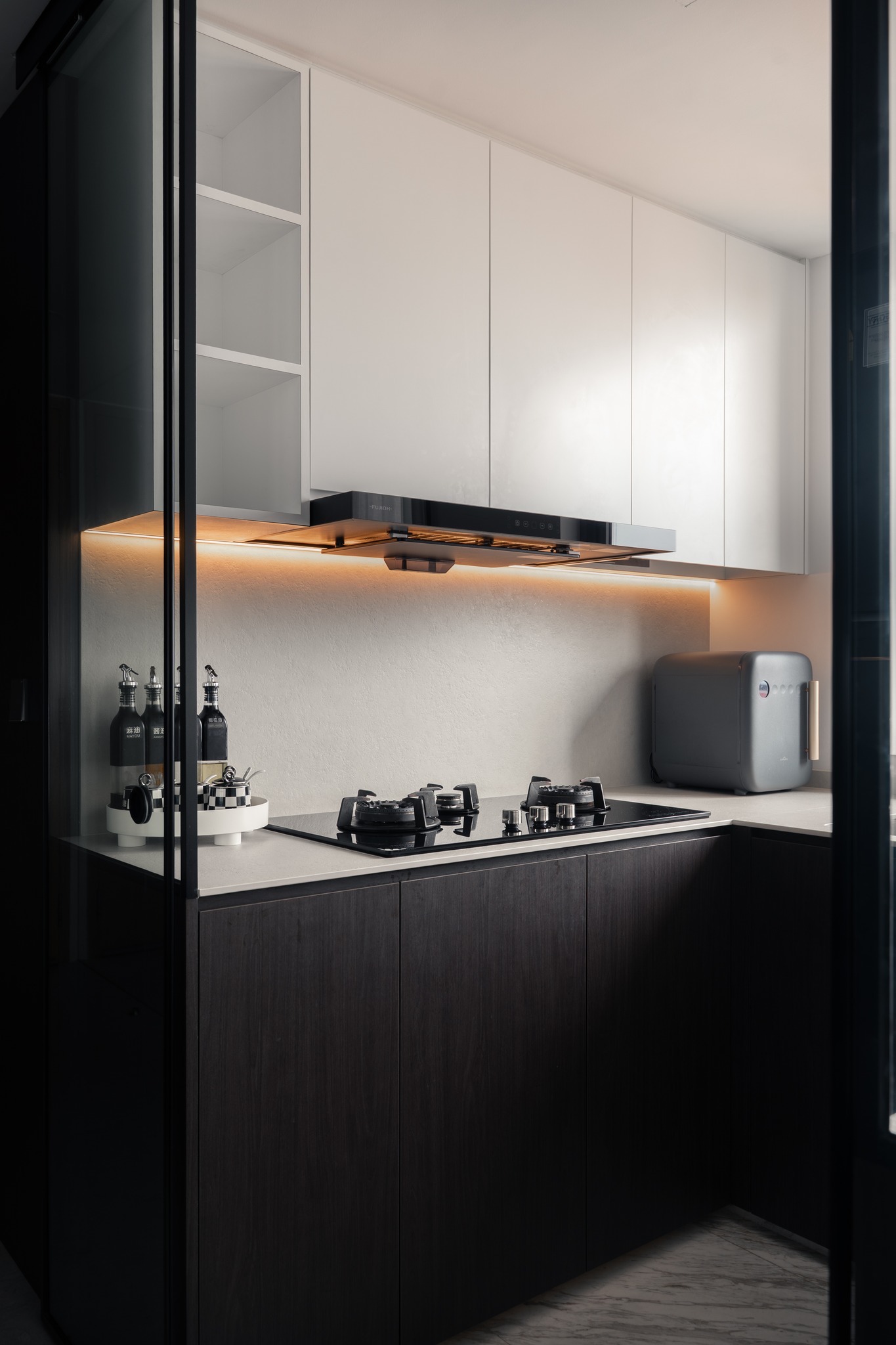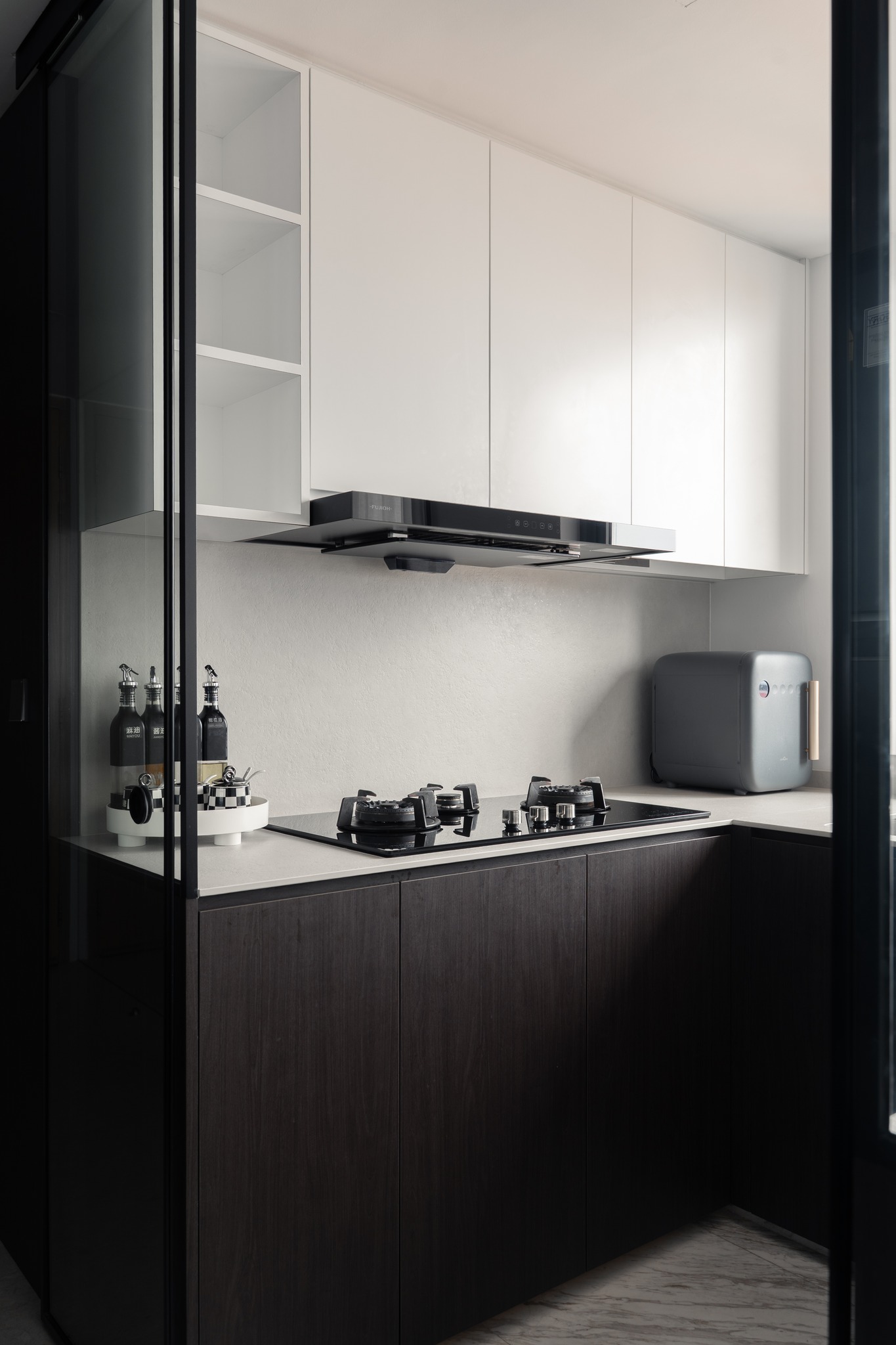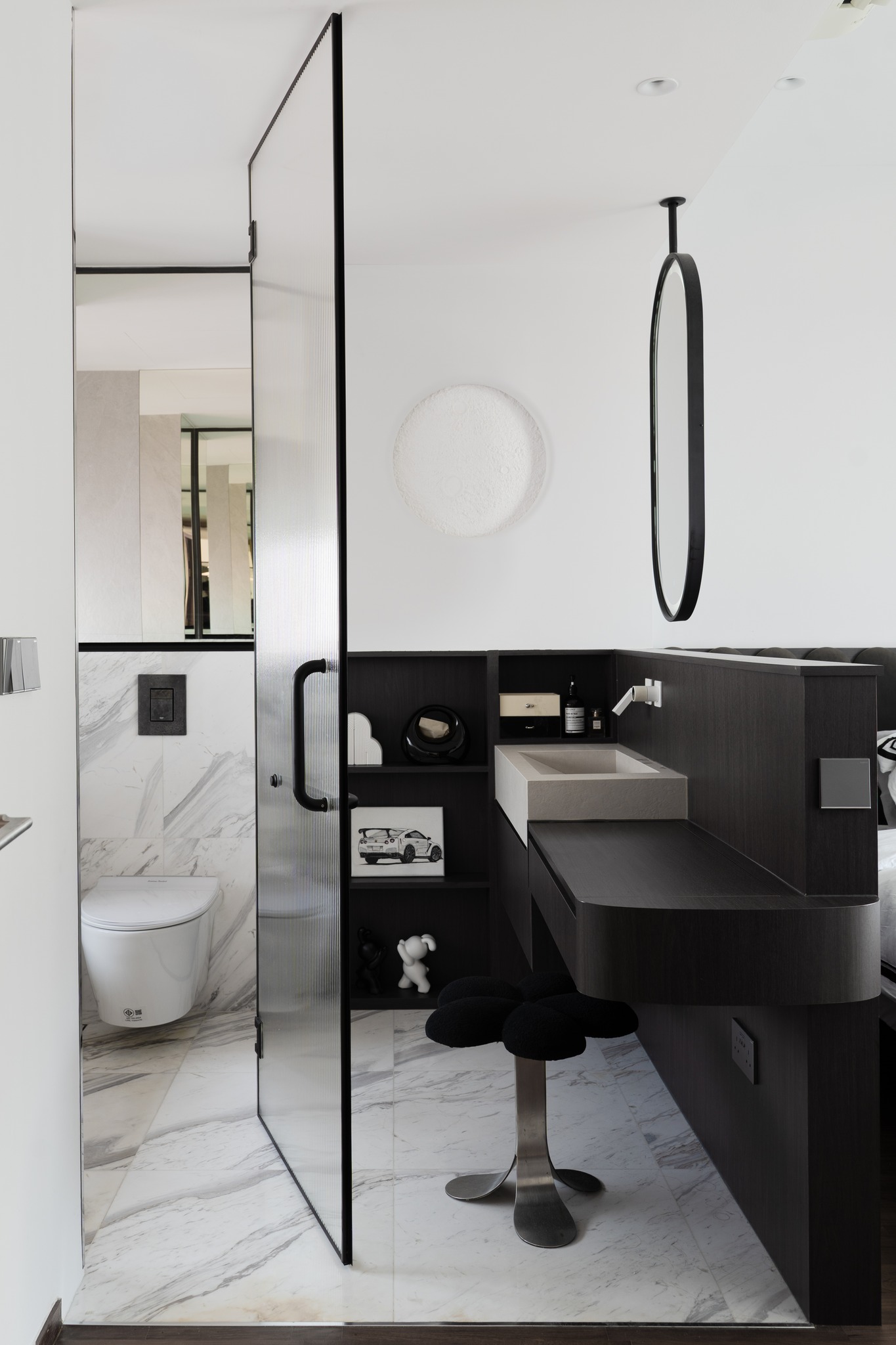 Từ khóa: Thiết kế căn hộ trắng đen tối giản, kệ sách hình vòm cung, trang trí phòng ngủ mặt trăng phát sáng, nội thất bếp phẳng không tay cầm, thiết kế không gian tích hợp thông minh.