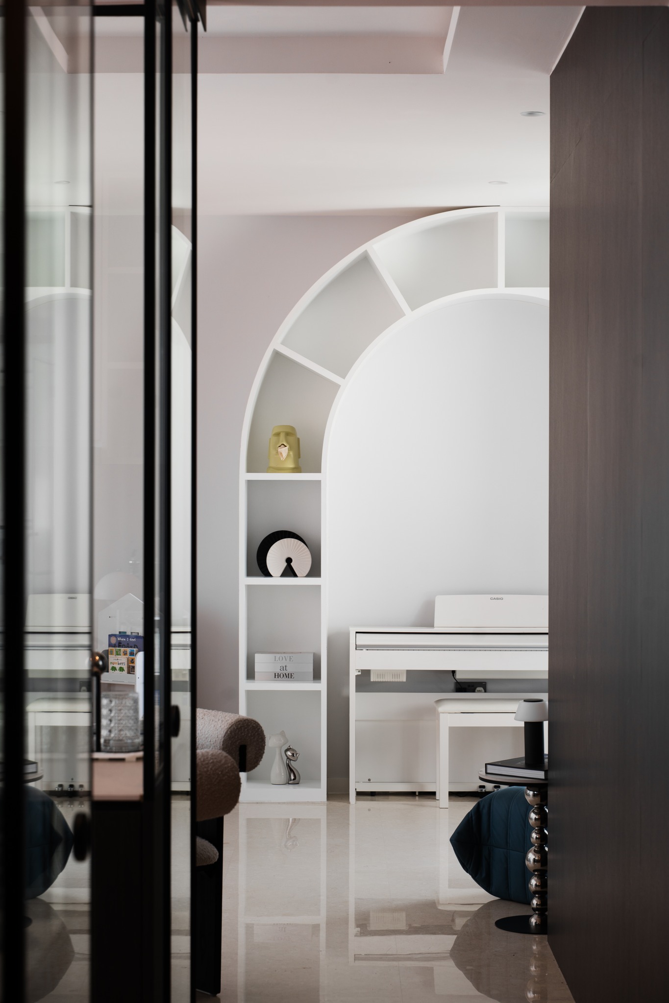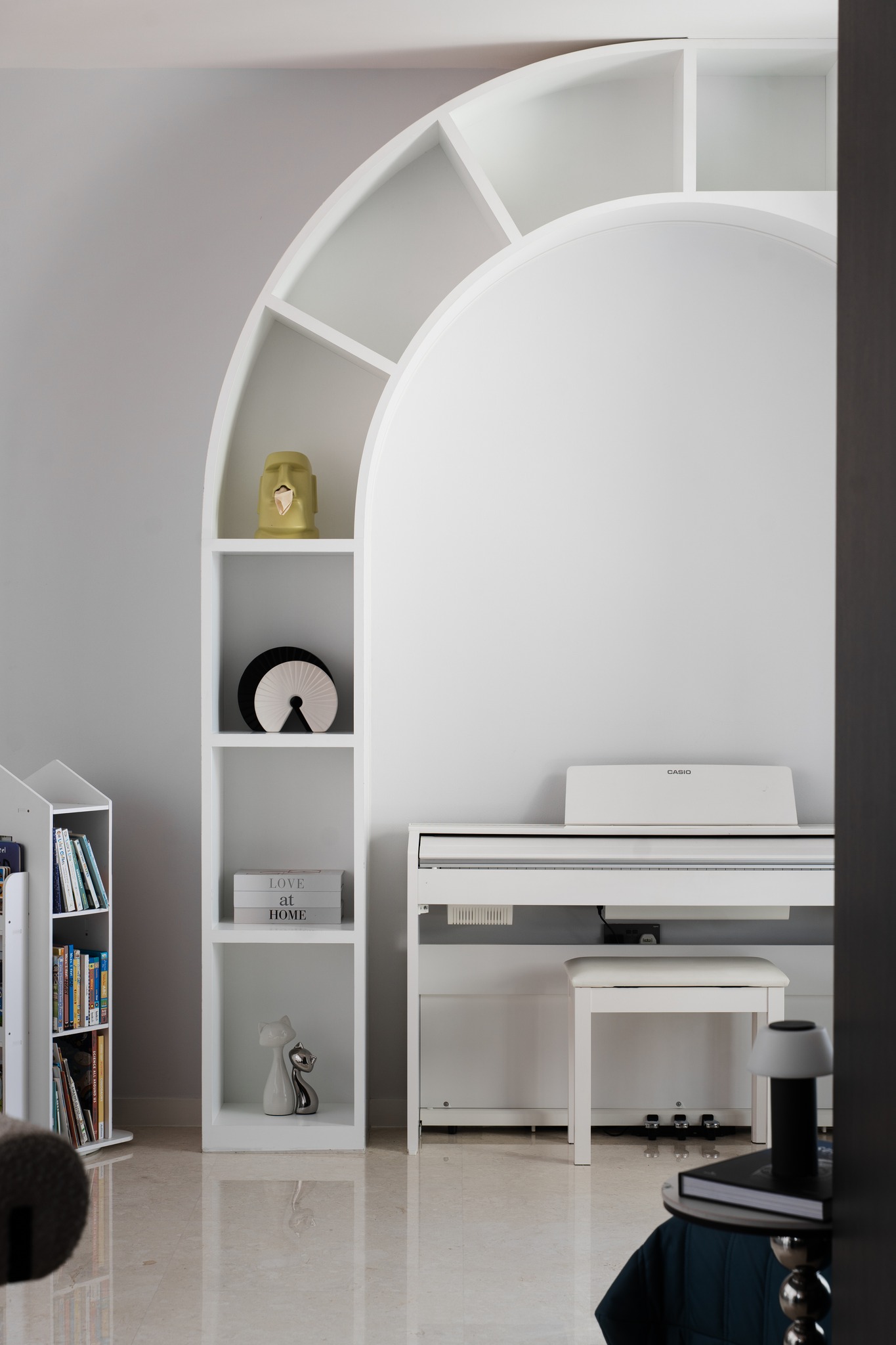 Điểm khởi đầu cho mạch cảm xúc của căn hộ là khu vực thư giãn với thiết kế kệ sách hình vòm cung độc đáo. Cấu trúc vòm không chỉ làm mềm đi sự khô cứng của các bức tường mà còn tạo ra một “hốc” kiến trúc ôm trọn chiếc đàn piano Casio trắng thanh thoát.