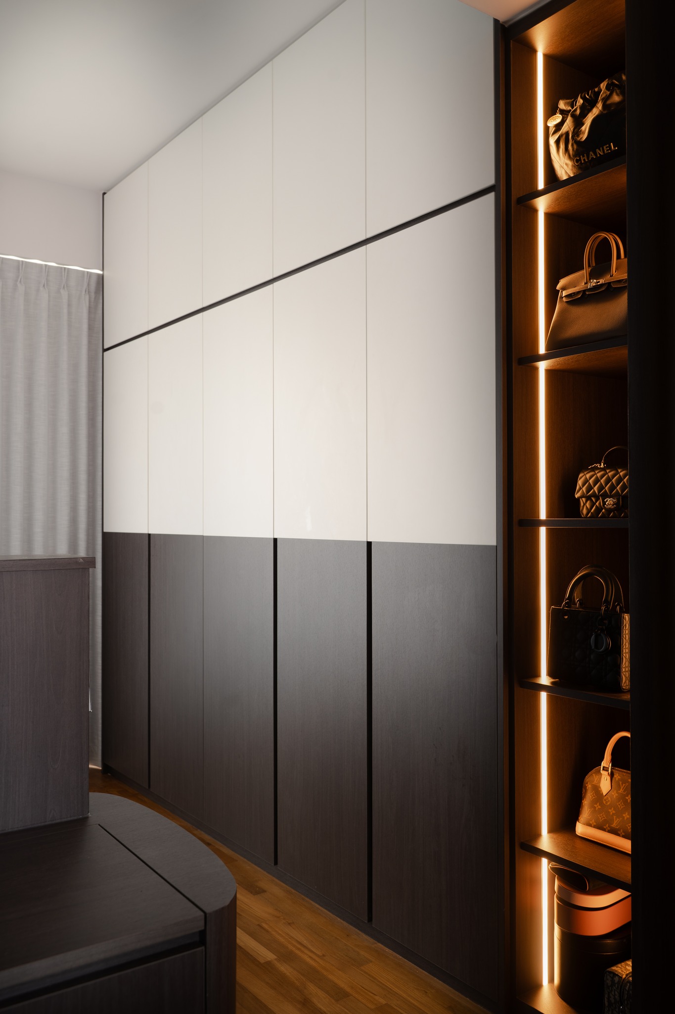 Toàn bộ căn hộ được liên kết bởi mảng tường gỗ lớn màu trầm chạy dọc hành lang, đóng vai trò như một trục xương sống kết nối các phòng chức năng. Hệ thống ánh sáng được thiết kế đa lớp (layered lighting) bao gồm:
