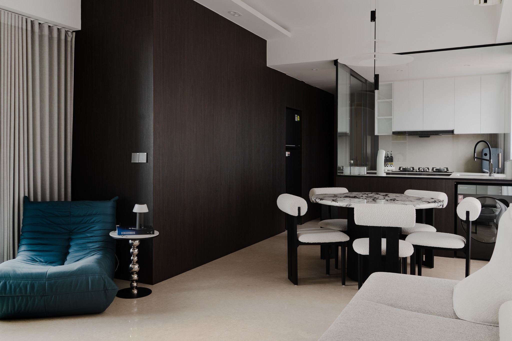 Căn hộ là một chỉnh thể thiết kế mạch lạc, nơi sự tương phản màu sắc và sự linh hoạt của hình khối được đẩy lên mức cao nhất. Không chỉ đáp ứng nhu cầu lưu trú, không gian còn phản ánh một tư duy thẩm mỹ hiện đại, nơi sự tối giản và nghệ thuật sống hòa quyện để tạo nên một trải nghiệm thị giác xuyên suốt và đẳng cấp.