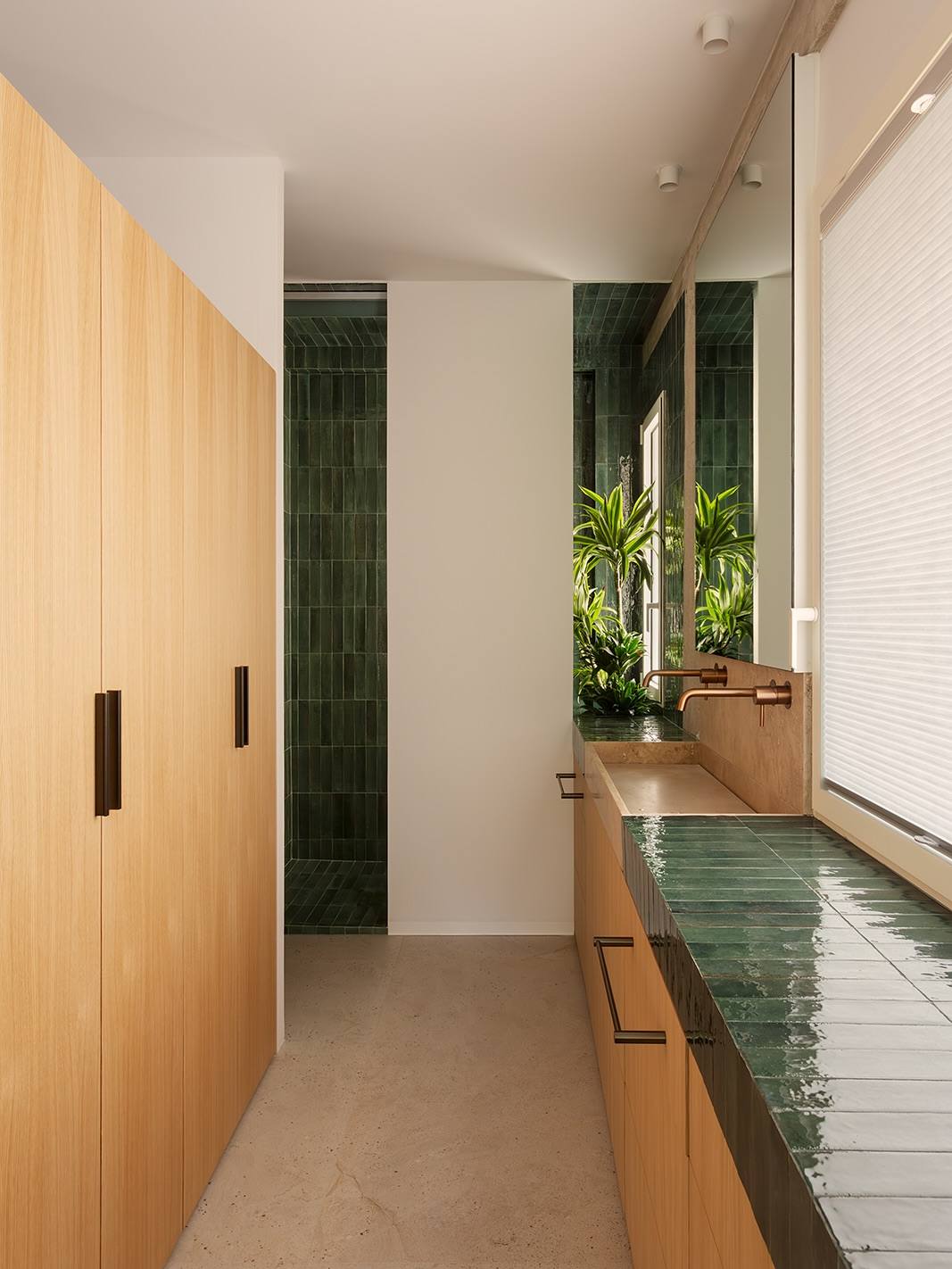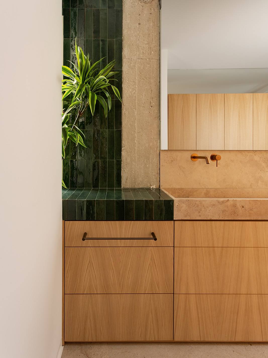 Thảm thực vật xanh mát: Những mảng gạch men tráng men màu xanh lá cây cỡ nhỏ xíu được ốp tỉ mỉ, gợi lên hình ảnh thảm thực vật tươi tốt ven bờ. Thậm chí, cây xanh còn được trồng trực tiếp ngay bên trong các món đồ nội thất, biến ngôi nhà thành một thực thể sống động và biết thở.