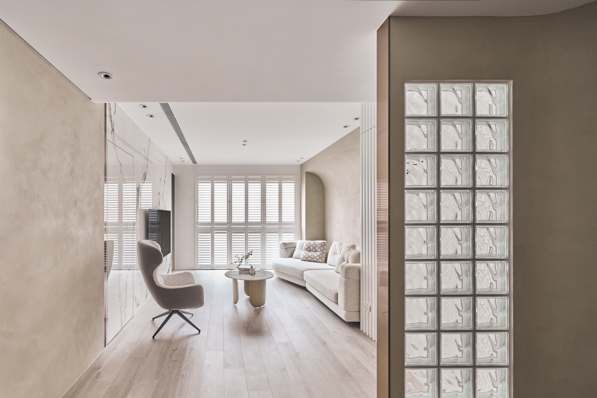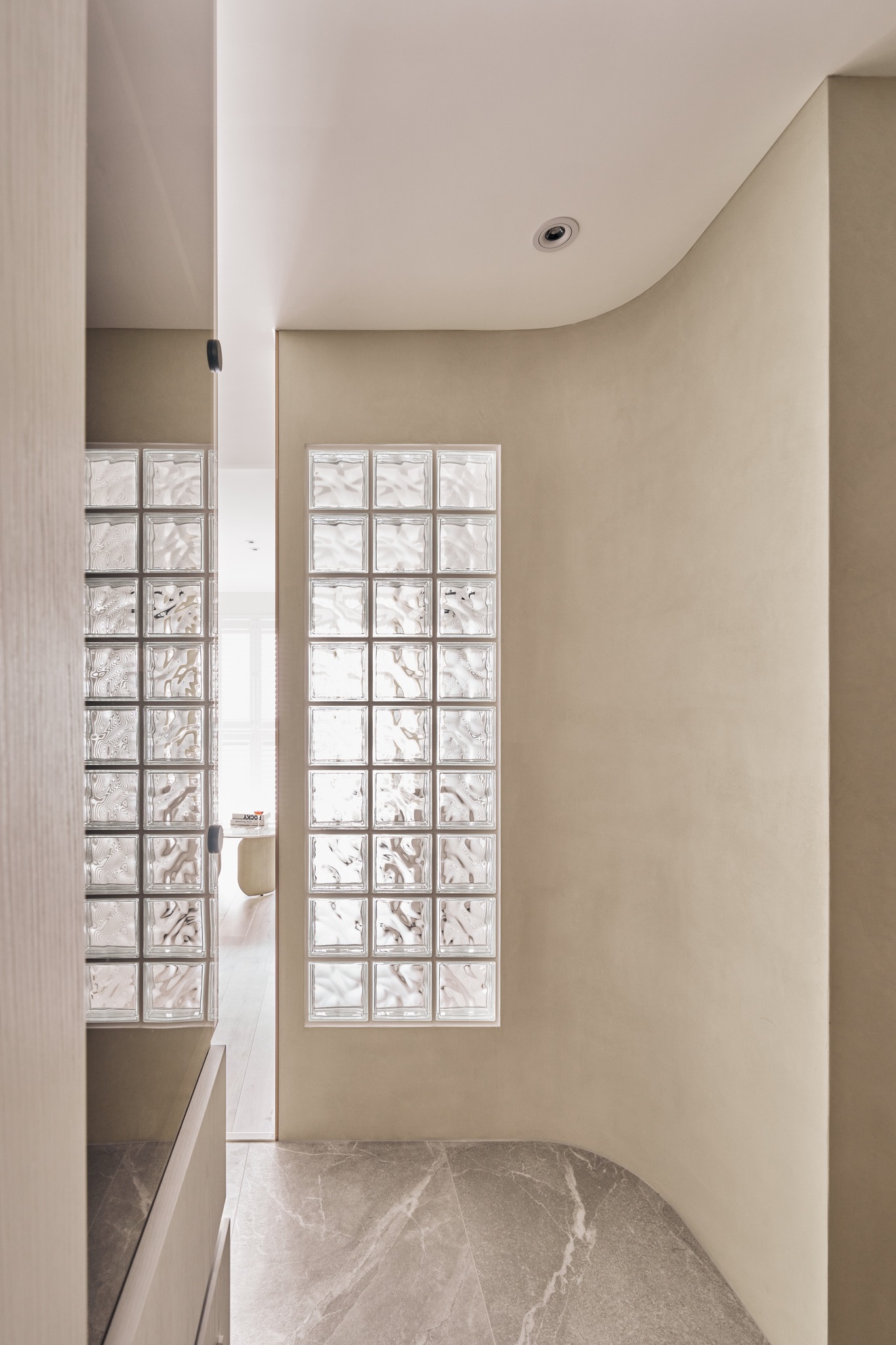 Sảnh đón khách (foyer) được quy hoạch theo lối dẫn dắt của những đường cong mềm mại, tạo nên một “nghi thức nhập môn” tĩnh tại và trang trọng. Sự đan xen giữa gạch kính (glass bricks) và các mảng gương không chỉ giúp tán xạ ánh sáng, mở rộng thị giác mà còn mang lại cảm giác minh bạch, thanh khiết ngay từ bước chân đầu tiên.