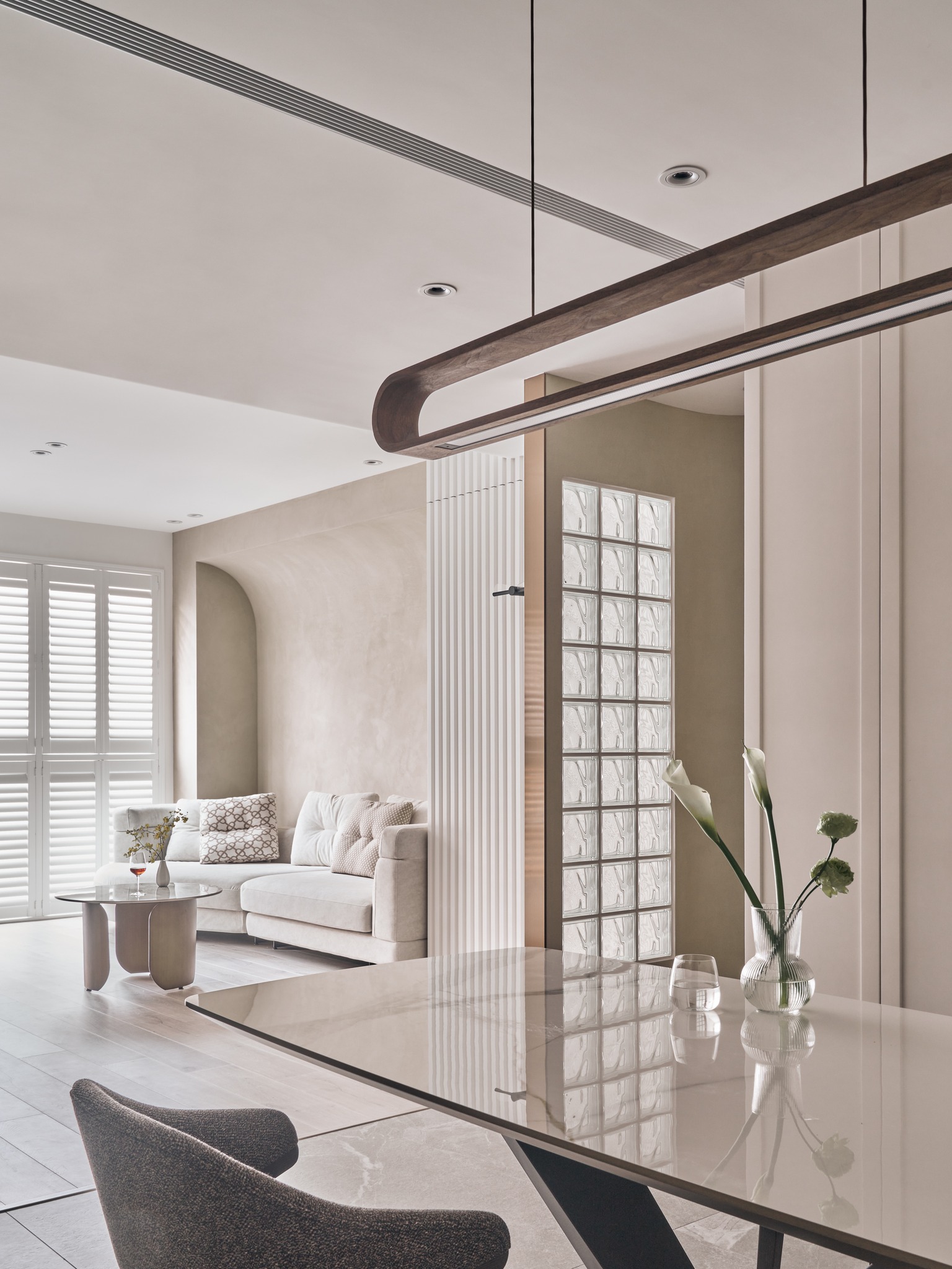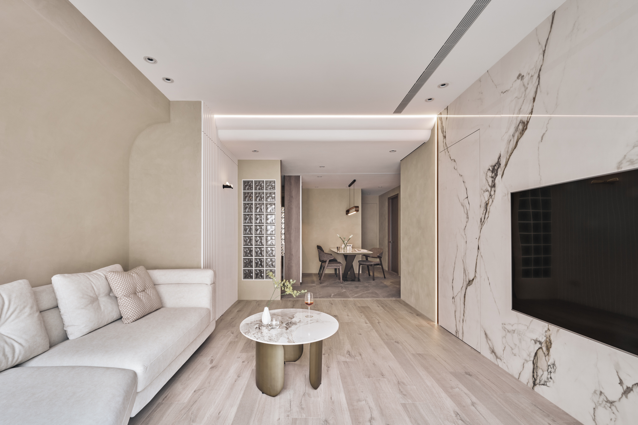 Không gian chung được bao phủ bởi tông màu Milk Tea (奶茶色) ấm áp, kết hợp cùng các loại đá tự nhiên sang trọng để kiến tạo vẻ đẹp “Korean Modern” đầy tinh tế: