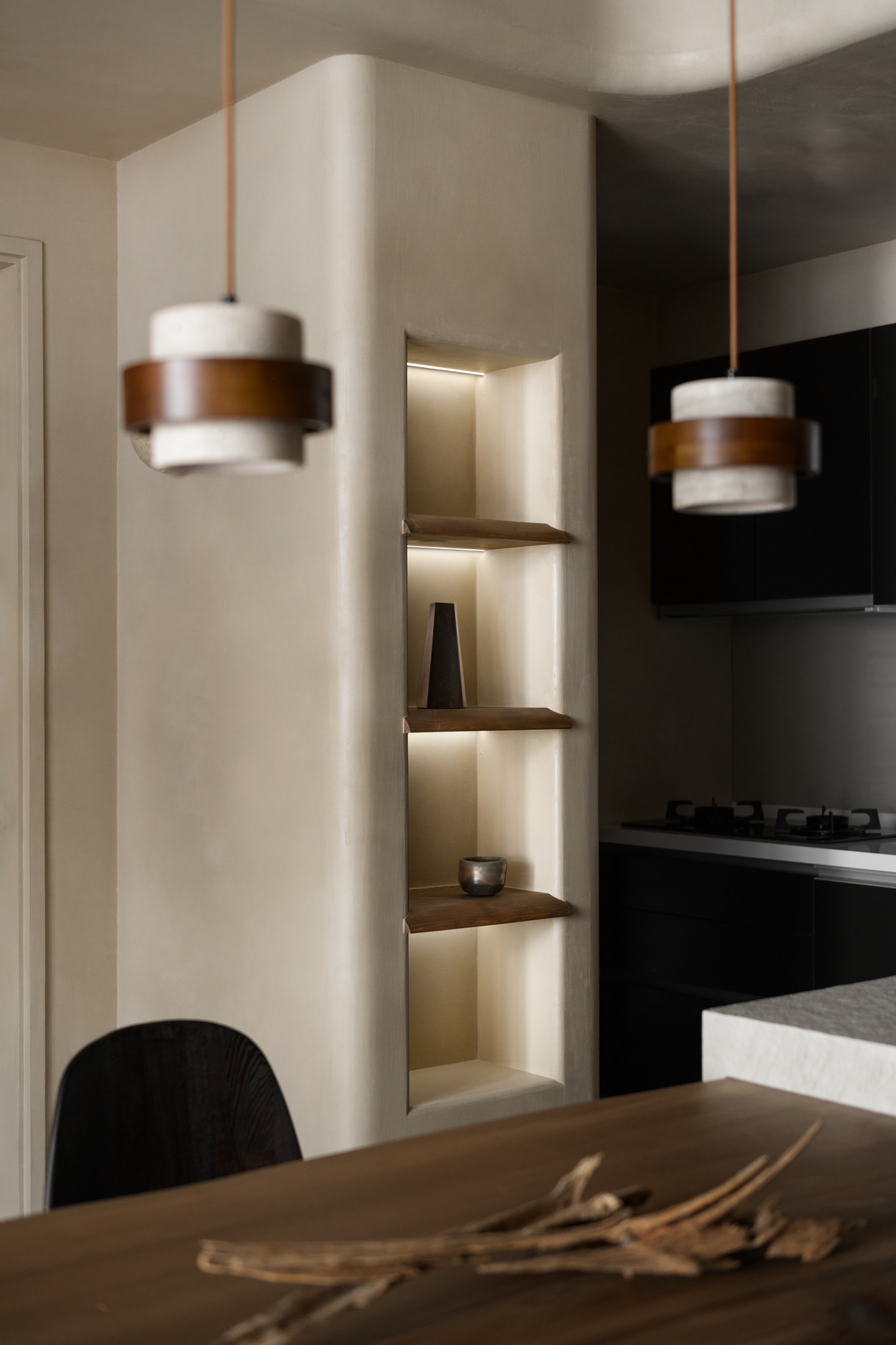 Sự liên tục của dòng chảy: Hệ khung này không chỉ dừng lại ở vai trò trang trí mà còn kết nối các diện đứng và trần nhà, tạo ra một sự chuyển tiếp mượt mà, đưa toàn bộ căn hộ trở về một trật tự thống nhất.