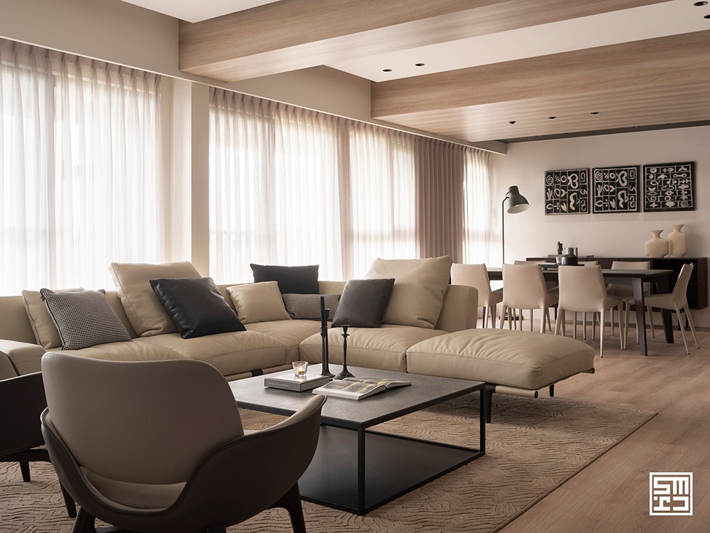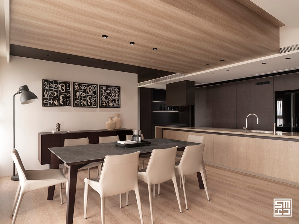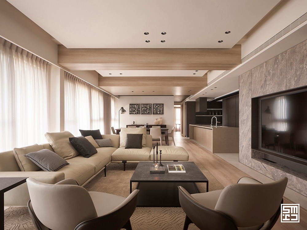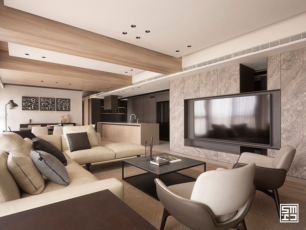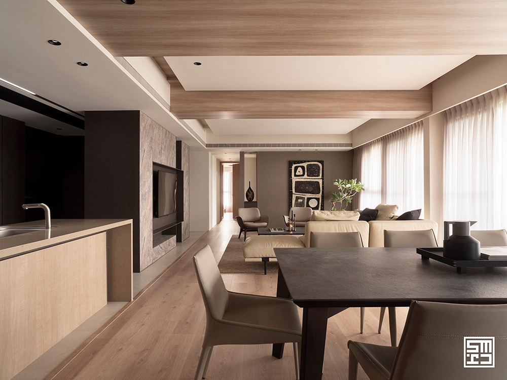 Phòng khách, khu vực ăn uống và bếp được quy hoạch theo sơ đồ mở hoàn toàn. Thay vì các bức tường thô cứng, các khu vực chức năng được định hình một cách ước lệ thông qua việc sắp đặt nội thất.