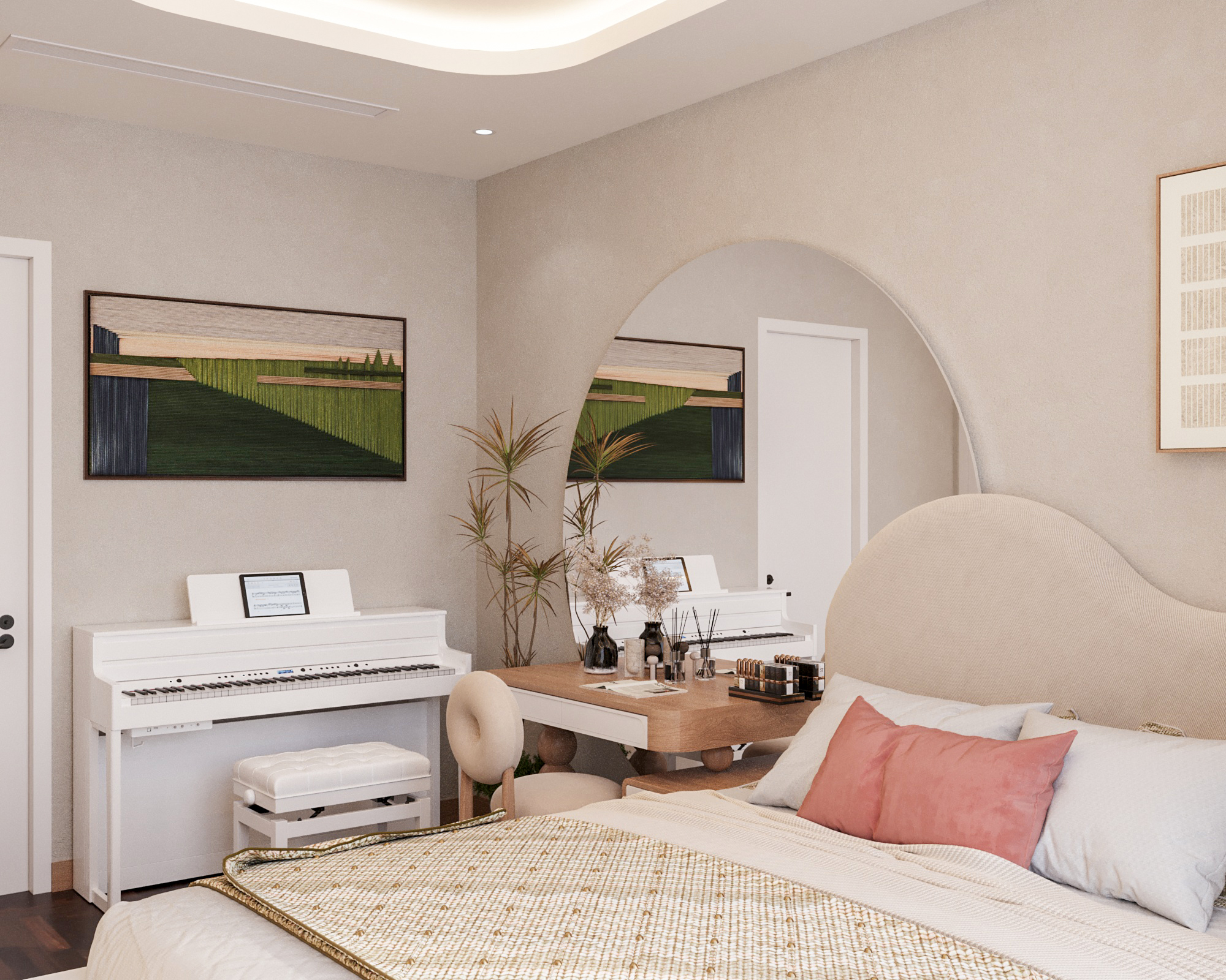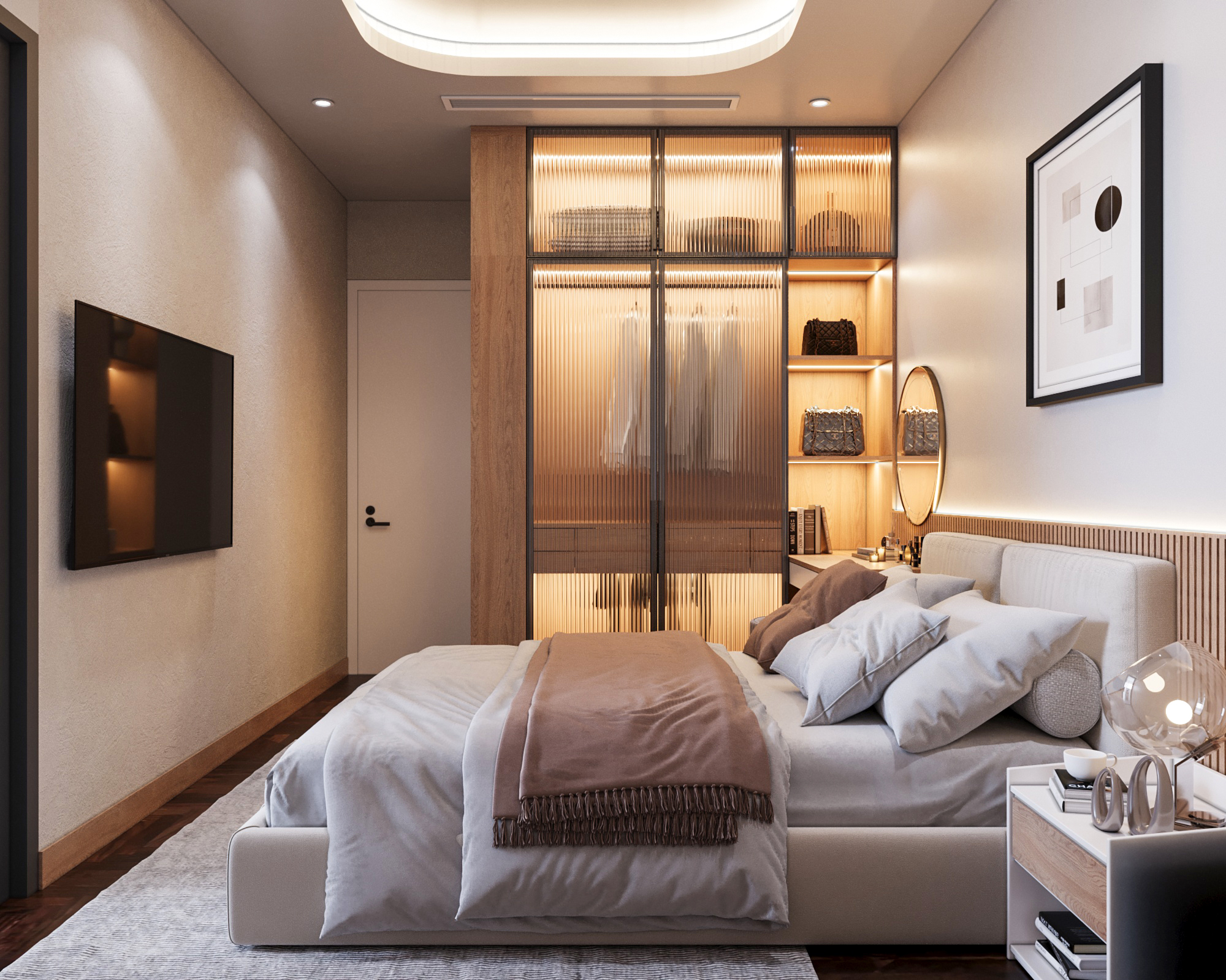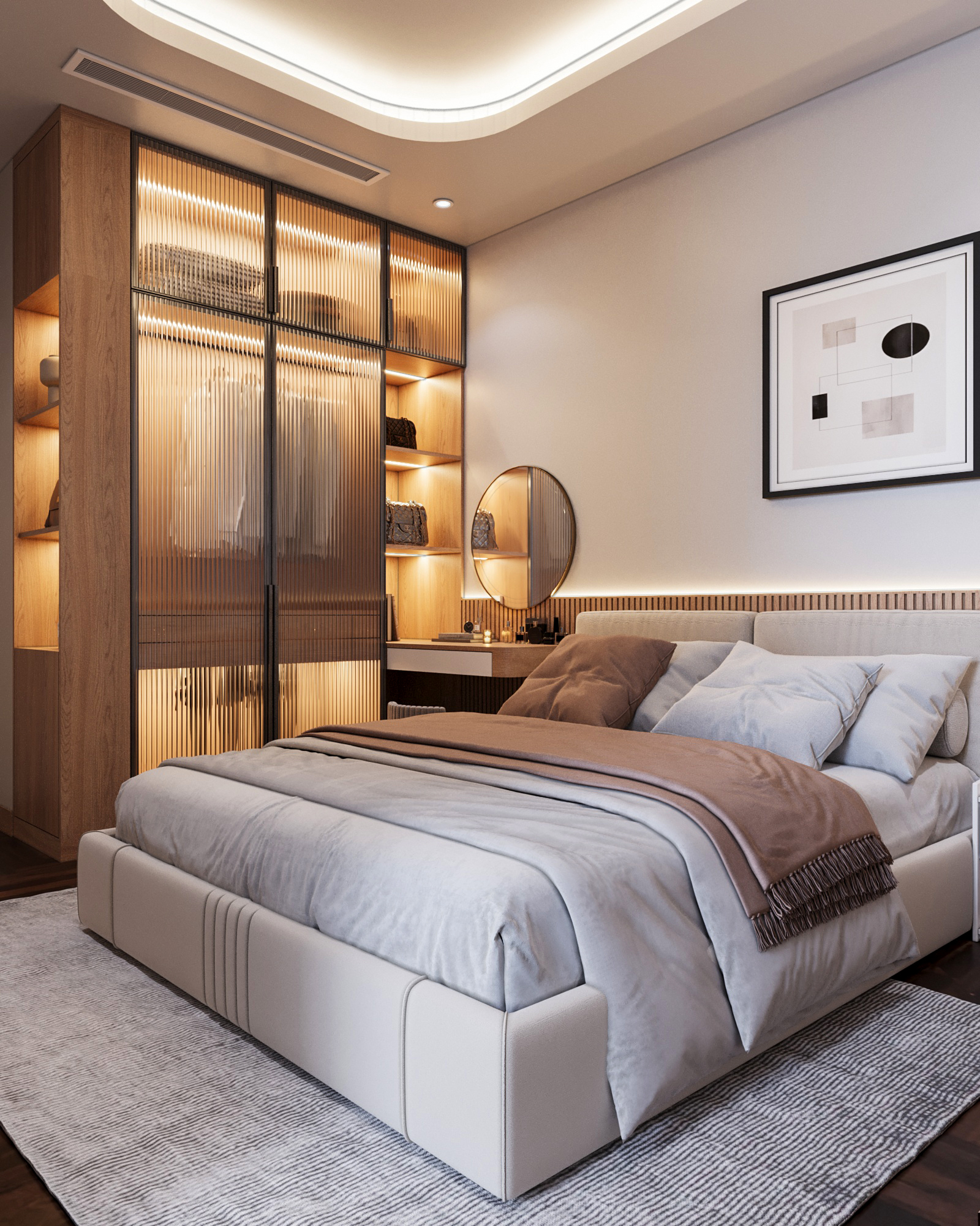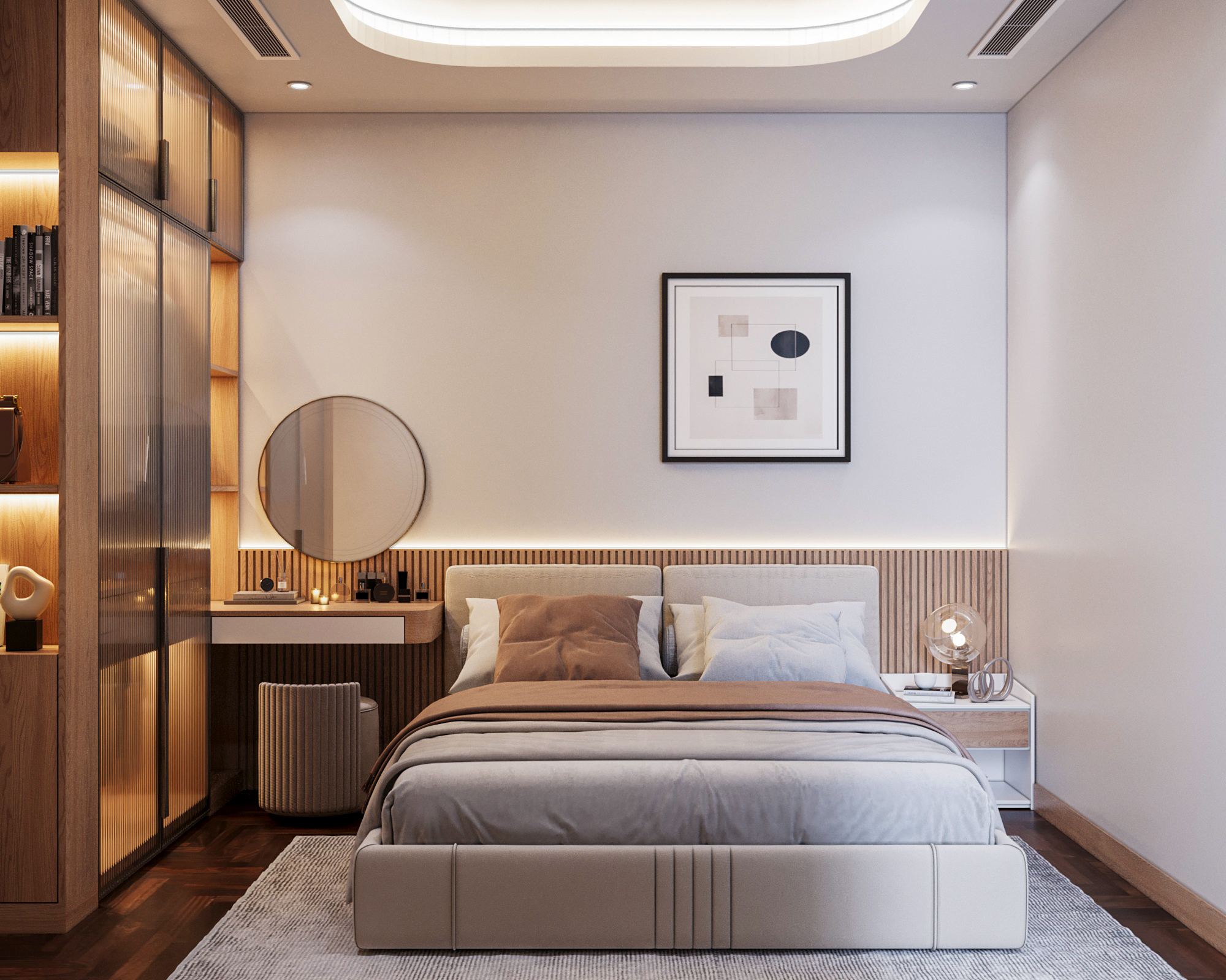 Mạch cảm xúc thư giãn được đẩy lên cao trào khi bước vào không gian phòng ngủ. Chiếc giường nệm kem đầu bo cong mềm mại nổi bật trên nền vách ốp gỗ nan sọc, được tôn lên nhờ hiệu ứng đèn LED hắt chiều sâu. Điểm nhấn đắt giá nằm ở hệ tủ quần áo cánh kính sọc gân mờ (fluted glass) khung nhôm đen – một chi tiết vừa sang trọng, vừa tạo độ thoáng mở cho thị giác. Không gian sống trở nên trọn vẹn và đậm chất riêng nhờ những nét chấm phá nghệ thuật tinh xảo: từ bộ tranh trừu tượng hình học tông cam đất, bàn trang điểm chân tiện tròn cho đến chiếc ghế tựa hình bánh donut độc đáo. Tất cả kiến tạo nên một tổng thể tiện nghi, thẩm mỹ và là chốn về an yên tuyệt đối.