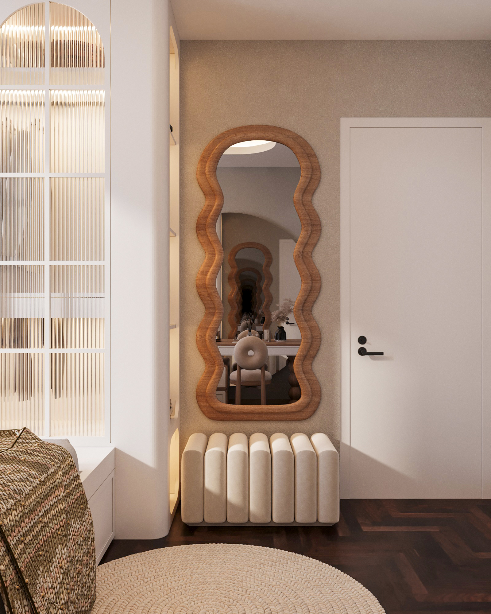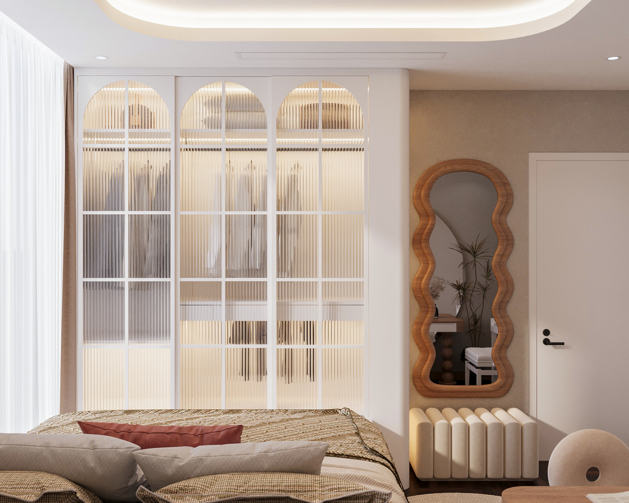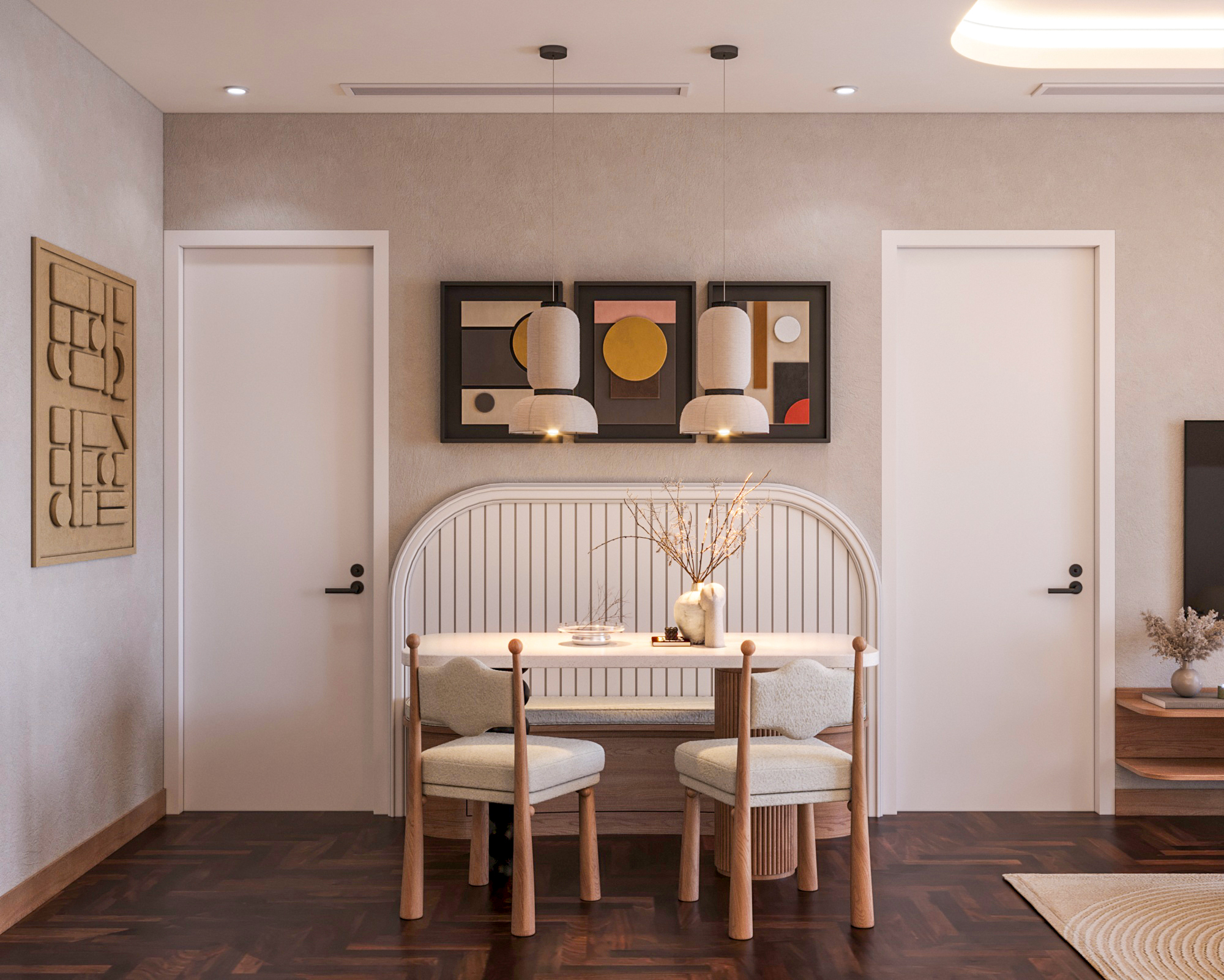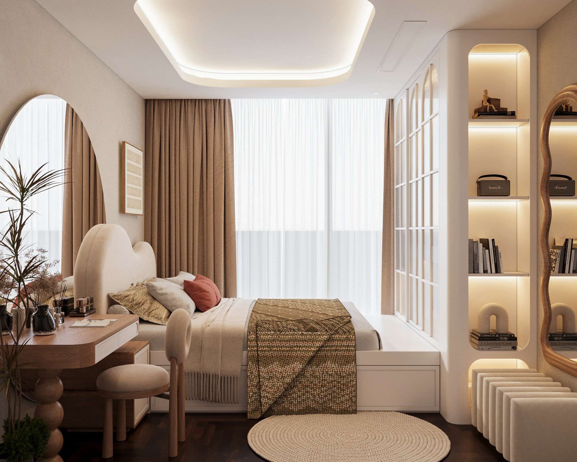 Mạch cảm xúc thư giãn được đẩy lên cao trào khi bước vào không gian phòng ngủ. Chiếc giường nệm kem đầu bo cong mềm mại nổi bật trên nền vách ốp gỗ nan sọc, được tôn lên nhờ hiệu ứng đèn LED hắt chiều sâu. Điểm nhấn đắt giá nằm ở hệ tủ quần áo cánh kính sọc gân mờ (fluted glass) khung nhôm đen – một chi tiết vừa sang trọng, vừa tạo độ thoáng mở cho thị giác. Không gian sống trở nên trọn vẹn và đậm chất riêng nhờ những nét chấm phá nghệ thuật tinh xảo: từ bộ tranh trừu tượng hình học tông cam đất, bàn trang điểm chân tiện tròn cho đến chiếc ghế tựa hình bánh donut độc đáo. Tất cả kiến tạo nên một tổng thể tiện nghi, thẩm mỹ và là chốn về an yên tuyệt đối.