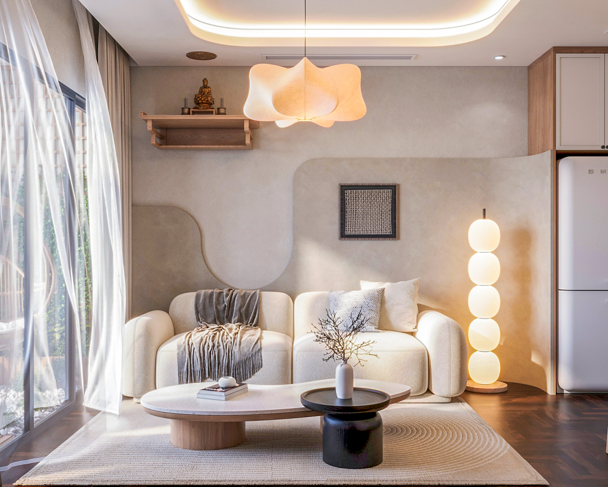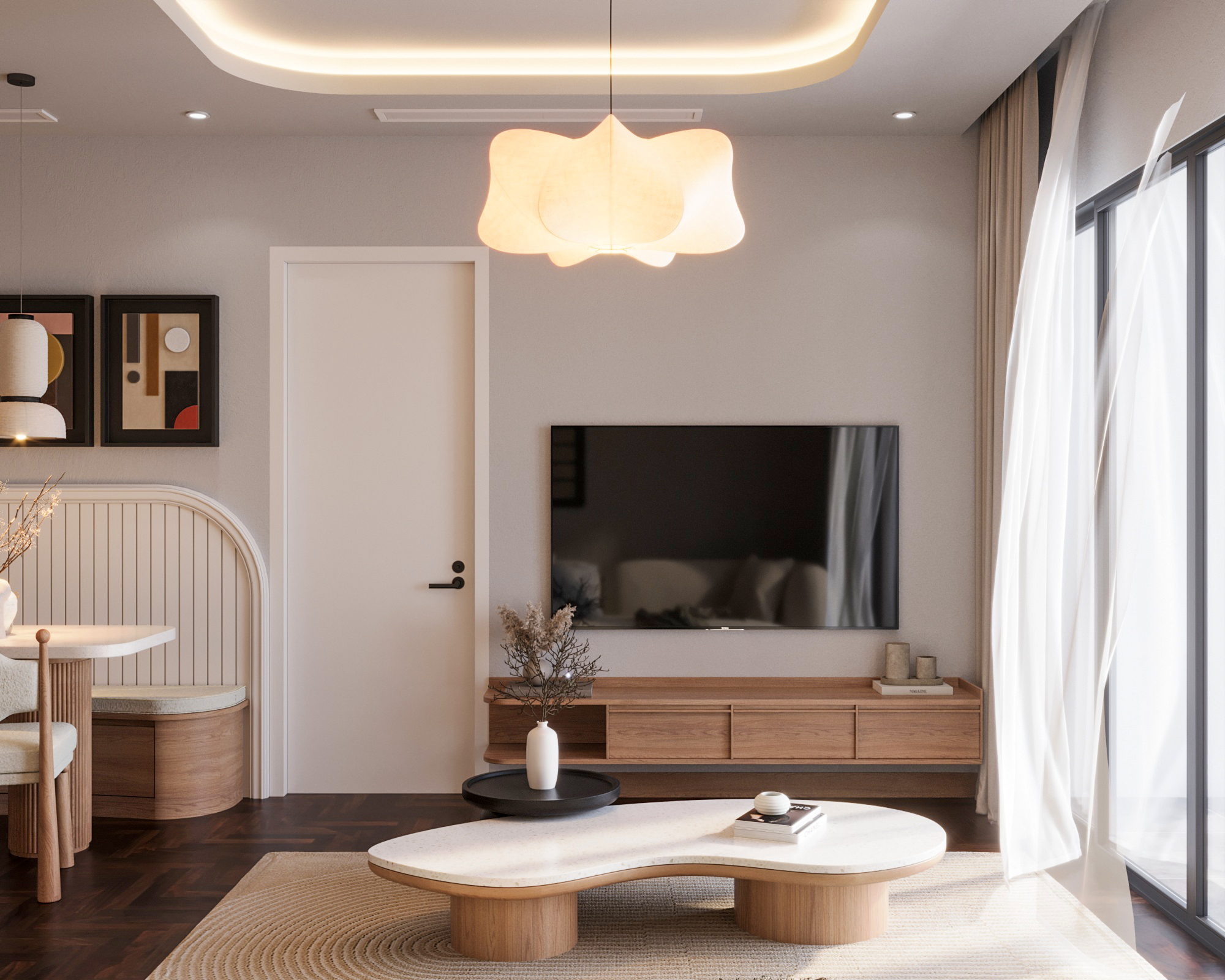 Tại phòng khách, sự êm ái được định hình qua chiếc sofa bọc vải bouclé (lông cừu) trắng mềm mại, điểm xuyết gối tựa họa tiết đen vàng cá tính. Đi cùng với đó là bàn trà đôi hình sỏi và kệ tivi treo tường tối giản, giúp giải phóng không gian sàn một cách triệt để. Dòng chảy thiết kế dẫn lối mượt mà sang khu vực bàn ăn, nơi sự quây quần được thắp lên dưới ánh đèn thả hình bông hoa cách điệu. Chiếc bàn đá terrazzo chân trụ gỗ nan dọc kết hợp cùng ghế băng bo góc tựa vào vách tường trắng tạo nên một góc nhỏ vừa nghệ thuật, vừa ấm cúng. Liền kề là gian bếp chữ I khoa học với sự phân chia màu sắc thú vị: tủ trên sơn trắng tay nắm đen gọn gàng đối thoại nhẹ nhàng với hệ tủ dưới vân gỗ sồi và mảng tường ốp gạch thẻ xám sạch sẽ.