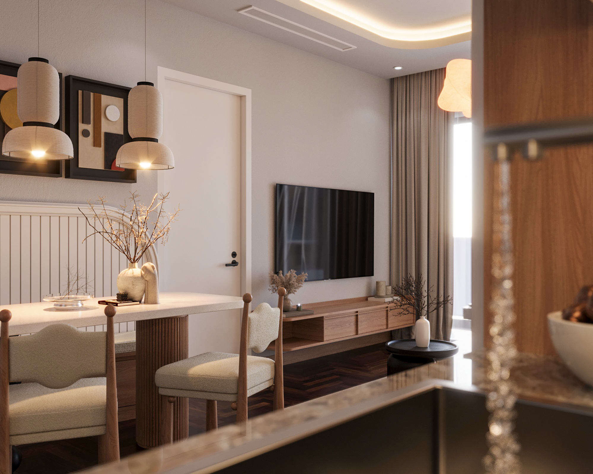 Bước vào căn hộ, thị giác ngay lập tức được neo giữ bởi sự tương phản đầy tinh tế giữa lớp nền vững chãi của sàn gỗ xương cá tông nâu trầm và bảng màu trung tính tươi sáng bao phủ không gian. Phong cách hiện đại hòa quyện cùng tinh thần Japandi được thể hiện rõ nét qua cách phối hợp giữa sắc trắng kem, xám hiệu ứng bê tông và hơi thở mộc mạc của gỗ tự nhiên.