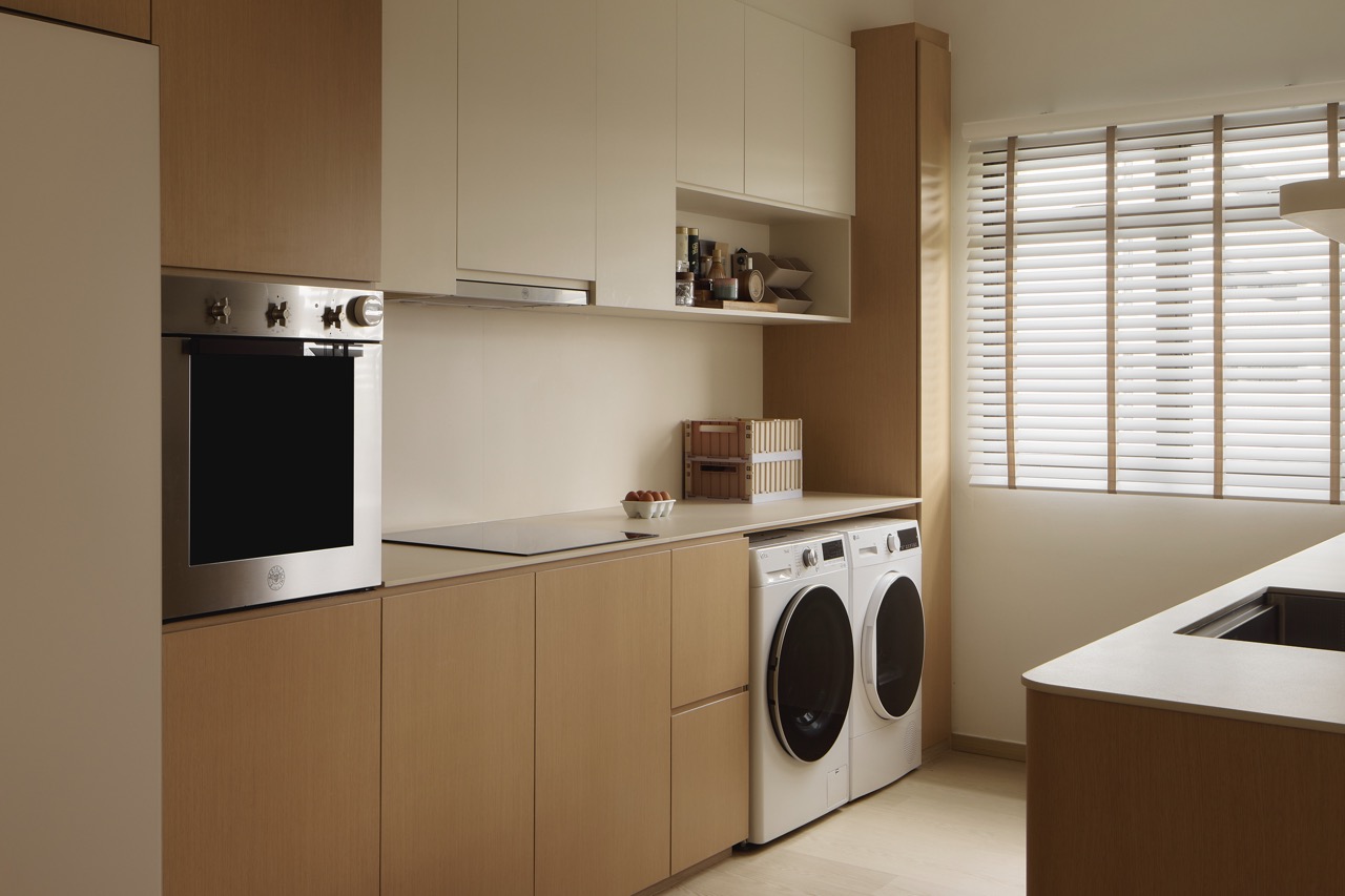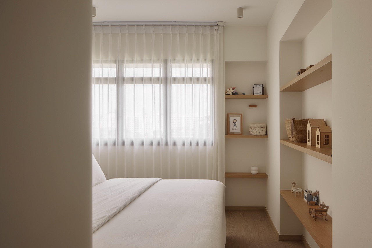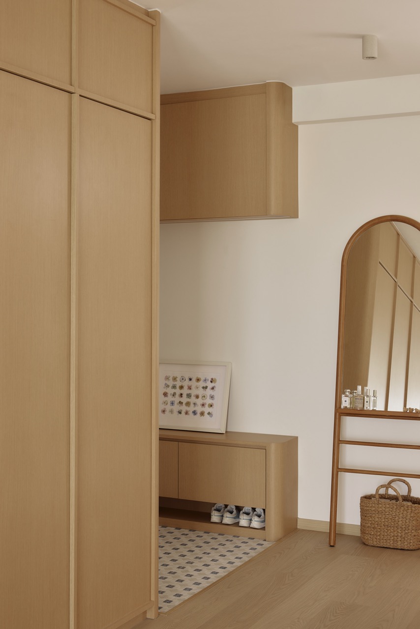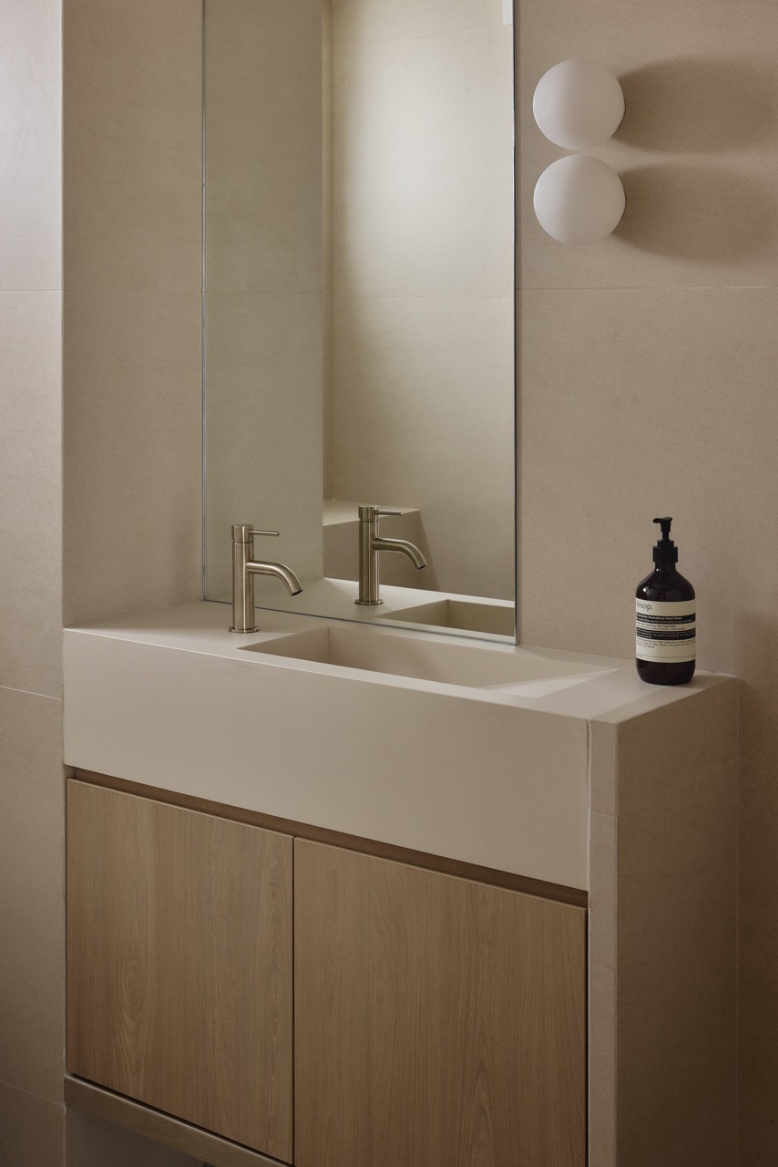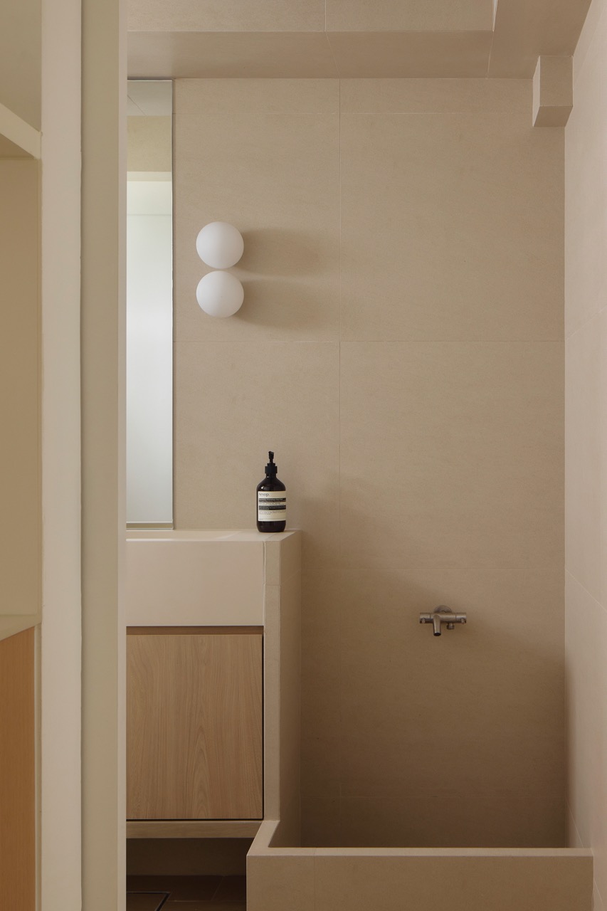 Sự mạch lạc trong ngôn ngữ thiết kế còn thể hiện rõ nét ở gian bếp chữ I gọn gàng. Tại đây, công năng được đẩy lên tối đa với máy giặt sấy tích hợp khéo léo dưới hệ tủ gỗ, đối trọng hài hòa với hệ tủ trên màu kem phẳng lì. Không gian nghỉ ngơi và thư giãn cũng tuân thủ triệt để triết lý “ít là nhiều”: phòng ngủ lược bỏ tủ kệ cồng kềnh để nhường chỗ cho những hốc tường âm (niche) tinh tế và rèm voan trắng rủ nhẹ; trong khi phòng tắm mang đậm chất spa tại gia với gạch ốp màu be đồng bộ và thiết bị đúc liền khối. Từ khu vực sảnh đệm lát gạch bông họa tiết đến gương soi dáng vòm, mọi chi tiết đều được chăm chút để kiến tạo nên một tổ ấm vừa chặt chẽ về công năng, vừa là chốn nuôi dưỡng cảm xúc bình yên cho gia chủ.