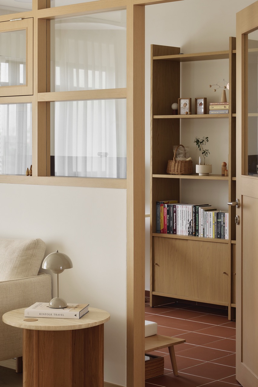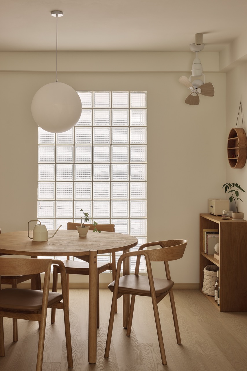Điểm nhấn kiến trúc đắt giá nhất nằm ở vách ngăn gỗ kết hợp các ô kính trong suốt tại phòng khách – một ranh giới “mềm” đầy thông minh. Nó vừa định hình không gian riêng tư cho góc làm việc lát gạch đỏ terracotta cá tính phía sau, vừa giữ được sự kết nối thị giác thoáng đạt với khu vực sinh hoạt chung lát sàn gỗ ấm áp. Mạch cảm xúc bình yên tiếp tục dẫn lối sang phòng ăn, nơi ánh sáng tự nhiên được “nghệ thuật hóa” qua mảng tường gạch kính (glass block), tỏa rạng xuống bộ bàn tròn mềm mại và chiếc đèn thả hình cầu tối giản.