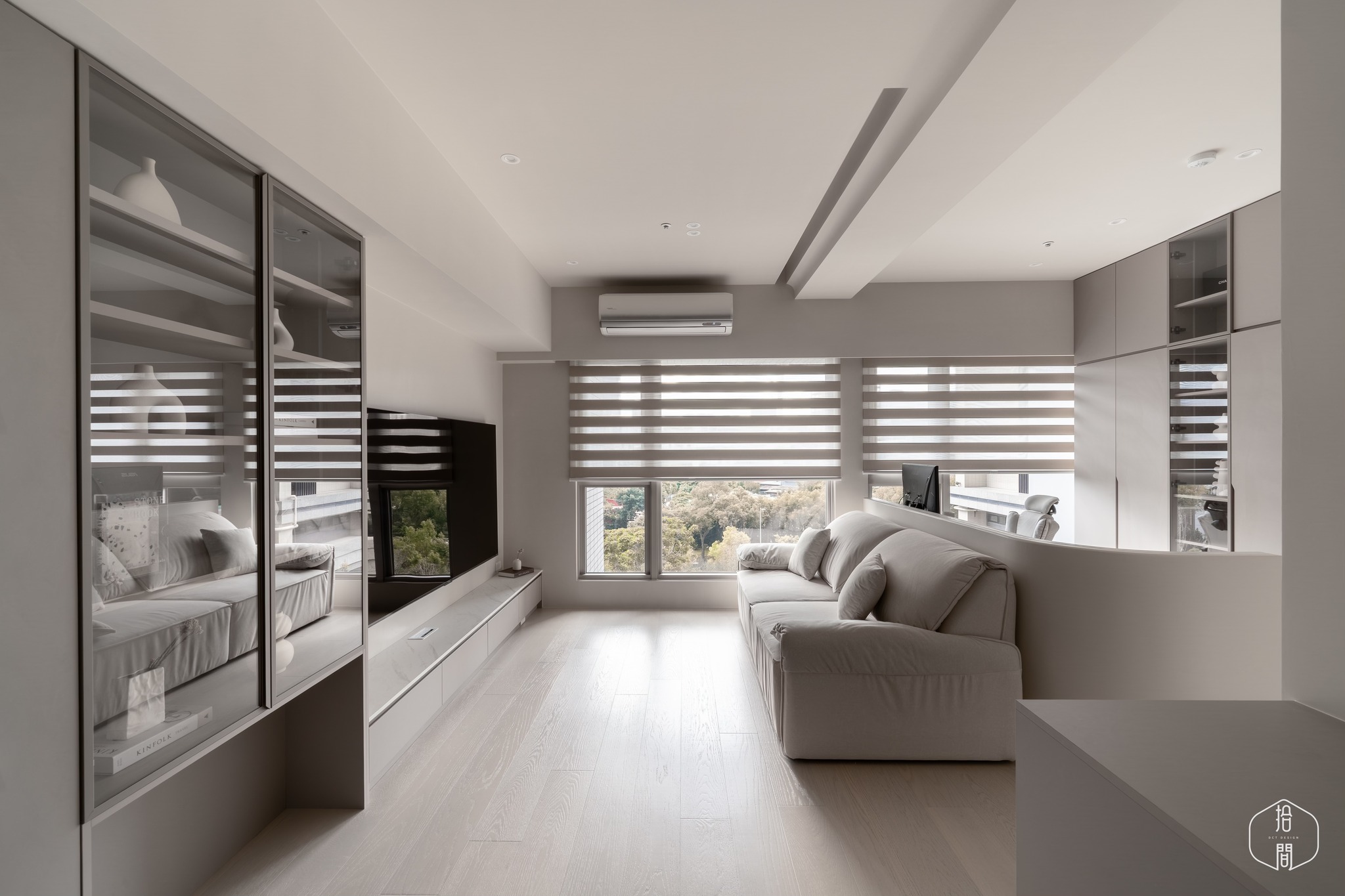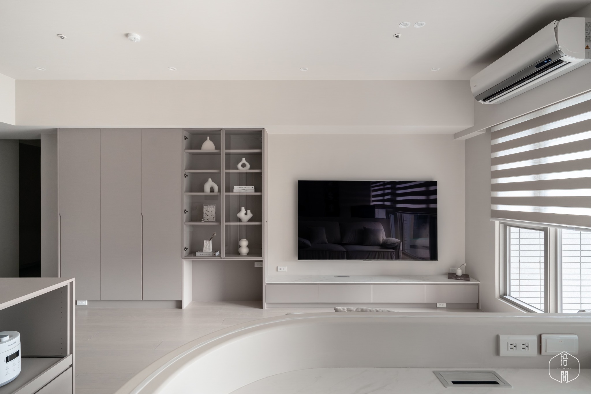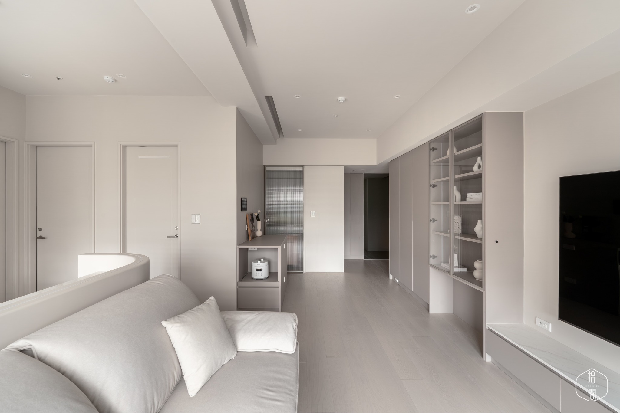 Ẩn giấu để thanh lọc thị giác: Điểm nhấn thông minh nằm ở hệ tủ lưu trữ khổng lồ mang tông màu trà sữa, giúp cất giấu toàn bộ vật dụng tạp nhạp, trả lại một bề mặt thị giác gọn gàng và thuần khiết.