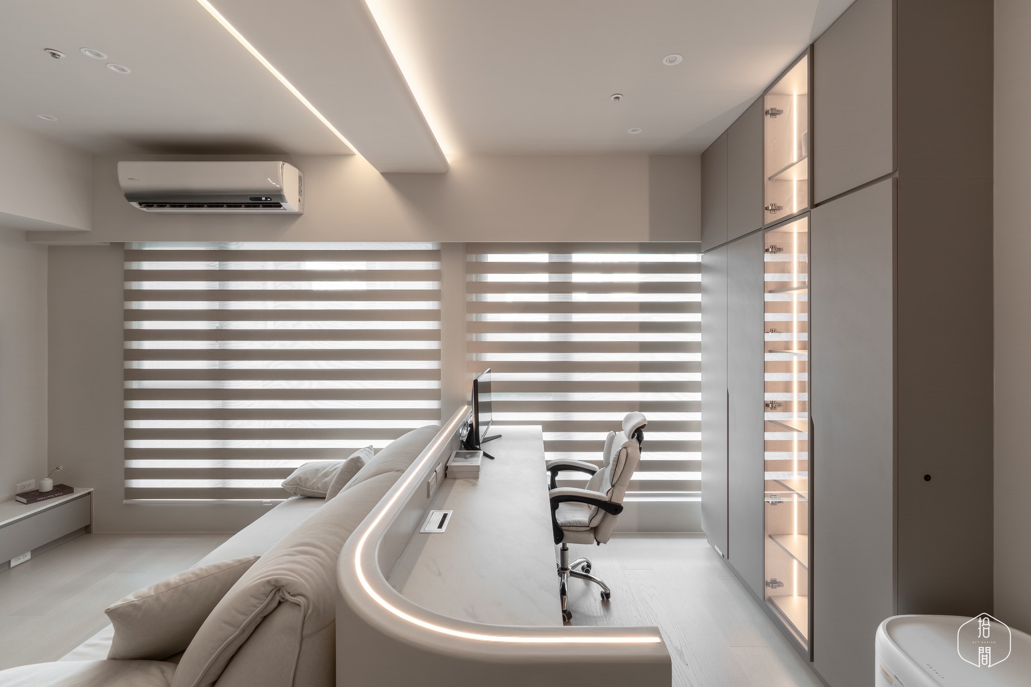 Ranh giới mềm mại: Bức tường lửng ngăn cách phòng làm việc được tạo hình bằng những đường cong chuyển tiếp duyên dáng và tích hợp liền mạch với mặt bàn. Những góc vuông sắc nhọn đã được xử lý thành các góc bo tròn góc R mượt mà. Quyết định này không chỉ nâng tầm sự tinh tế cho thị giác mà còn là một sự tính toán đầy cẩn trọng nhằm đảm bảo an toàn tối đa trong sinh hoạt hàng ngày.