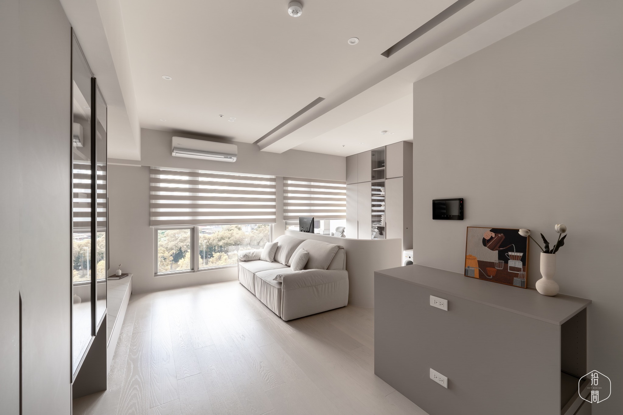 Ánh sáng tự nhiên làm chủ đạo: Ánh sáng mặt trời xuyên qua lớp rèm cuốn mờ ảo, đan xen cùng bố cục mở để hình thành nên một khu vực chung bừng sáng và vô cùng dễ chịu.