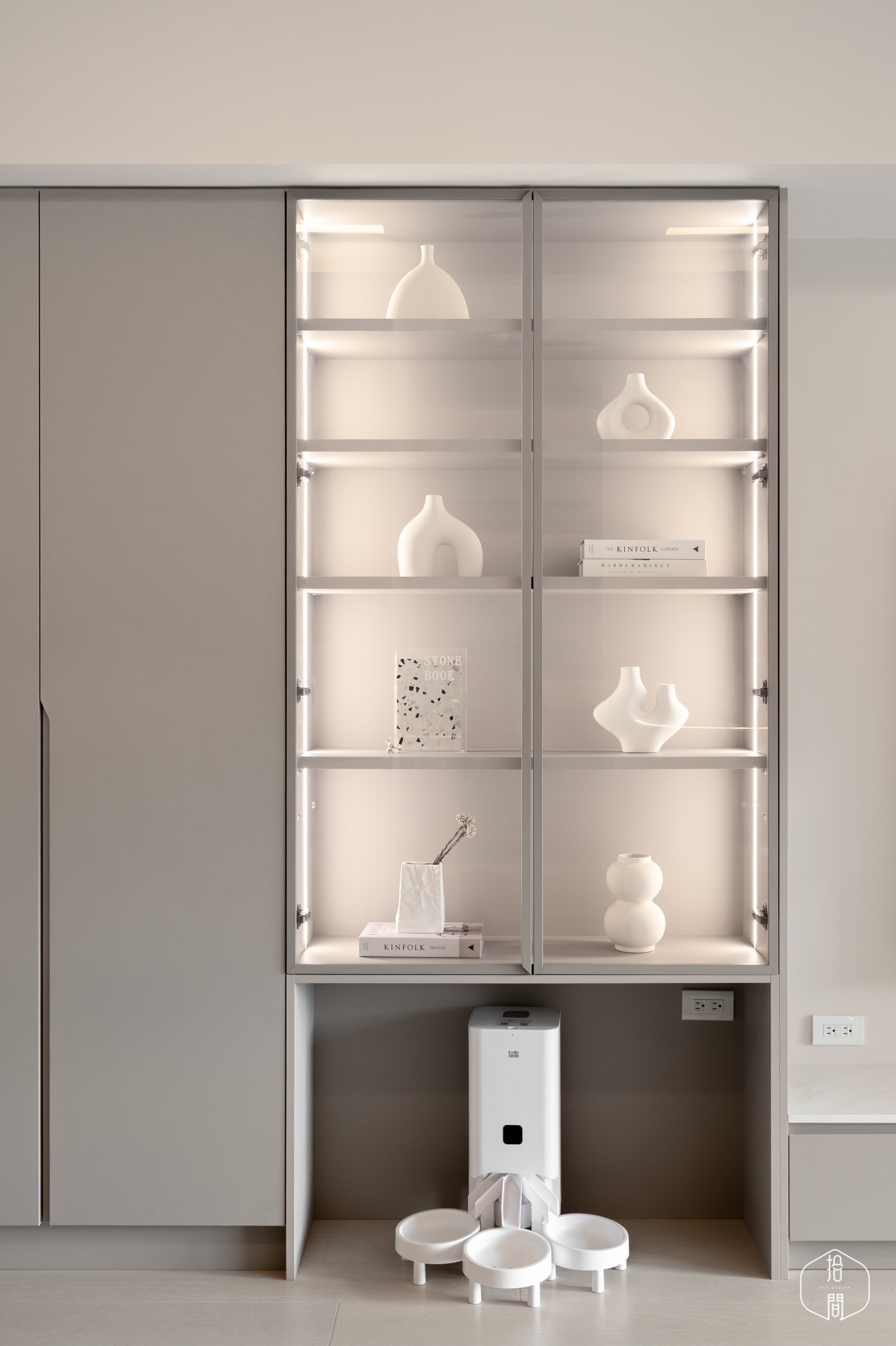 Một tổ ấm hoàn hảo là nơi mọi thành viên đều được chăm sóc tỉ mỉ. Ngay phía dưới hệ tủ phòng khách, một khoảng lõm sâu đã được thiết kế riêng biệt để đặt vừa vặn máy cho mèo ăn tự động. Vị trí chiến lược này không hề cản trở lối đi lại, đồng thời biến góc dùng bữa của thú cưng trở nên ngăn nắp, kín đáo và mang đậm tính nghi thức đáng yêu.