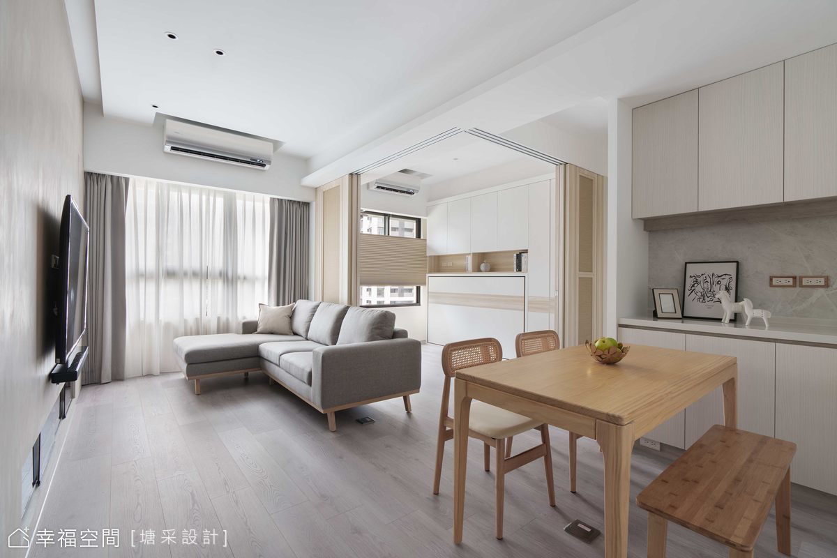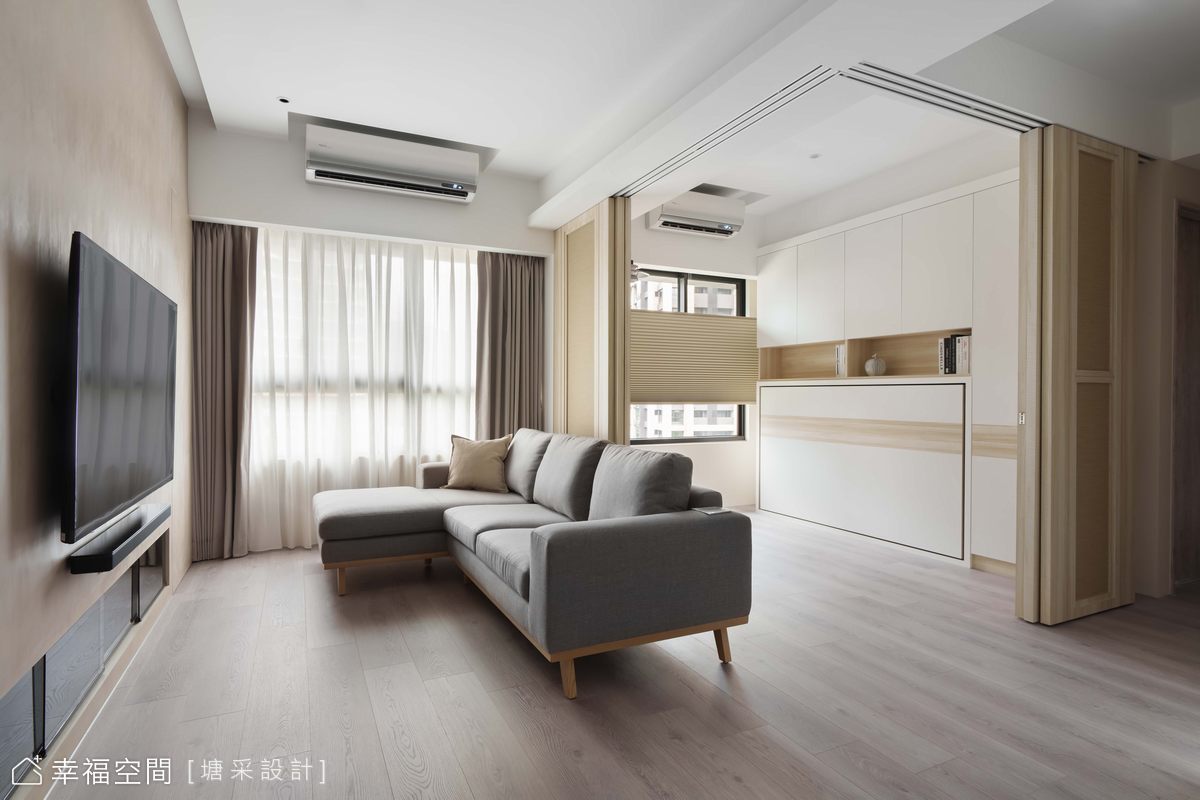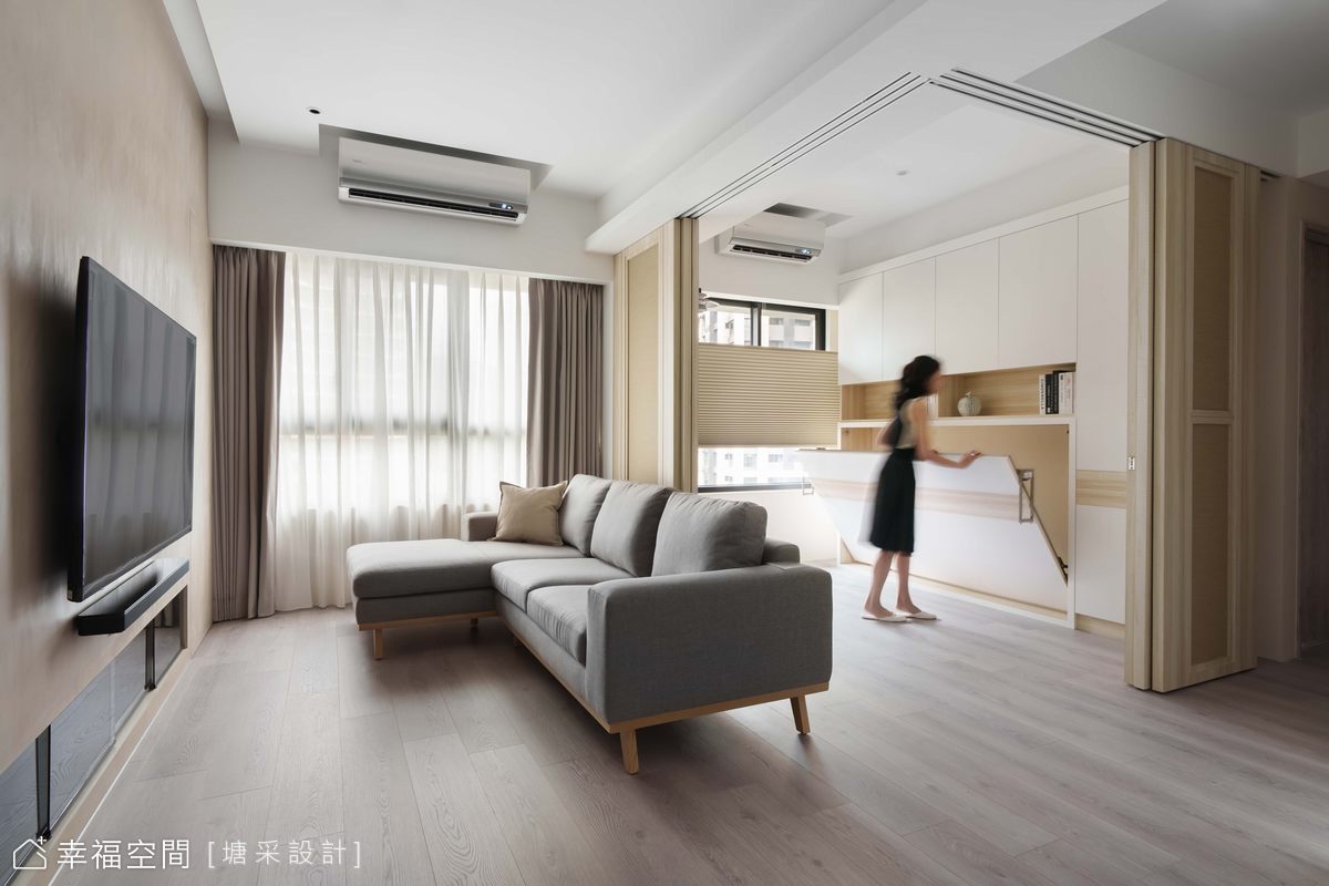 Việc sử dụng hệ cửa lùa gỗ để ngăn cách phòng đa năng là một giải pháp kiến trúc đầy tinh tế. Không gian này có khả năng thay đổi chức năng tùy theo nhu cầu: